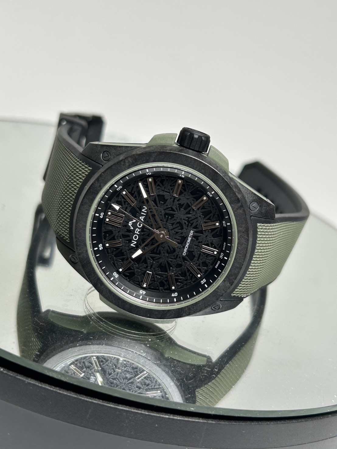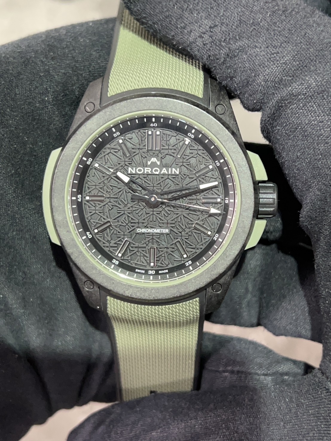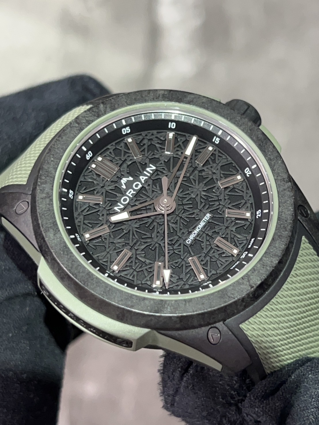ブライトリング出身のベン・カッファーが2018年に創業した、スイスの新鋭ウォッチブランドであるノルケイン、今回は同ブランドのワイルドワン カーボンに似たケースは独自のカーボン複合素材NORTEQ®(ノルテック)となっており、スチールの約1/6、チタンの約1/3という軽さに加え、200m防水と高スペックなスポーツウォッチとなっております。