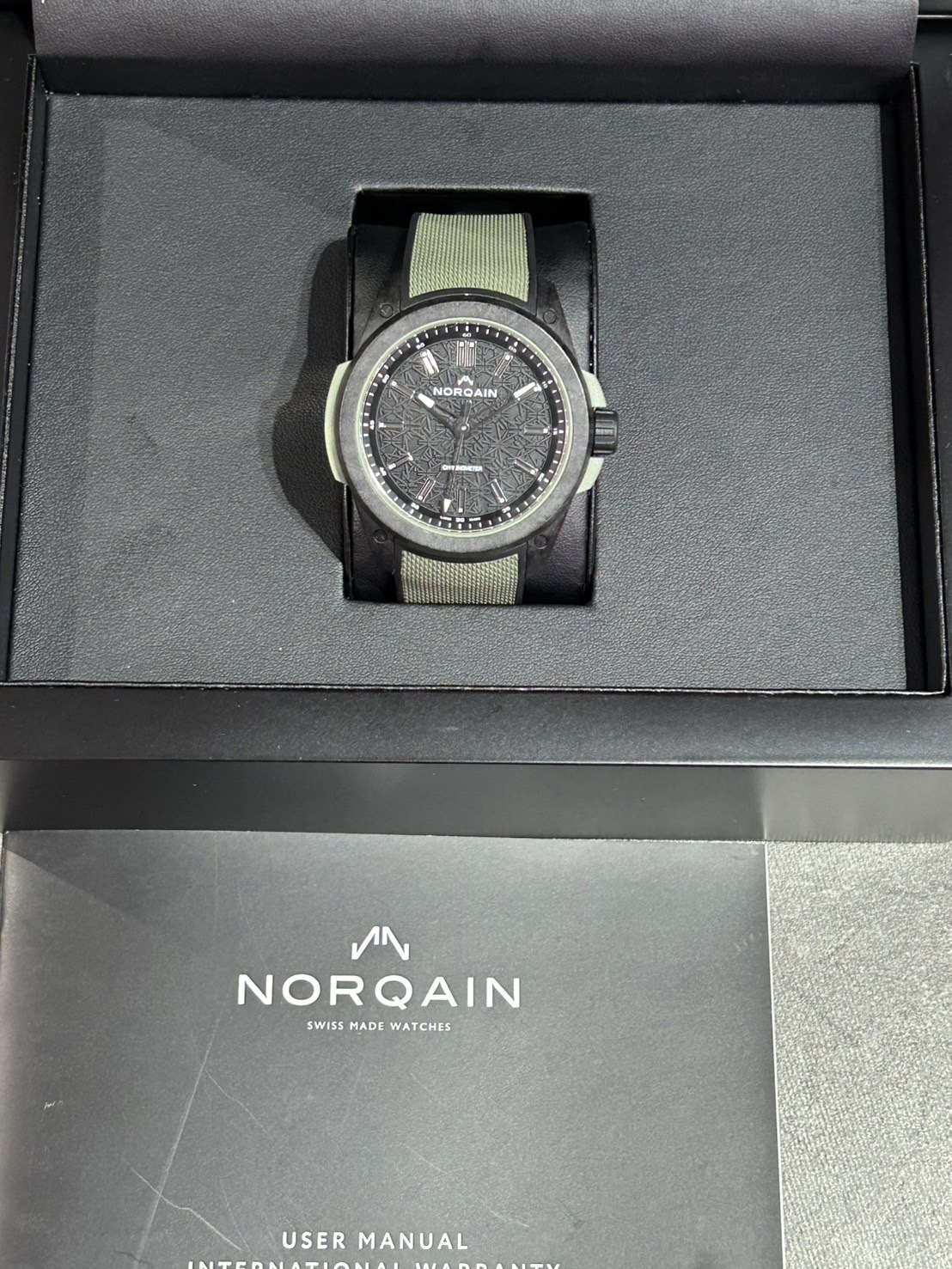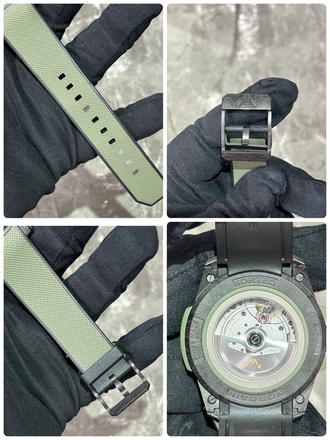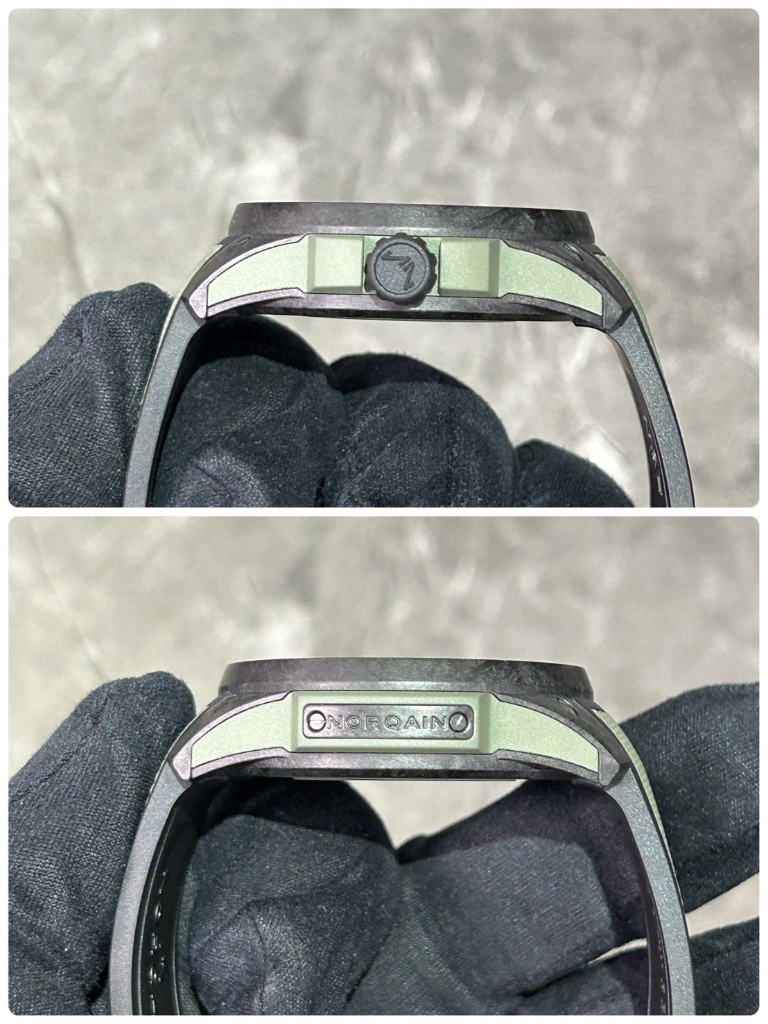 ブライトリング出身のベン・カッファーが2018年に創業した、スイスの新鋭ウォッチブランドであるノルケイン、今回は同ブランドのワイルドワン カーボンに似たケースは独自のカーボン複合素材NORTEQ®(ノルテック)となっており、スチールの約1/6、チタンの約1/3という軽さに加え、200m防水と高スペックなスポーツウォッチとなっております。