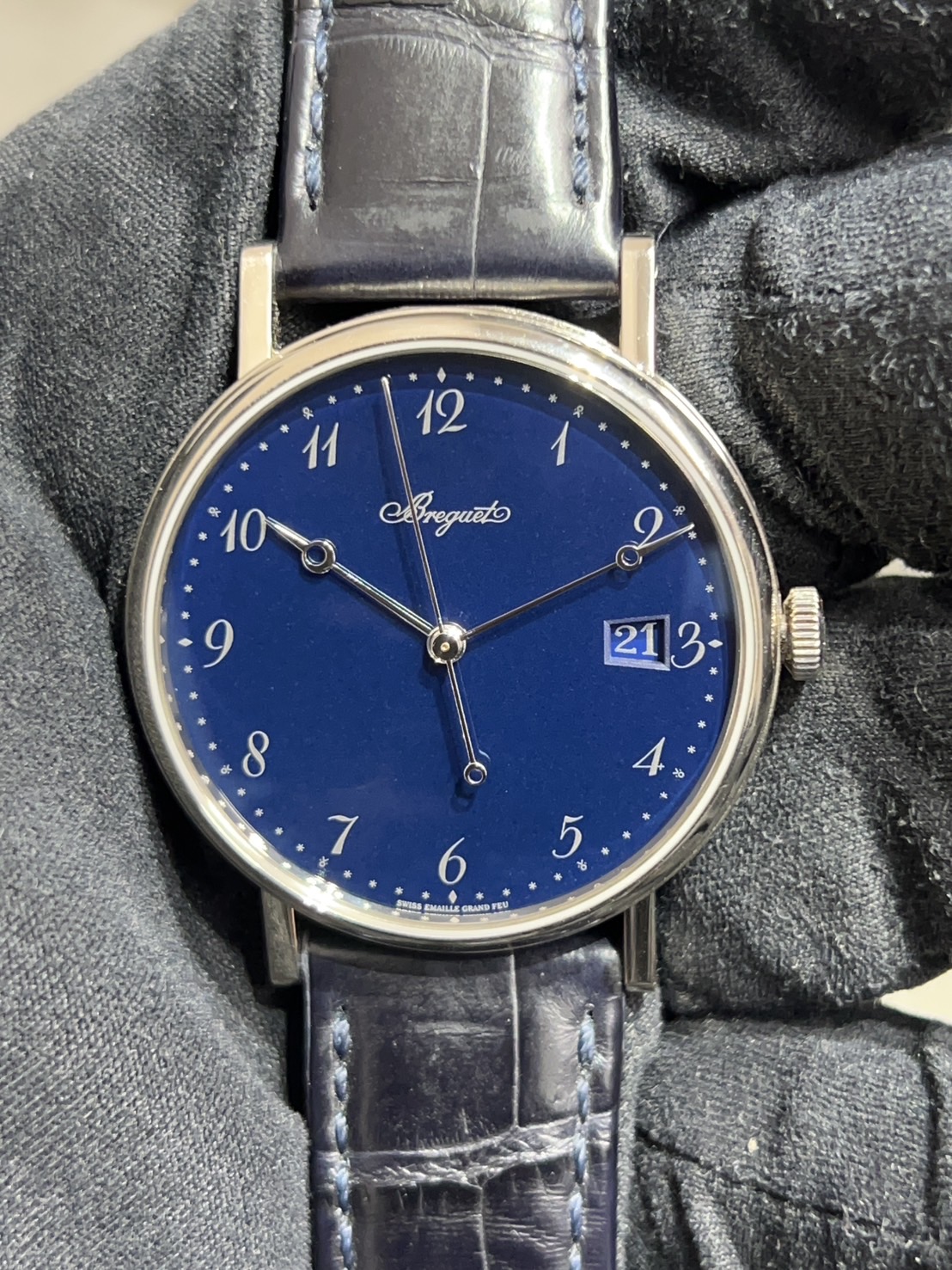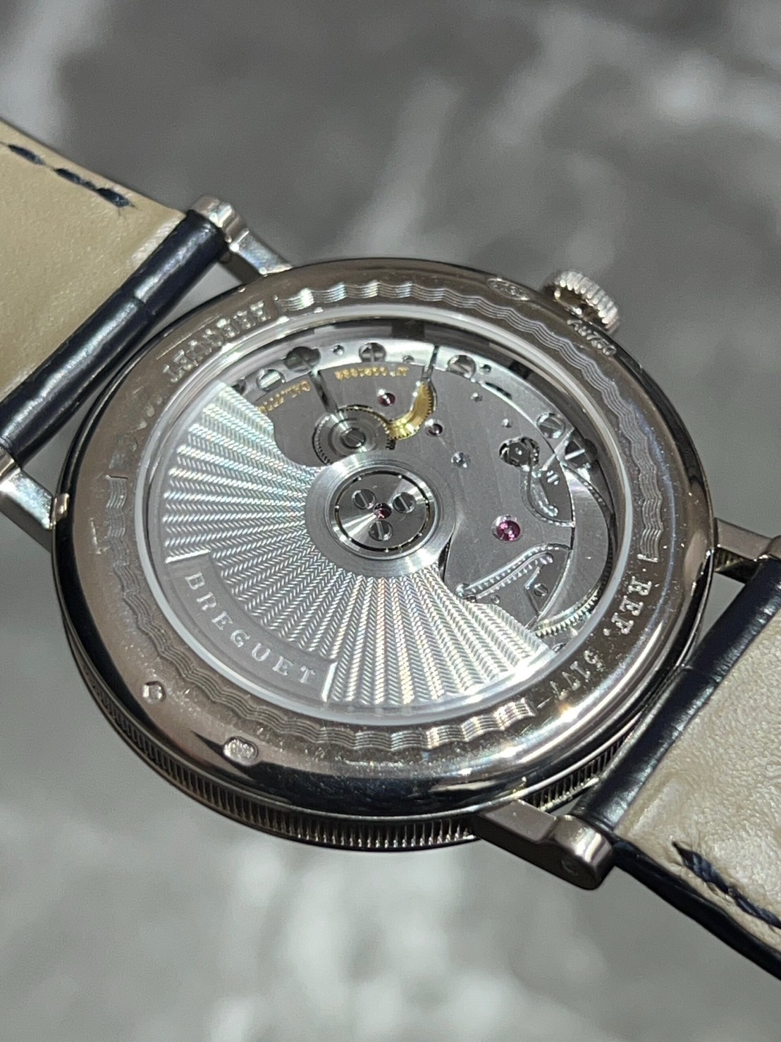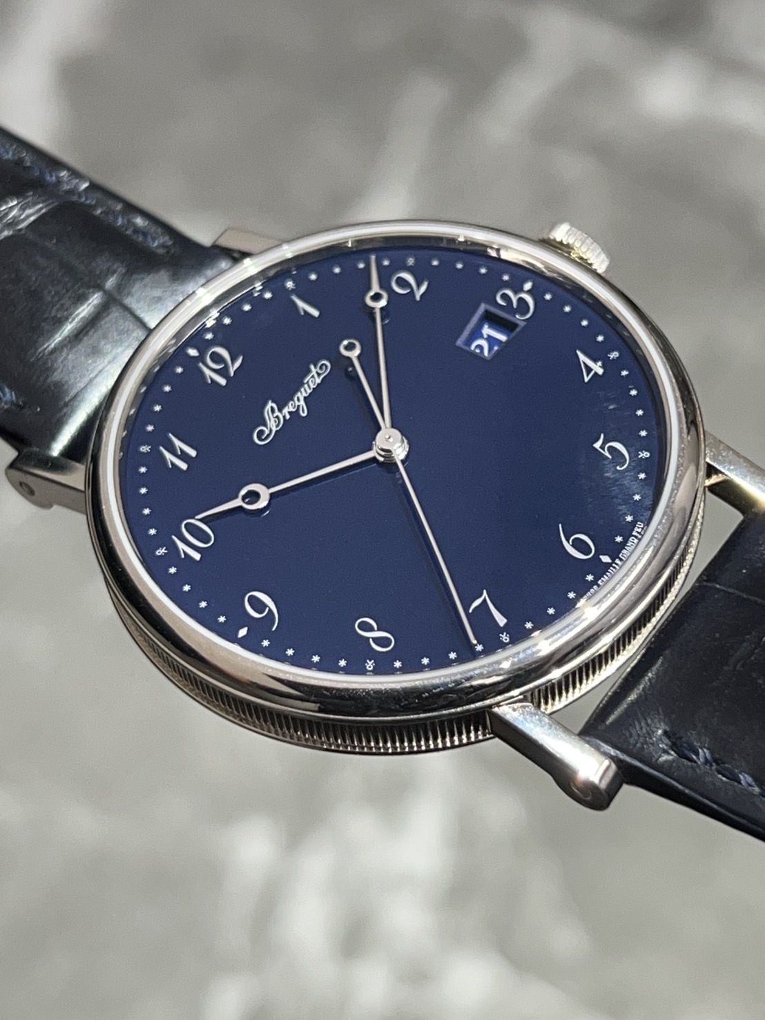 文字盤はグラン・フー仕上げのブルーエナメルとなり独特の質感が印象的で印字されるブレゲ数字が工芸品としての美しさを引き立てており、特徴的な「アップルハンド」のブレゲ針、ケースサイドのコインエッジなどブレゲらしさをふんだんに取り入れ、ホワイトゴールドケースで高級感のあるモデルとなっております。