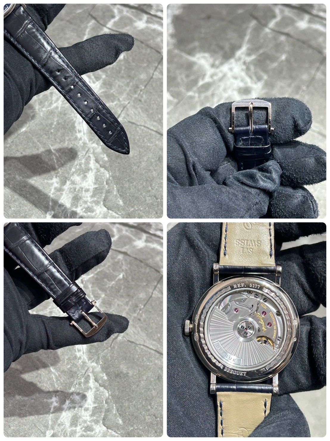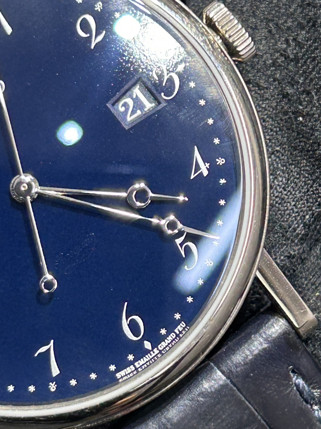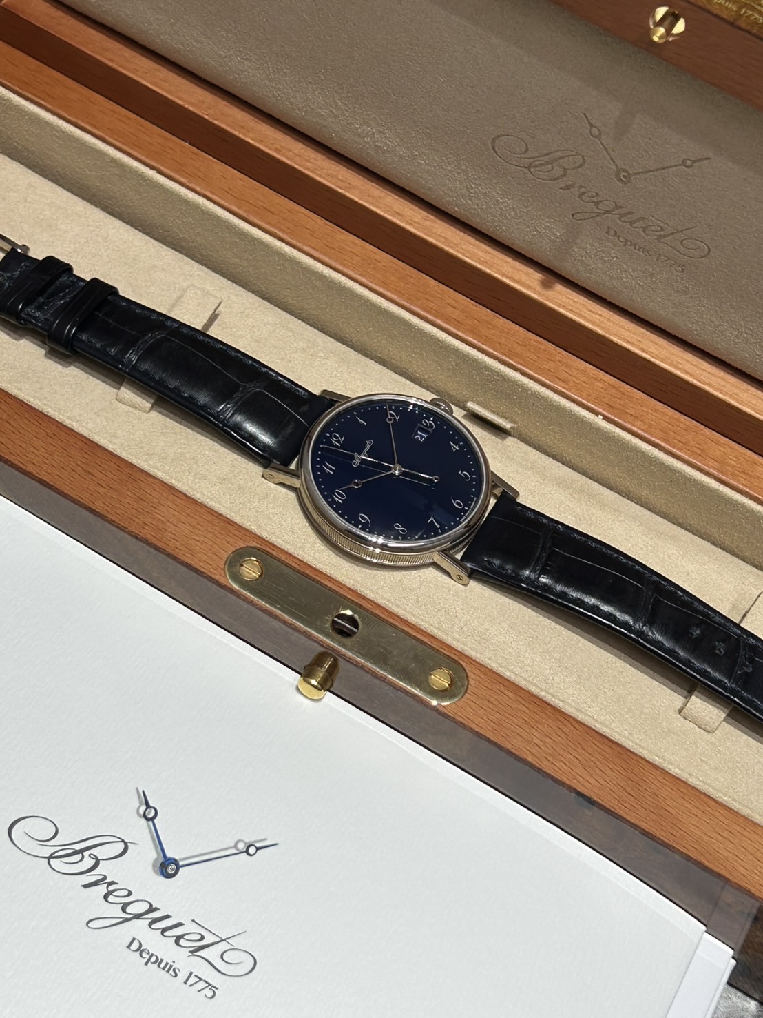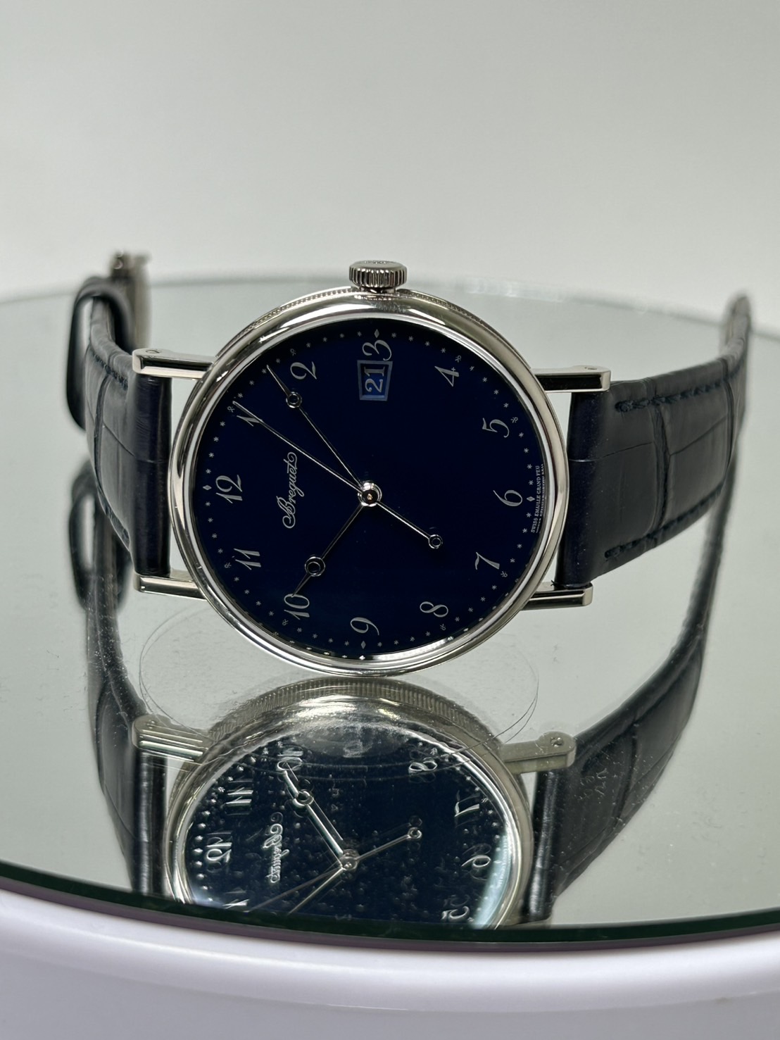 文字盤はグラン・フー仕上げのブルーエナメルとなり独特の質感が印象的で印字されるブレゲ数字が工芸品としての美しさを引き立てており、特徴的な「アップルハンド」のブレゲ針、ケースサイドのコインエッジなどブレゲらしさをふんだんに取り入れ、ホワイトゴールドケースで高級感のあるモデルとなっております。