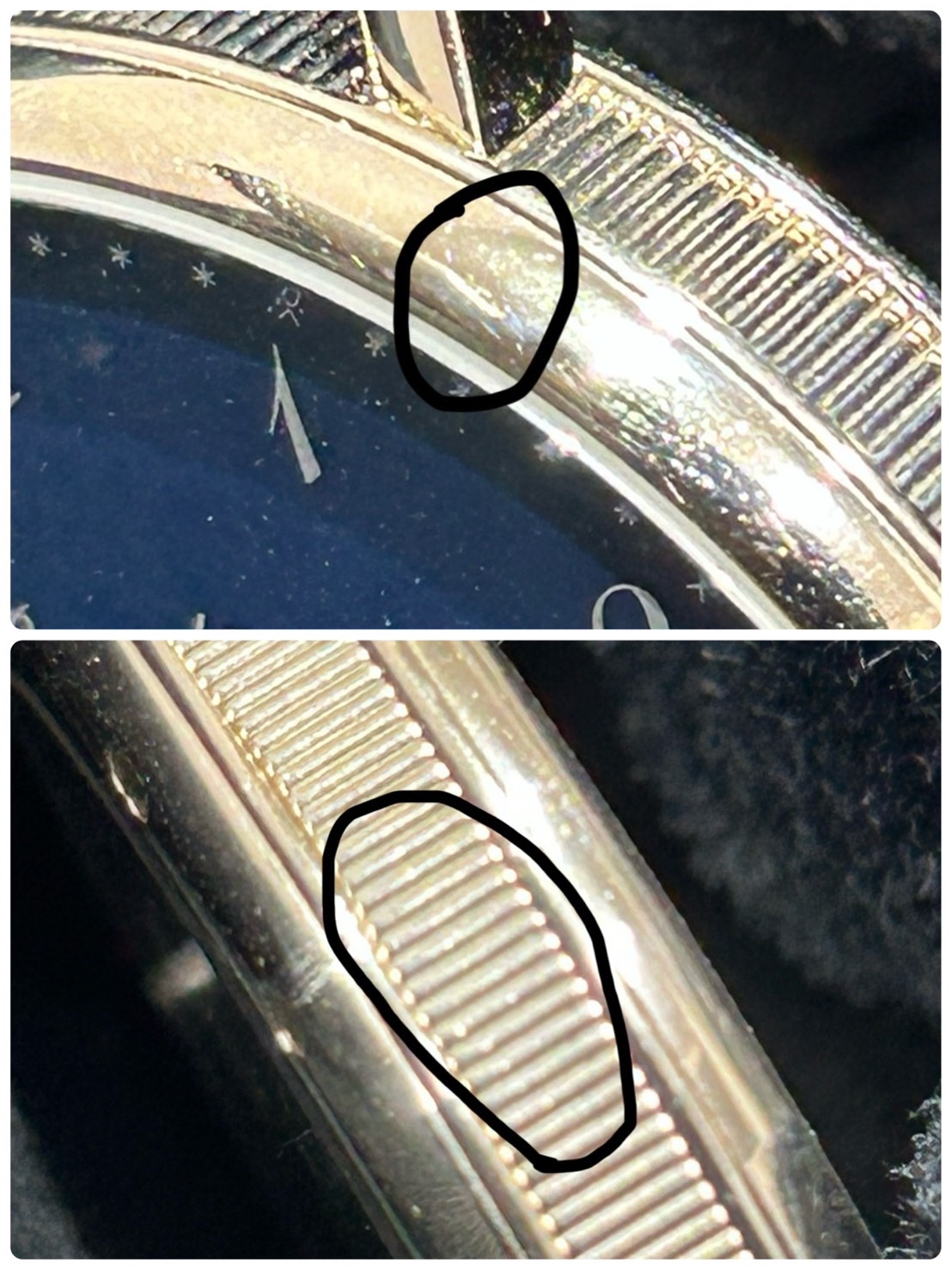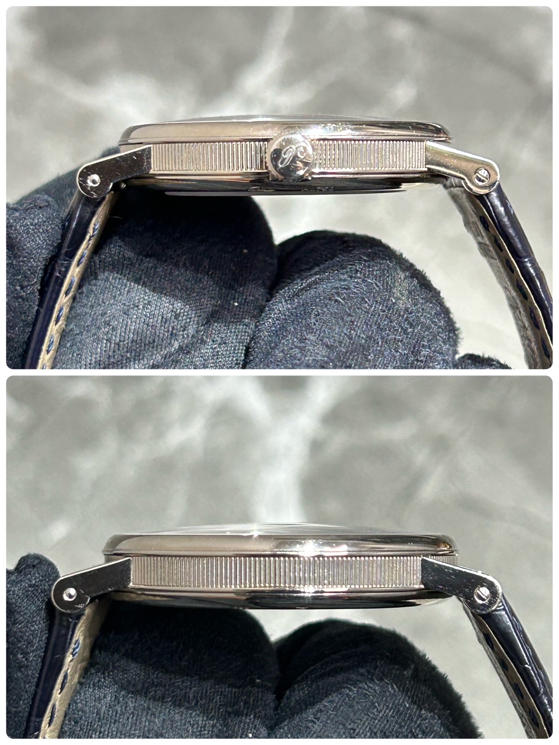 2時側ベゼル、ケースサイドに強い光に当てれば分かるスレがありますが(最後の写真参照)それ以外特記すべき傷もなく微細なスレが僅かにある程度になりますので中古美品での販売となります。アリゲーターストラップは若干の使用感がありますがまだまだご愛用頂けるコンディションとなっております。