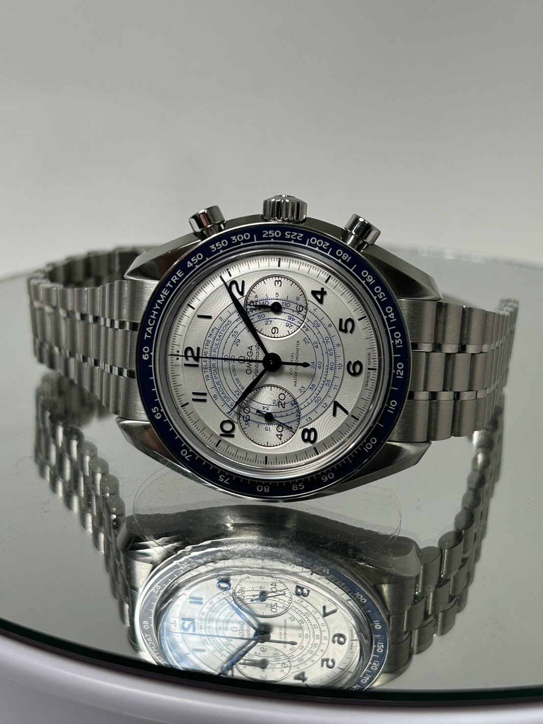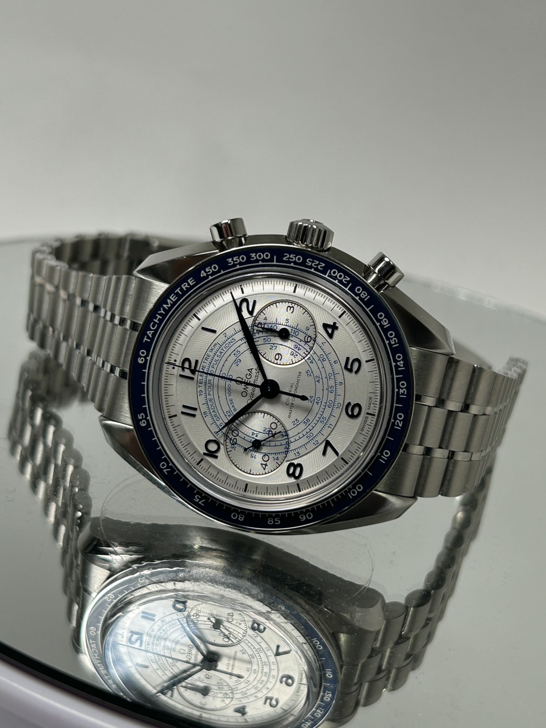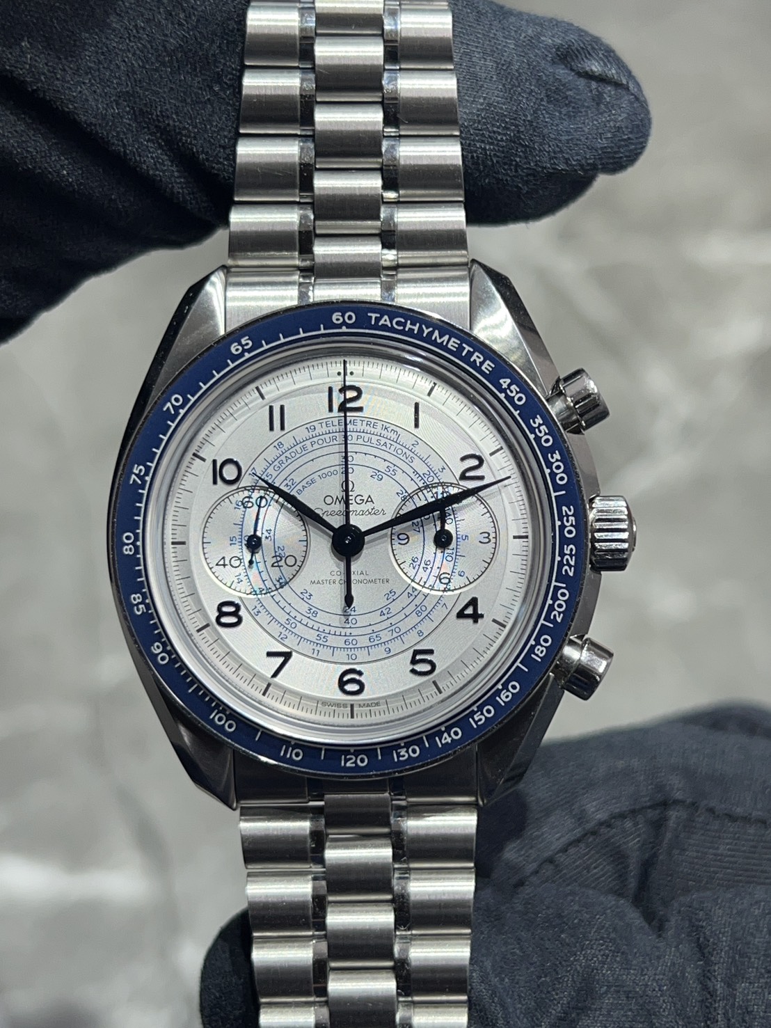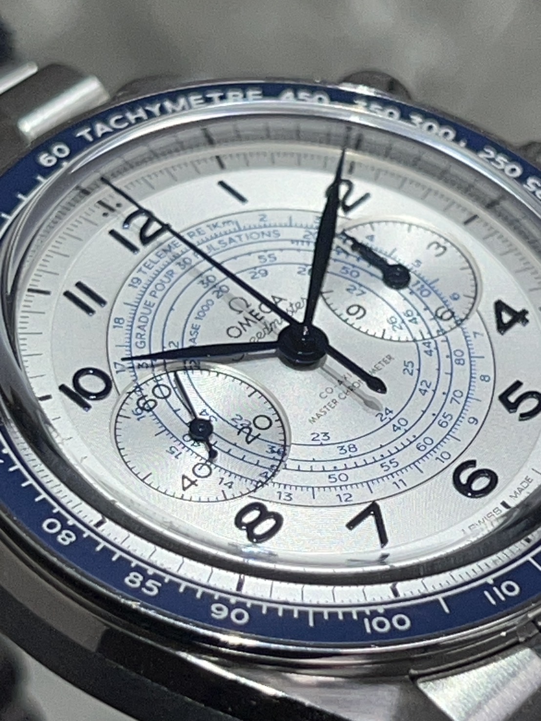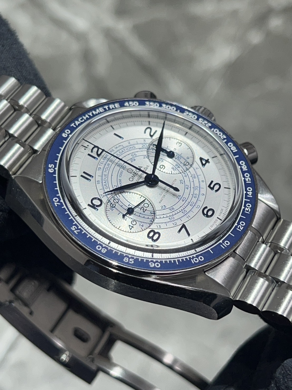 タキメーター、テレメーター、パルスメーターの3つのスケールを備えたシルバーとブルーのコントラストがカッコイイスピードマスター クロノスコープが入荷致しました。