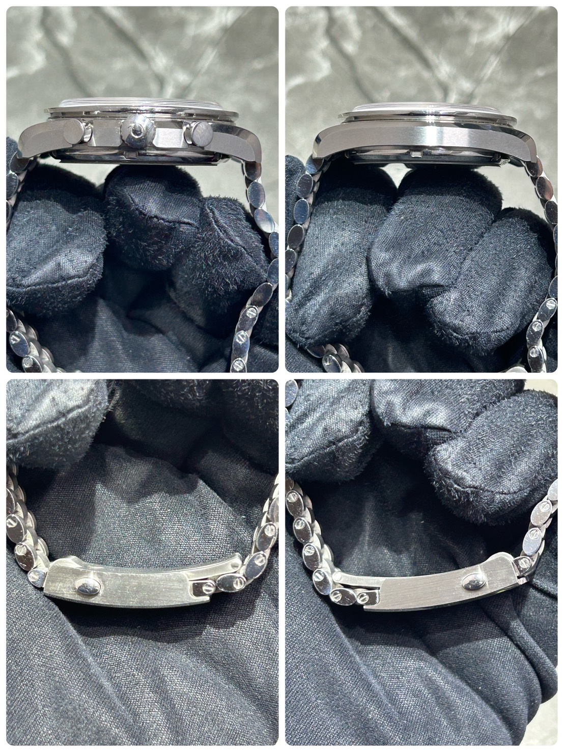 インデックス、針は光沢のあるブルーとなりタキメーターが記されたベゼルも陽極酸化処理を施したブルーのアルミニウム製となります。