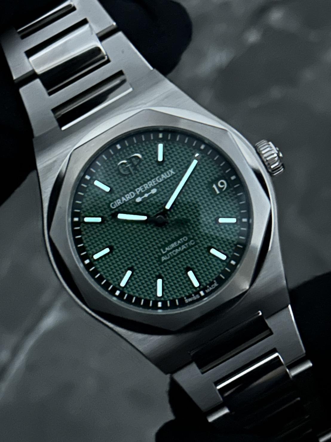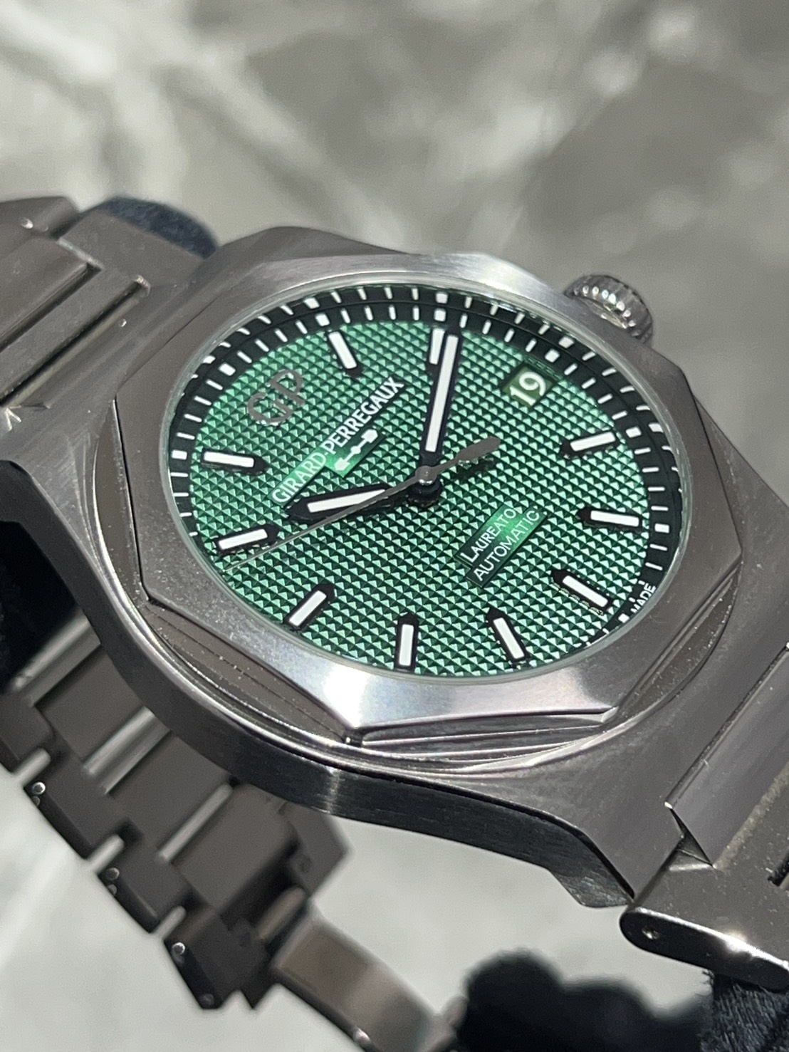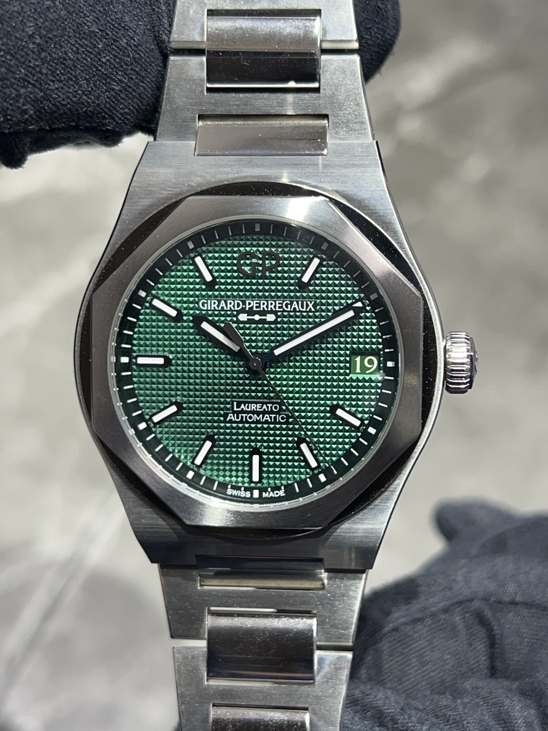 今回は同ブランドの代表作であるグリーン文字盤に大聖堂の天蓋がモチーフとなっている円形と八角形を組み合わせたベゼルが特徴的なロレアート、クルドパリ装飾が施されることにより様々な角度から陰影が生まれ鮮やかなグリーンから深いグリーンまで美しい変化を楽しめるモデルが入荷致しました。