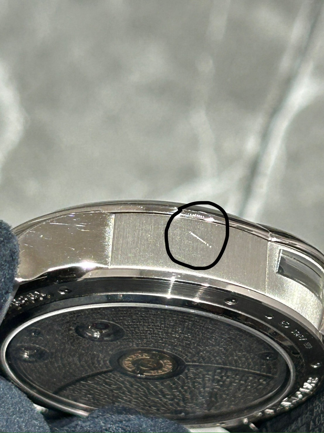 ご愛用に伴う微細なスレが全体的にございます。ケースサイドに角度によって確認できる線傷が見られますが(最後の写真参照)全体的なコンディションはいい個体でございます。