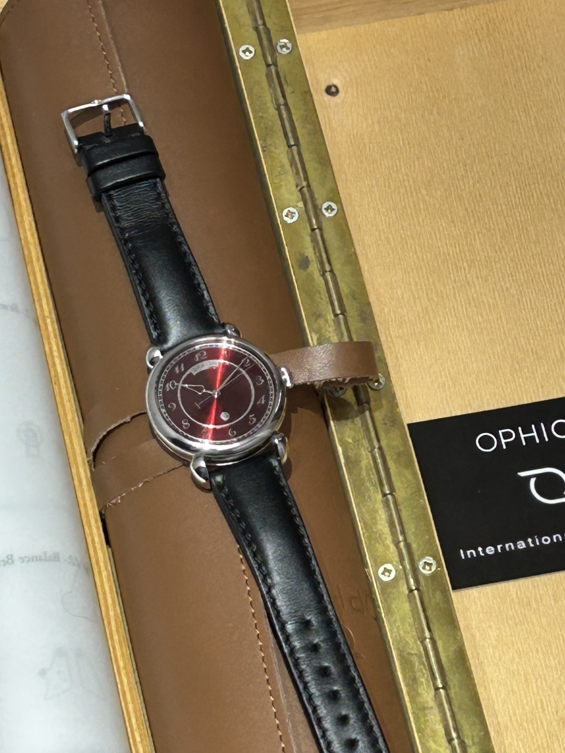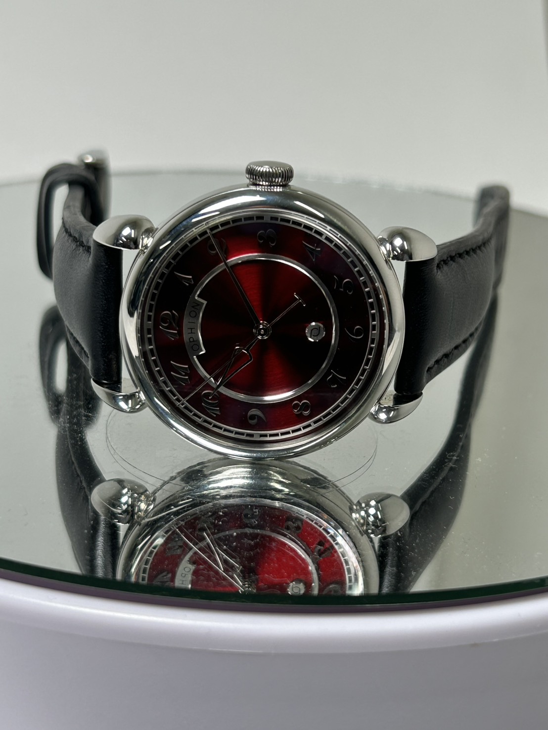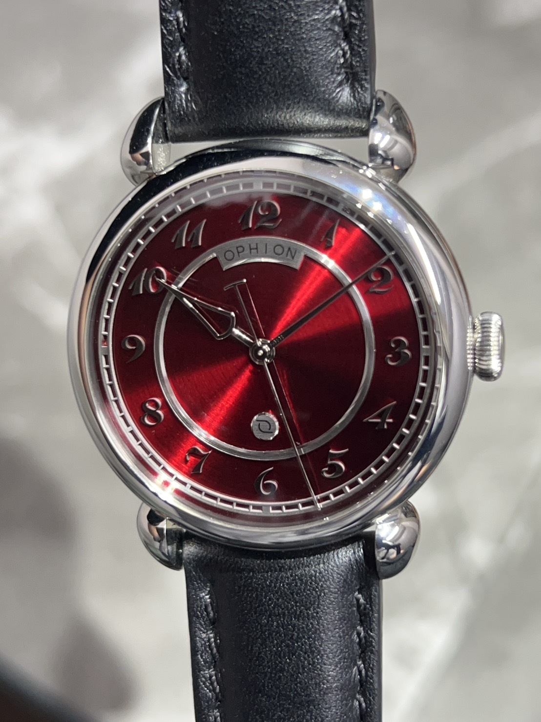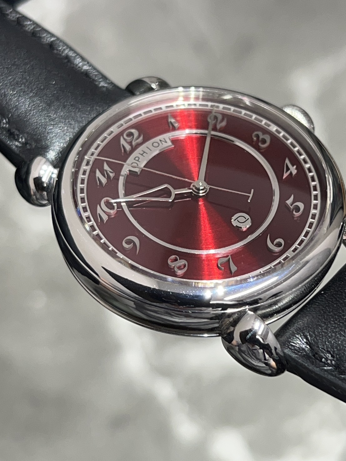 OPHIONはスペイン発のブランドとなり、品名のVELOSは「矢」を意味し、時針がまさにそれとなっており文字盤は美しいレッドとなっておりインデックスは立体的な植字タイプとなっておりティアドロップ形状のラグも印象的となっております。