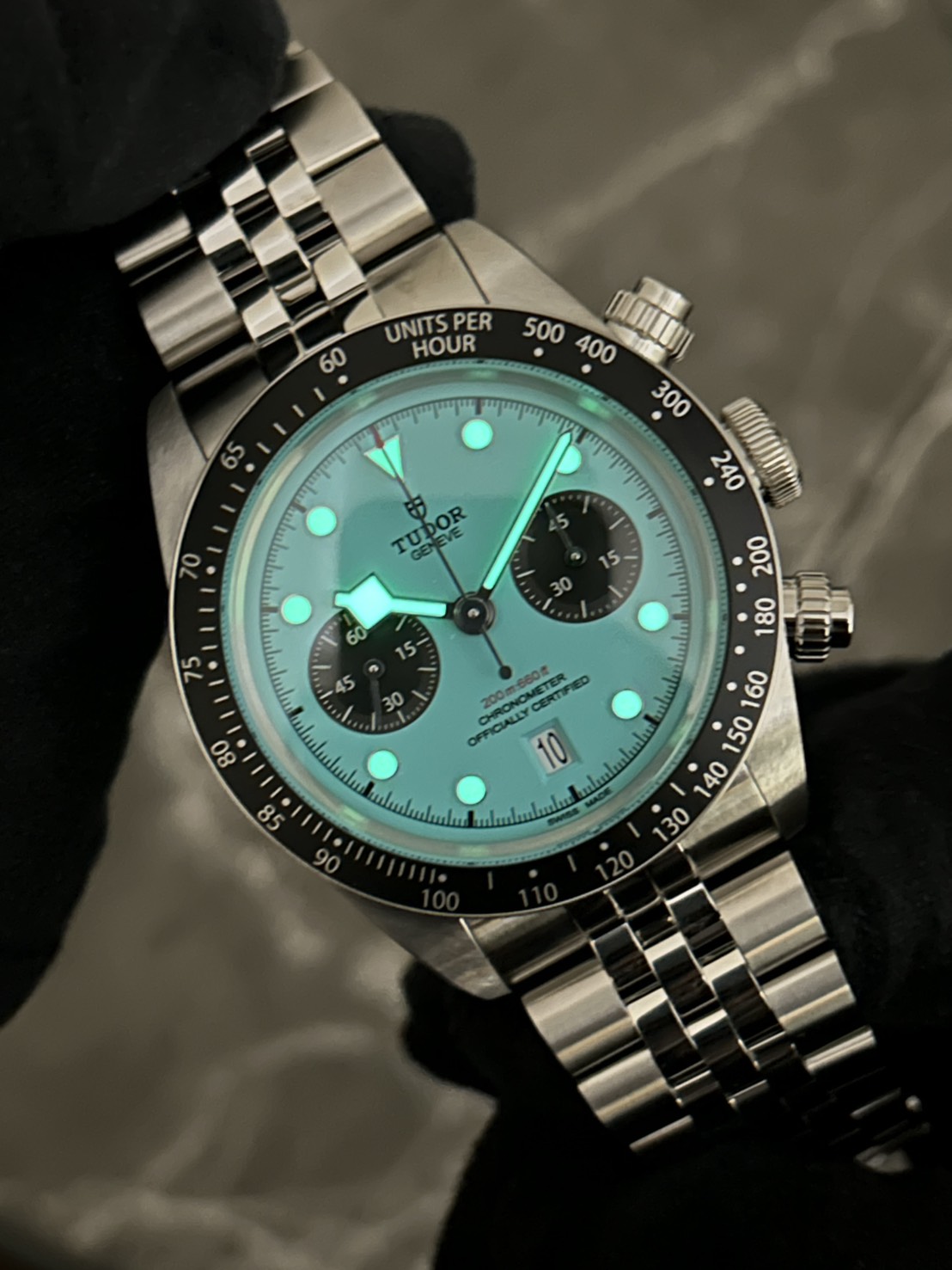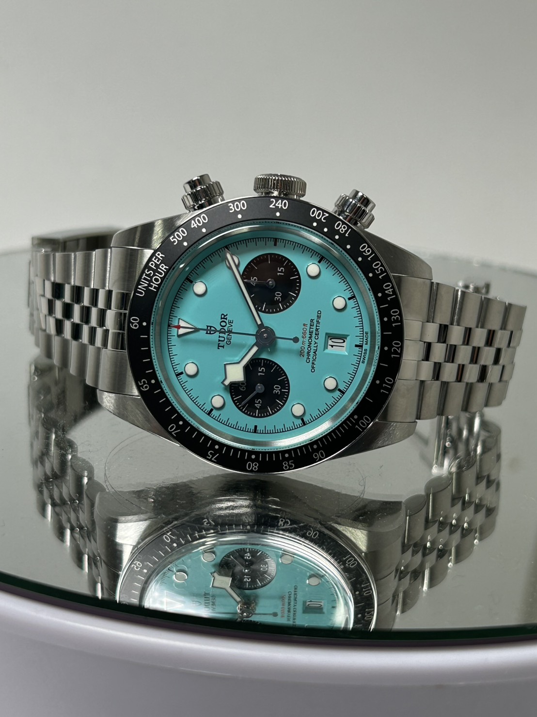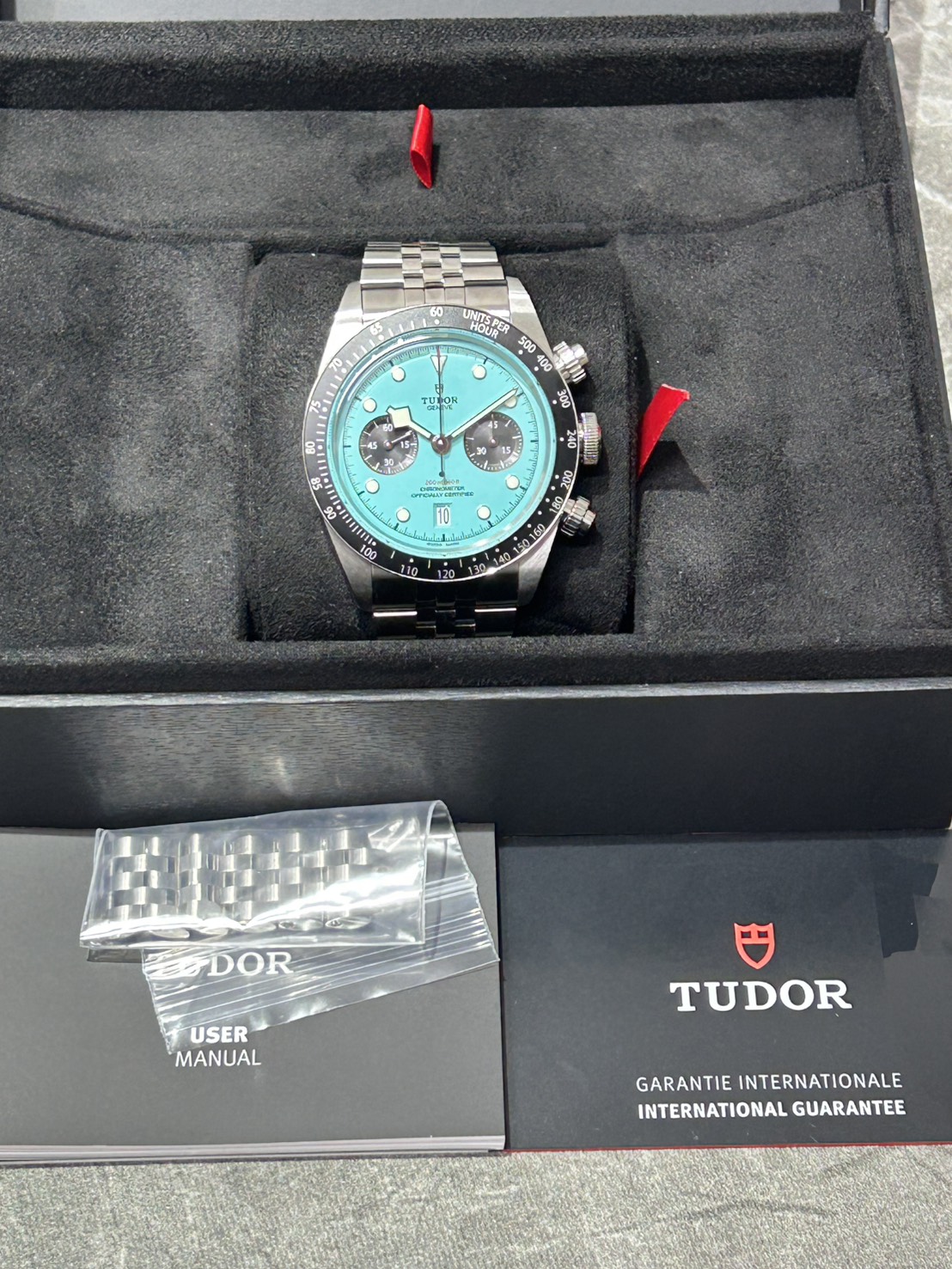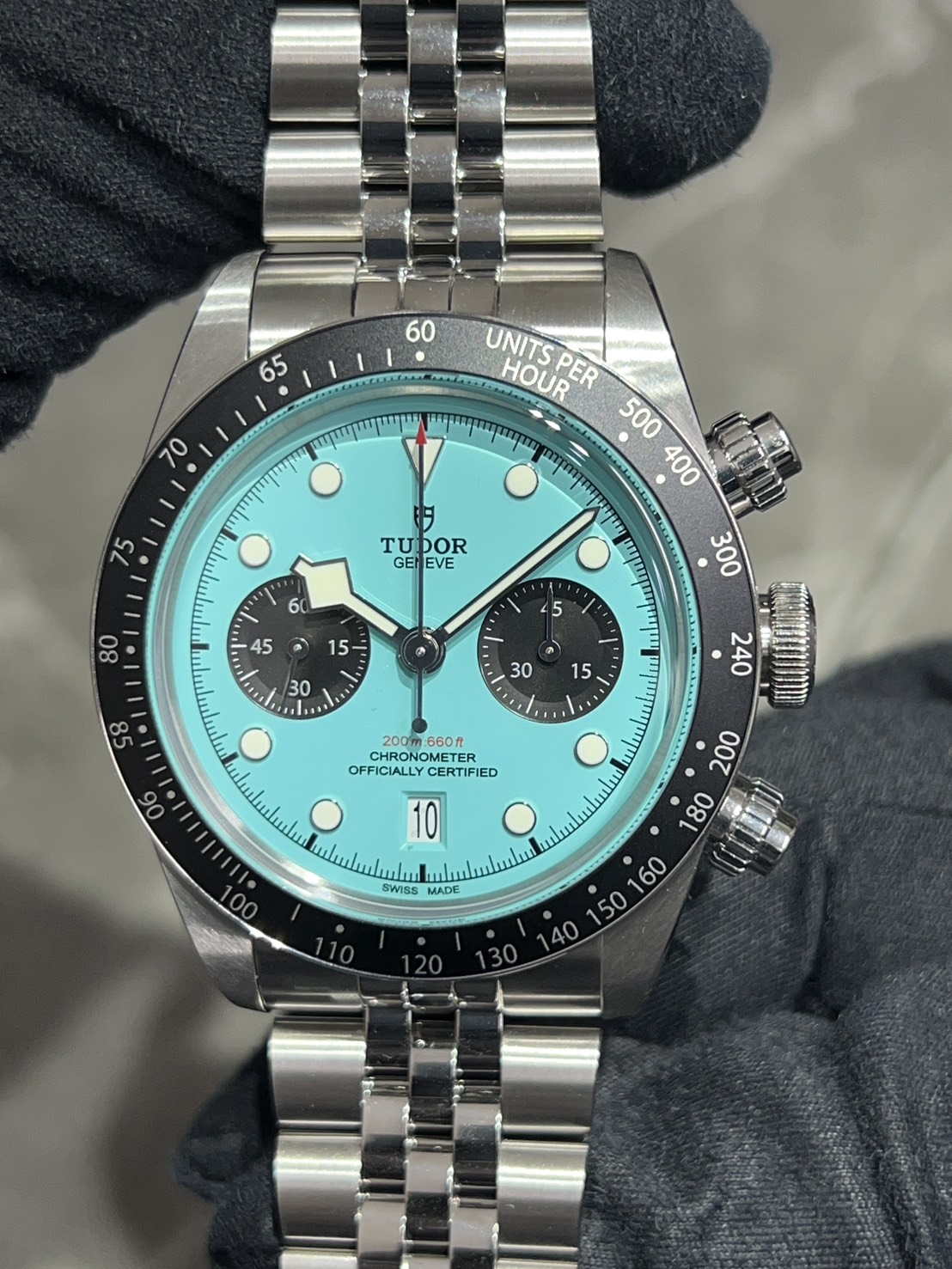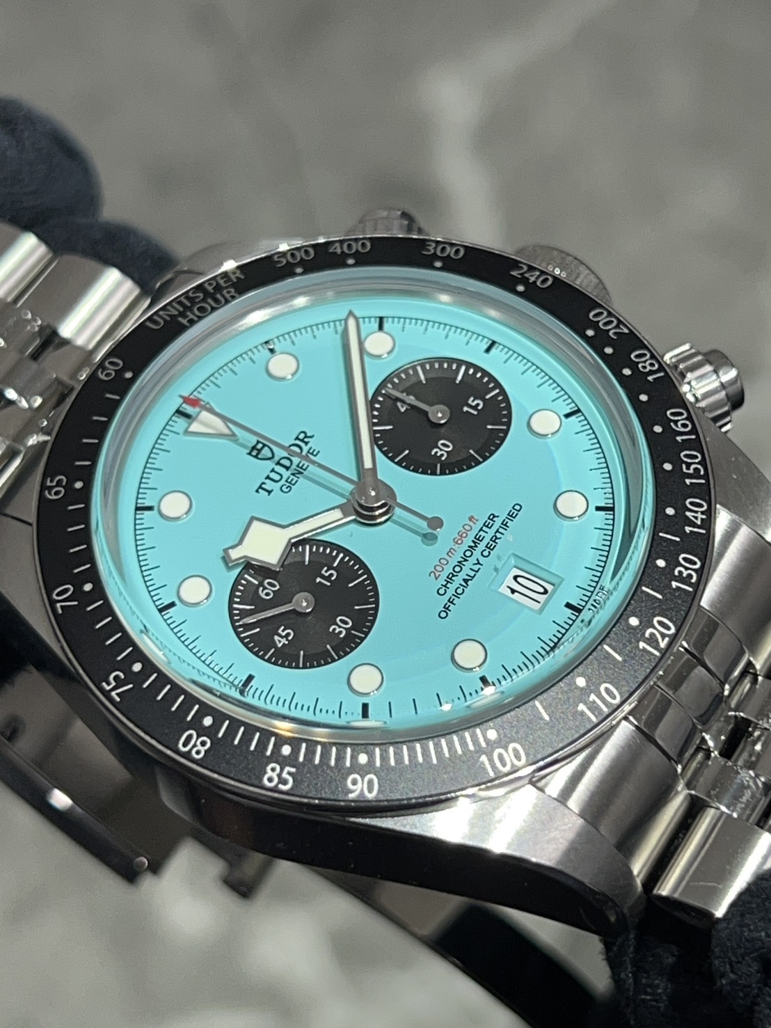 高い防水性とパワーリザーブをほこるチューダーの人気モデル、ブラックベイクロノ、ターコイズ(フラミンゴブルー)文字盤が入荷致しました!