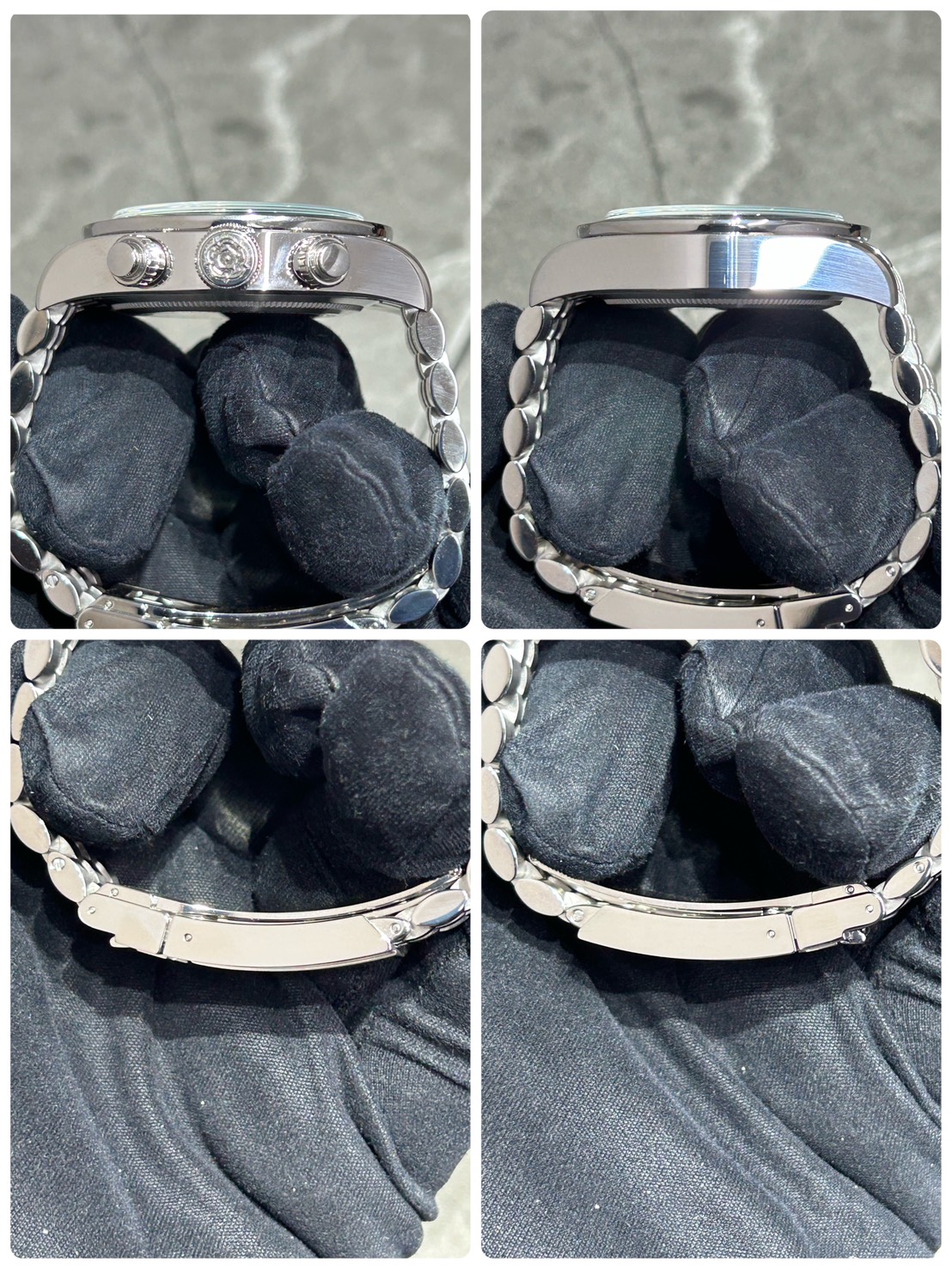 イカ針やインデックスの縁を囲む金属部分の光の反射が非常に美しくサテン、ポリッシュの仕上げを分けた5連のブレスも上品な光沢で高級感がございます。