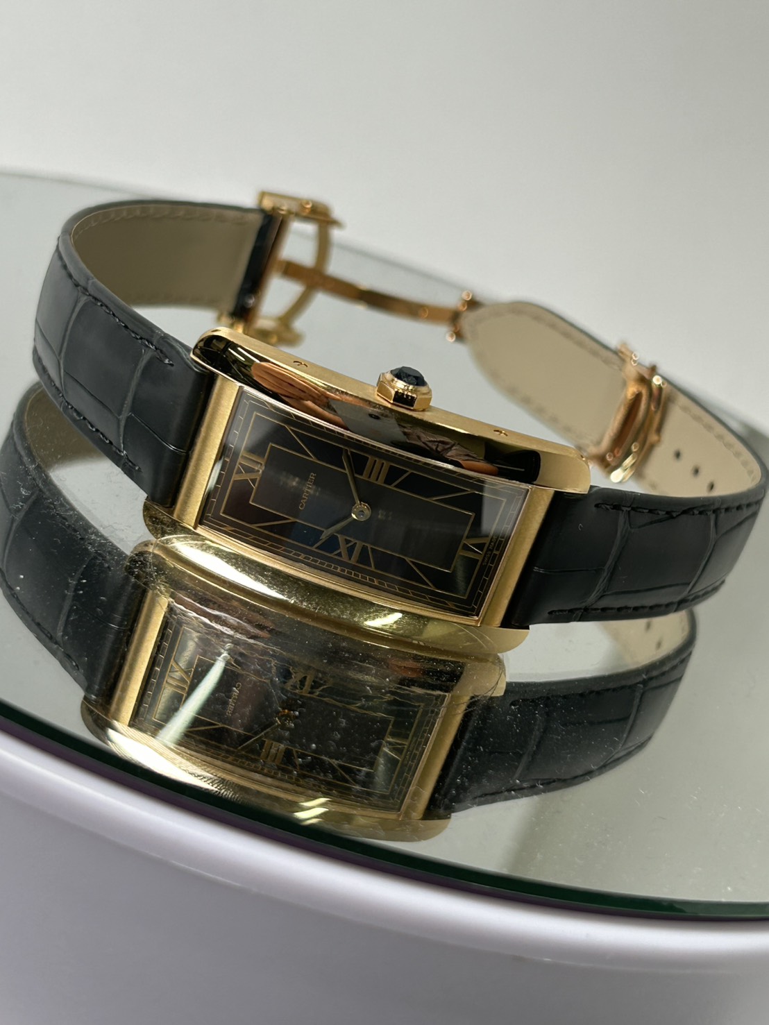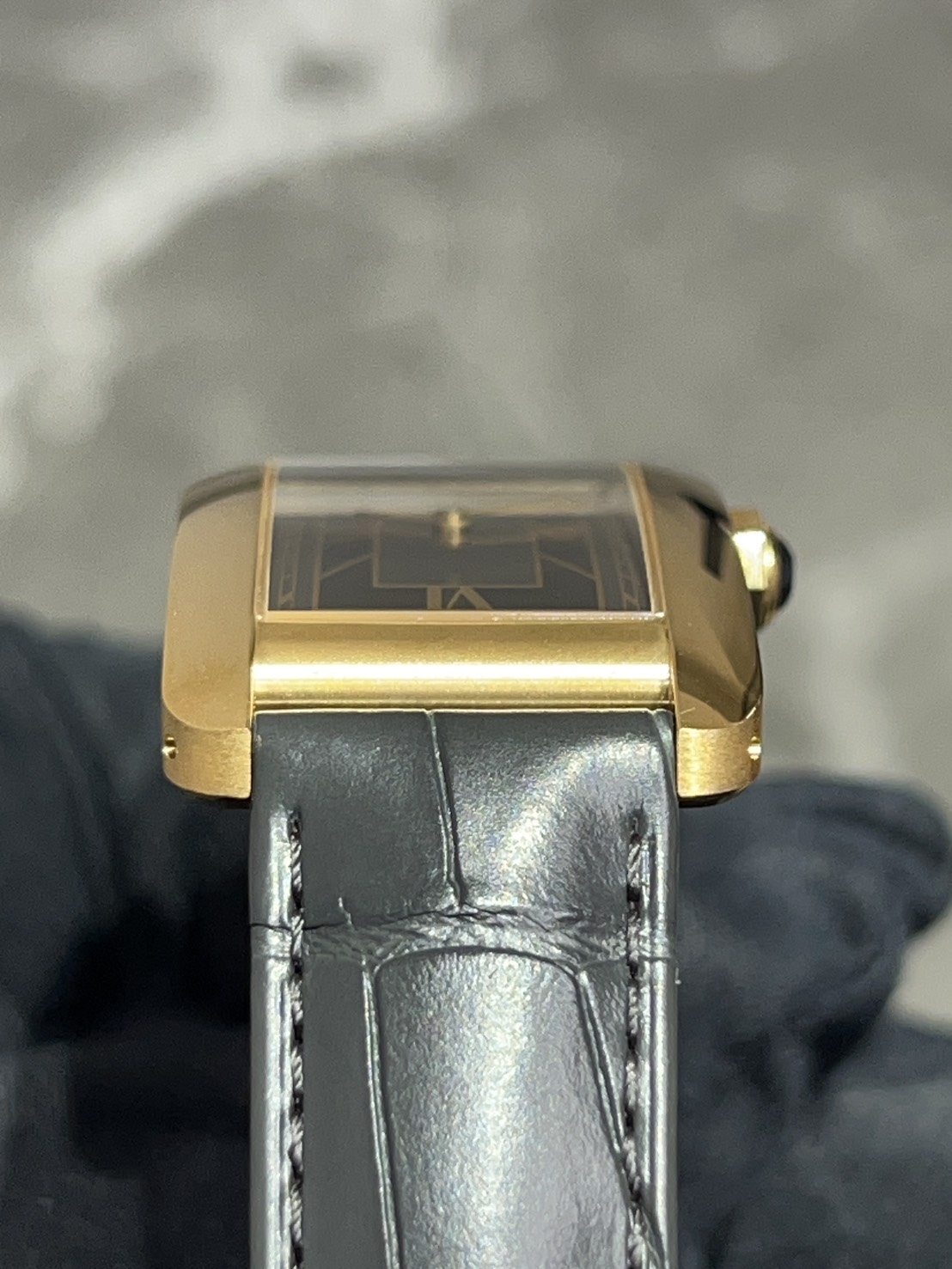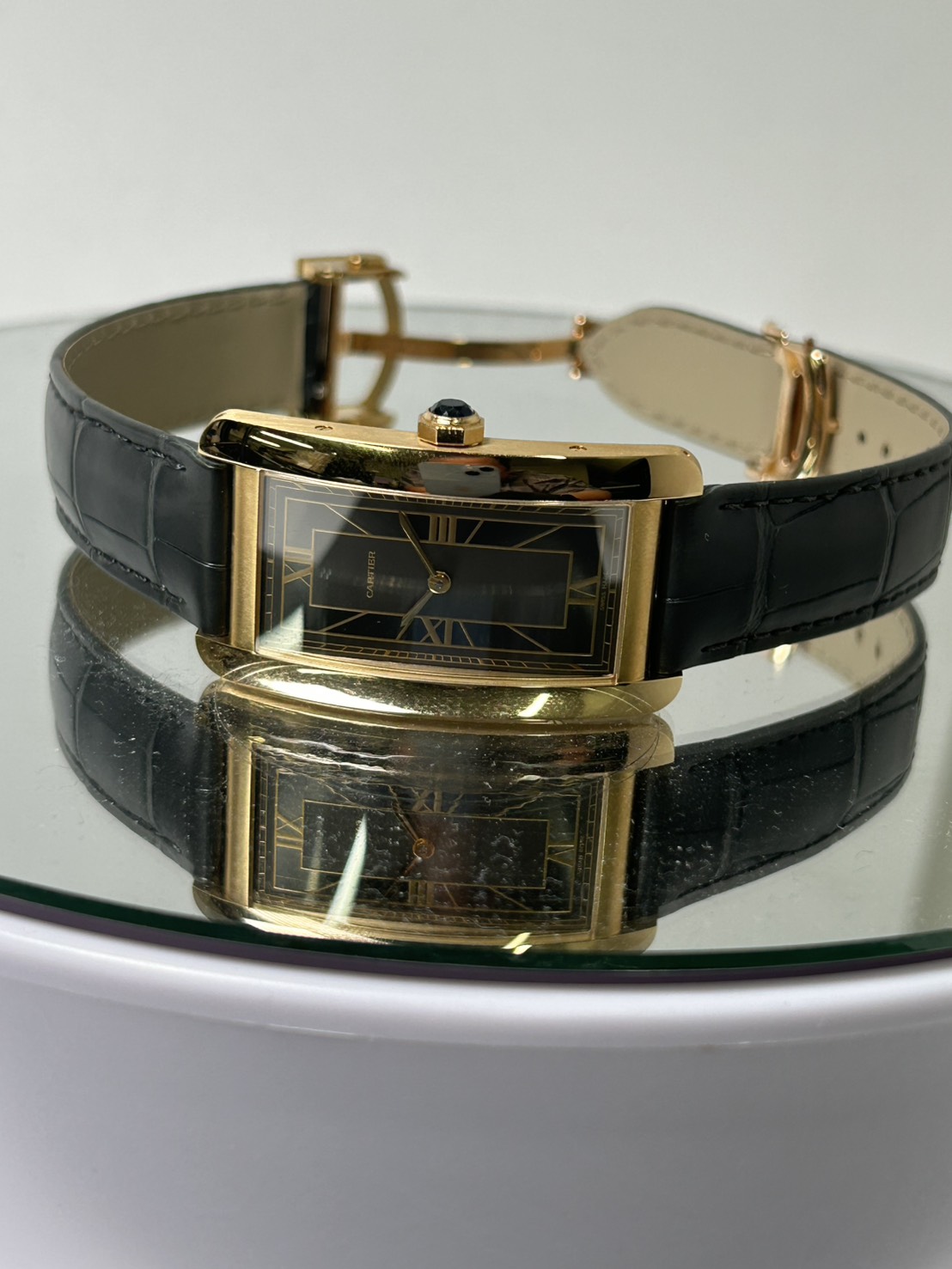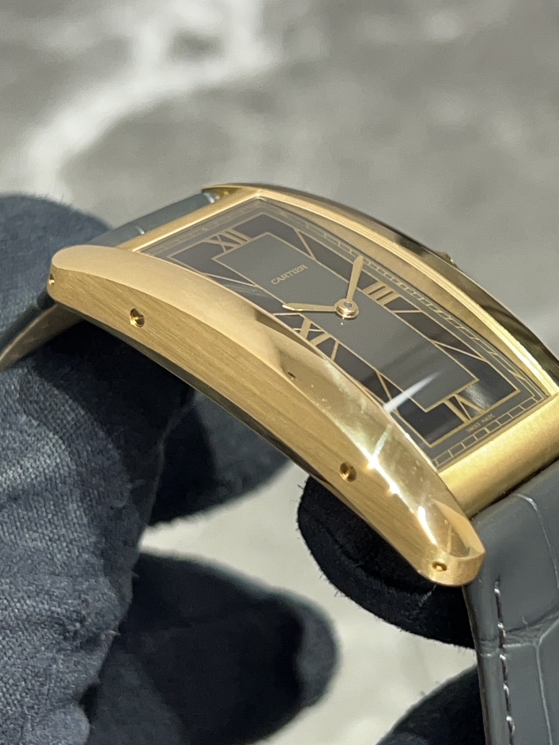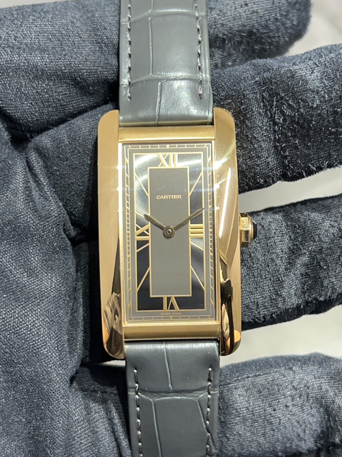 カルティエの時計コレクション「タンク」シリーズの一つで、1989年に発表されたモデルであるタンクアメリカン、湾曲させたフォルムが美しい時計で縦長のケースとストラップに続くラインが大変美しいモデルでございます。