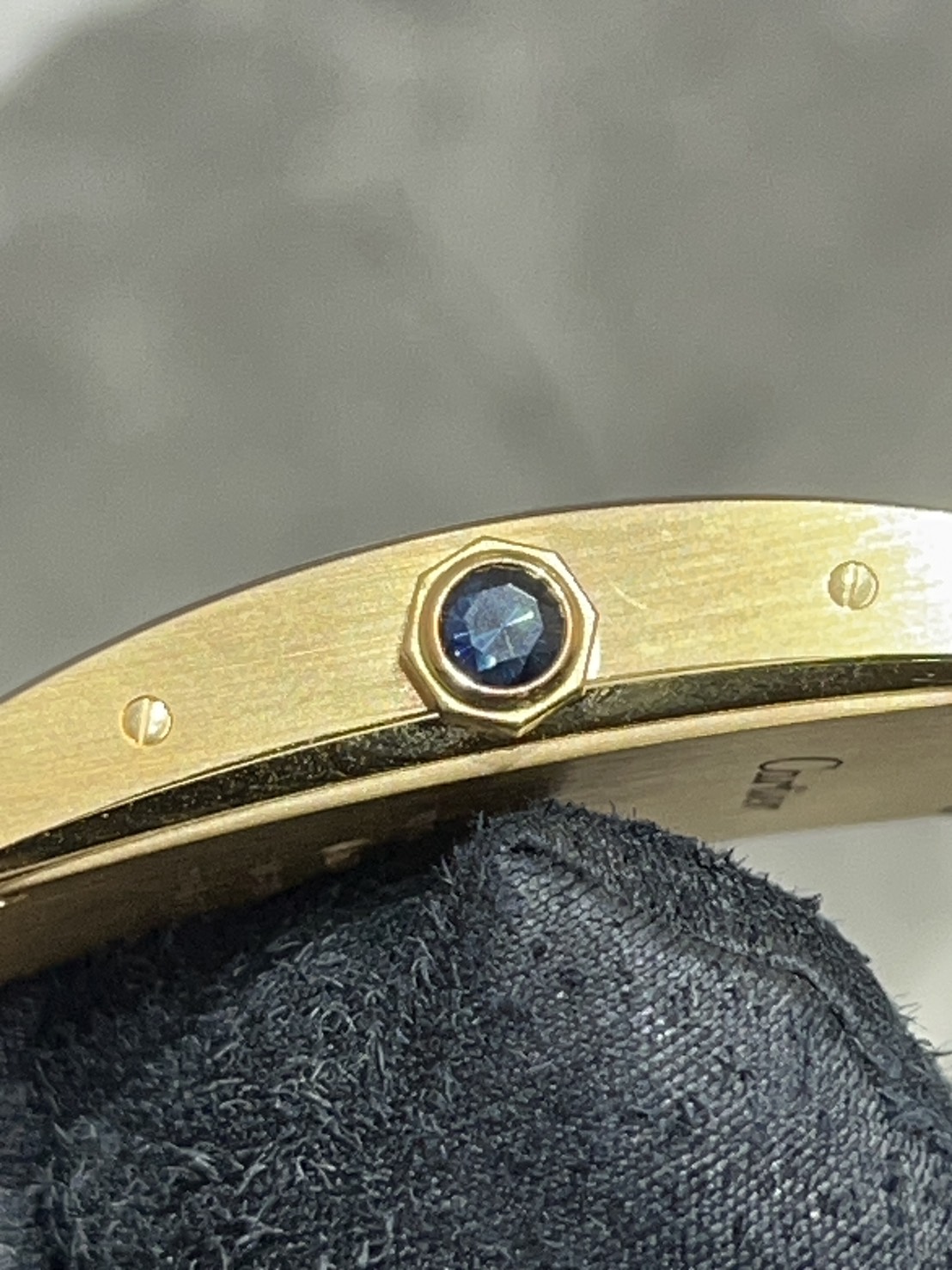 こちらアールデコ調のツートンセクターダイヤルのデザインが特徴的な個性的でクラシカルな装飾でイエローゴールドケースにファセットカットされたサファイアで装飾された多角形のリューズ剣の形をしたゴールド仕上げのスチール針等で大変スタイリッシュなモデルでございます!
