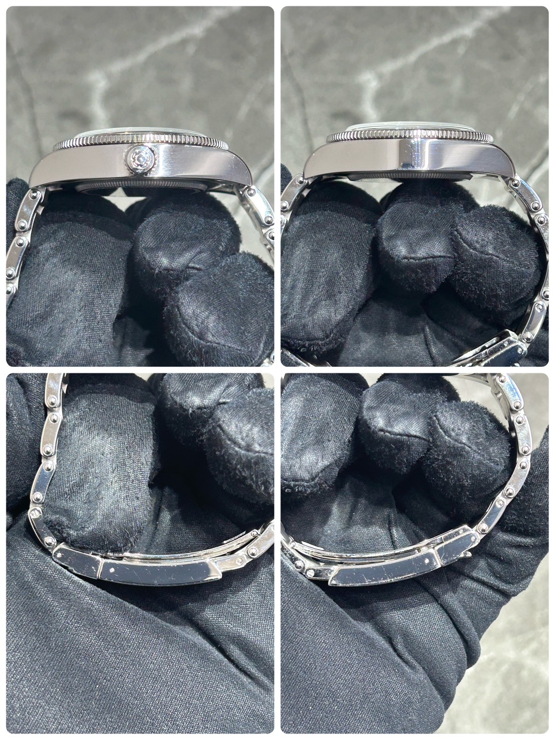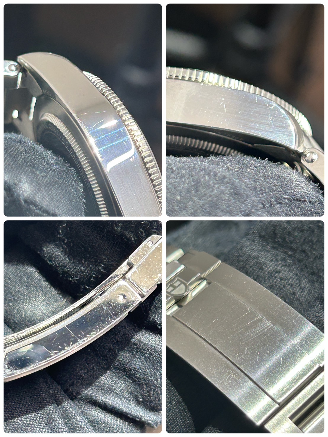 ケースサイドやバックル等に光に当てればスレ、小傷が確認できます。写真でわかりやすく撮りましたのでそちらは最後の写真をご参照くださいませ。