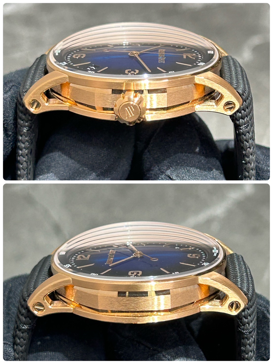 斜めの角度から文字盤を見ると湾曲したガラスが波状に見える姿は他の時計には見られない唯一無二の時計と言えるでしょう。