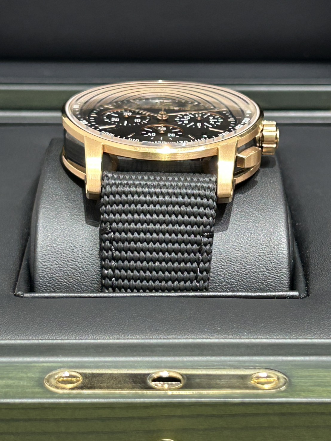 秋口に合いそうなピンクゴールド素材、暗めの文字盤にインデックスのピンクゴールドが映え色気があるモデルでございます。
