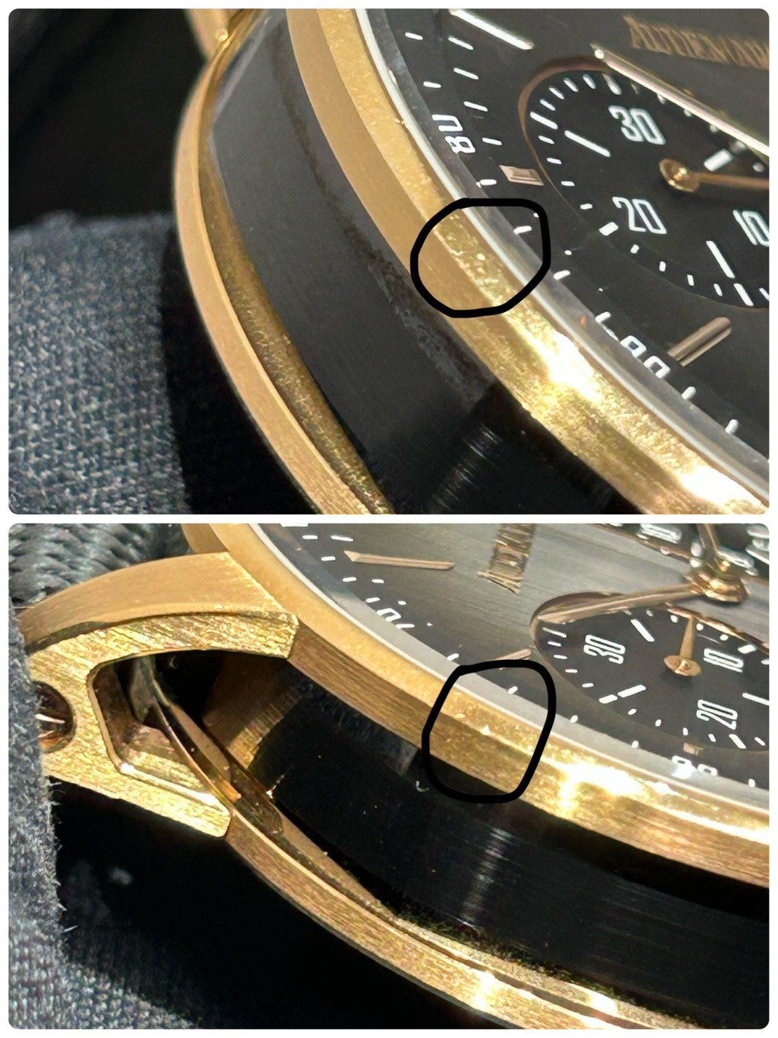 全体的にご愛用に伴う微細なスレが確認できます。ベゼルに細かい小傷(極小の打痕?)が確認できますがストラップも比較的綺麗で全体のコンディションは良好でしたので中古美品として出品させて頂きます。