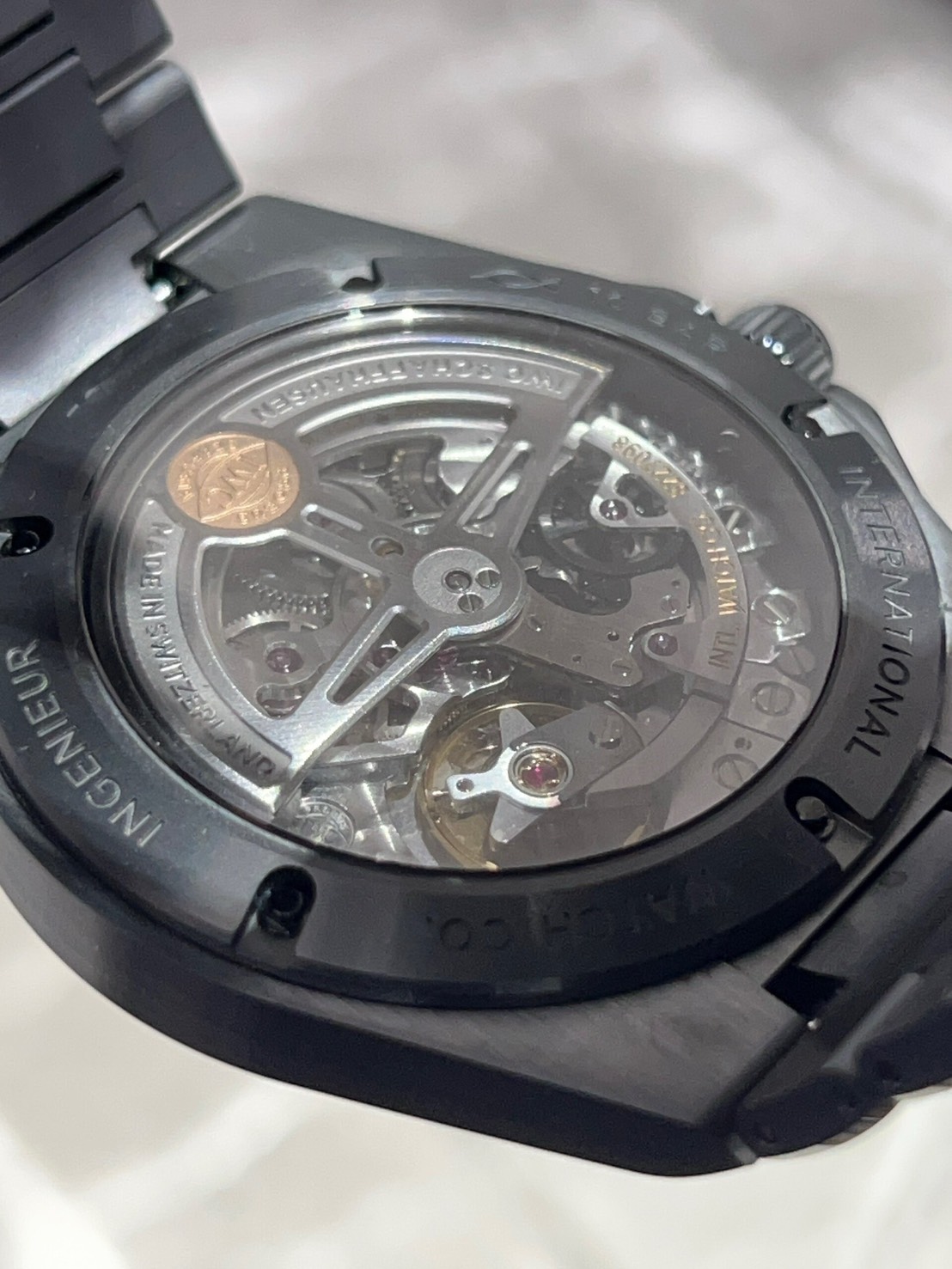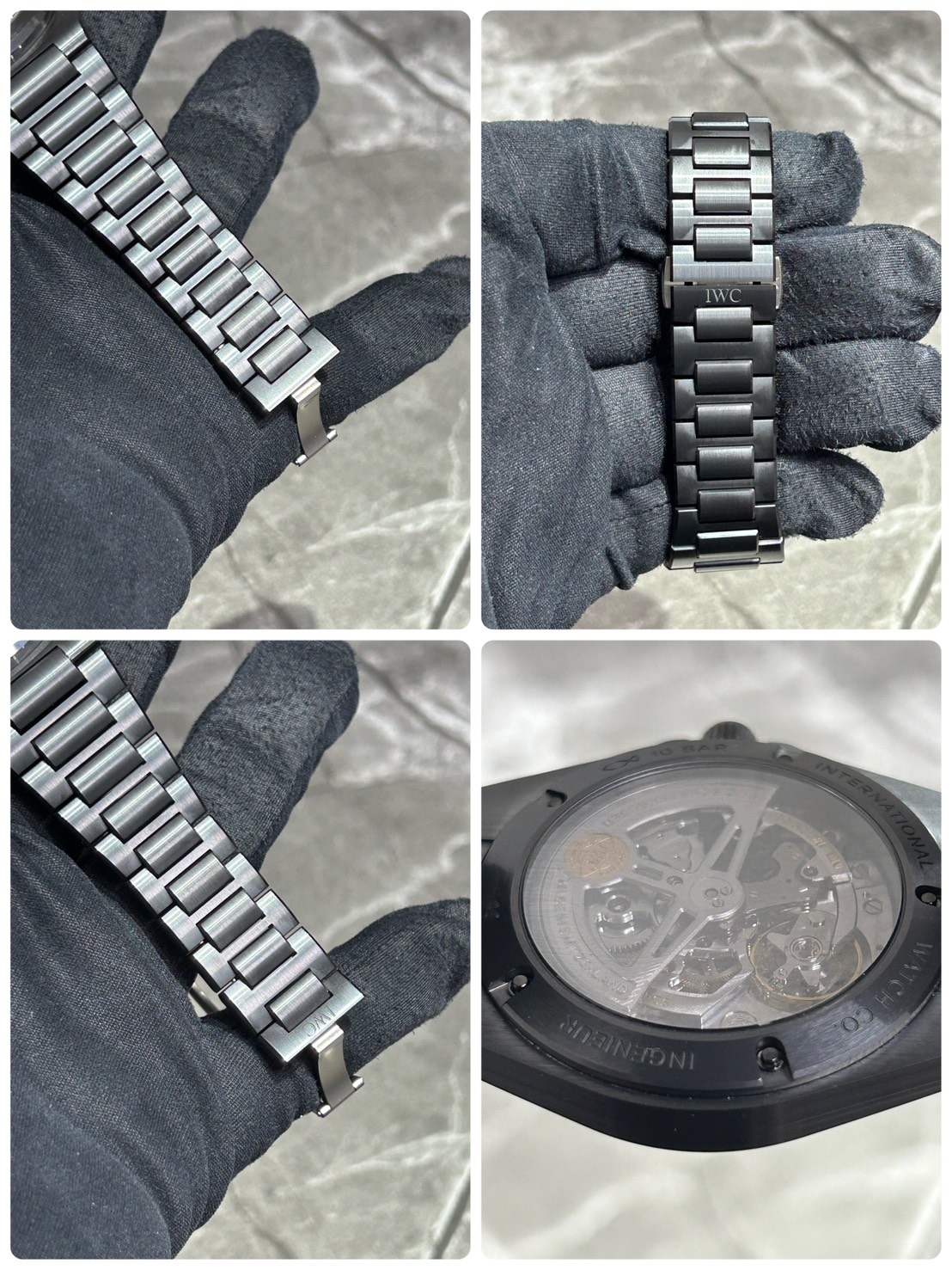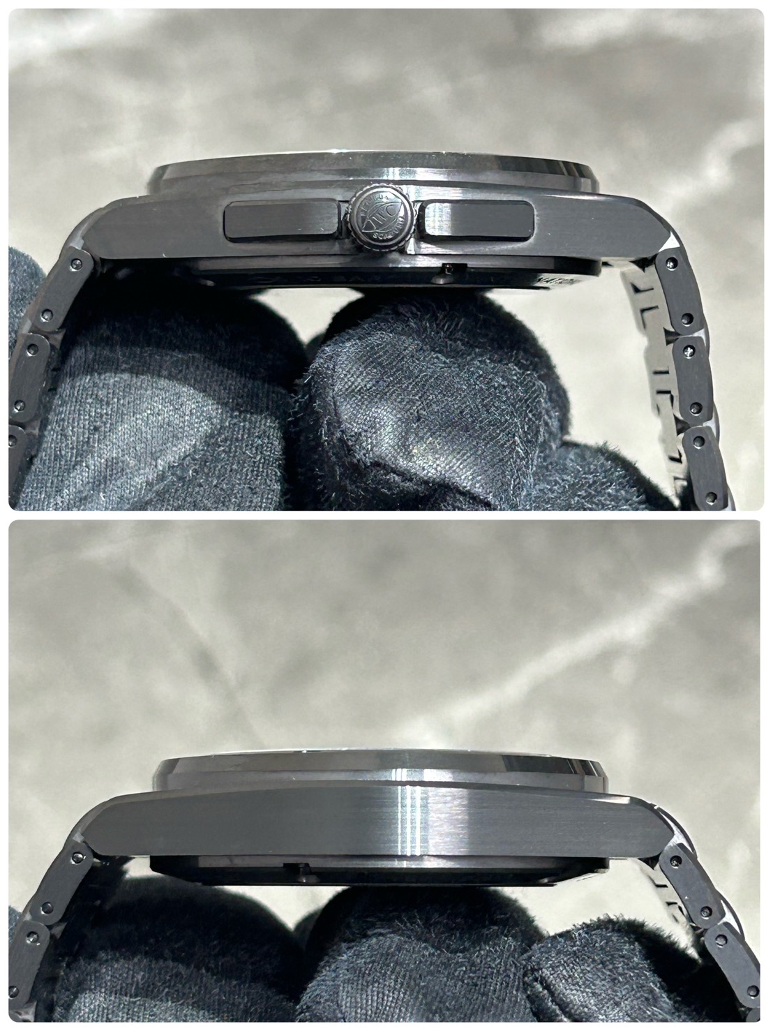 このモデルは、インヂュニアシリーズとして初めてケース、ベゼル、裏蓋、リューズ、リューズガードまでもセラミック素材を使用したモデルになっており、セラミックパーツをネジで接合する部分には内部にチタンリング を用いて構造を補強しており、これにより防水性や剛性を確保しています。