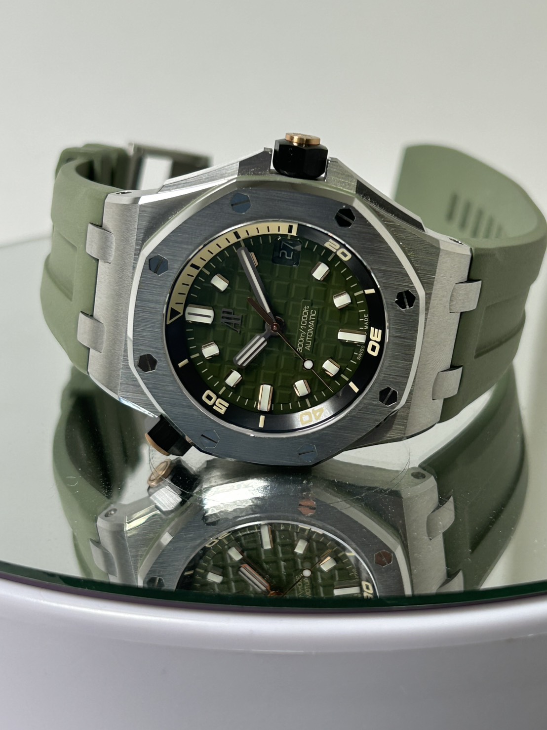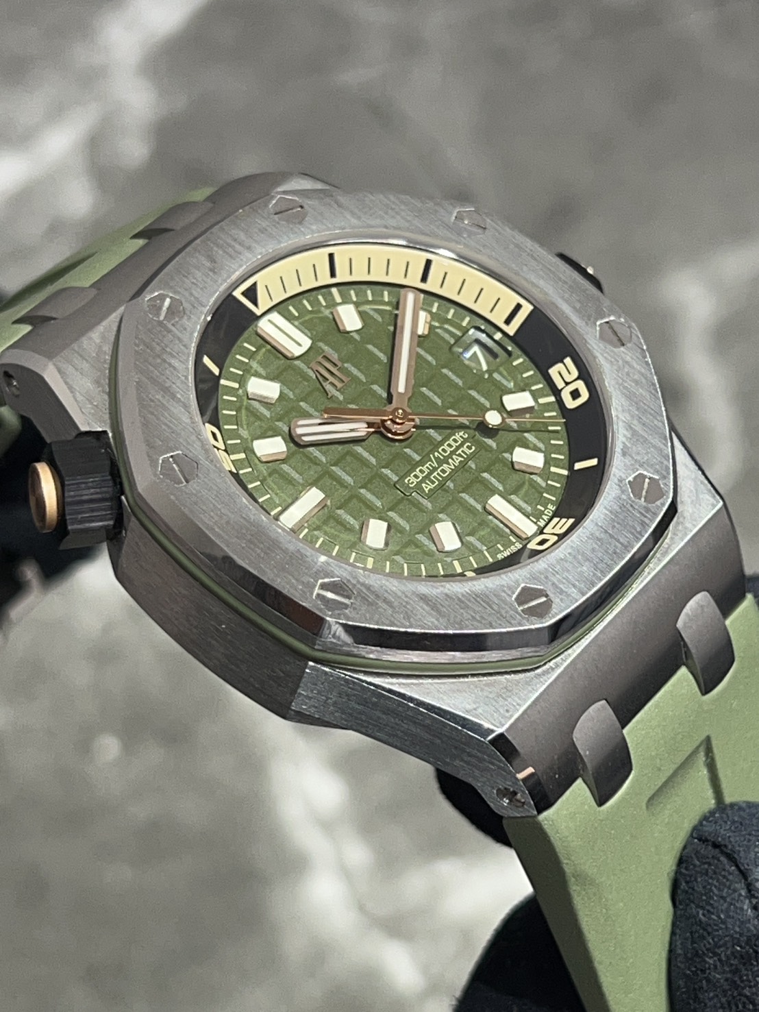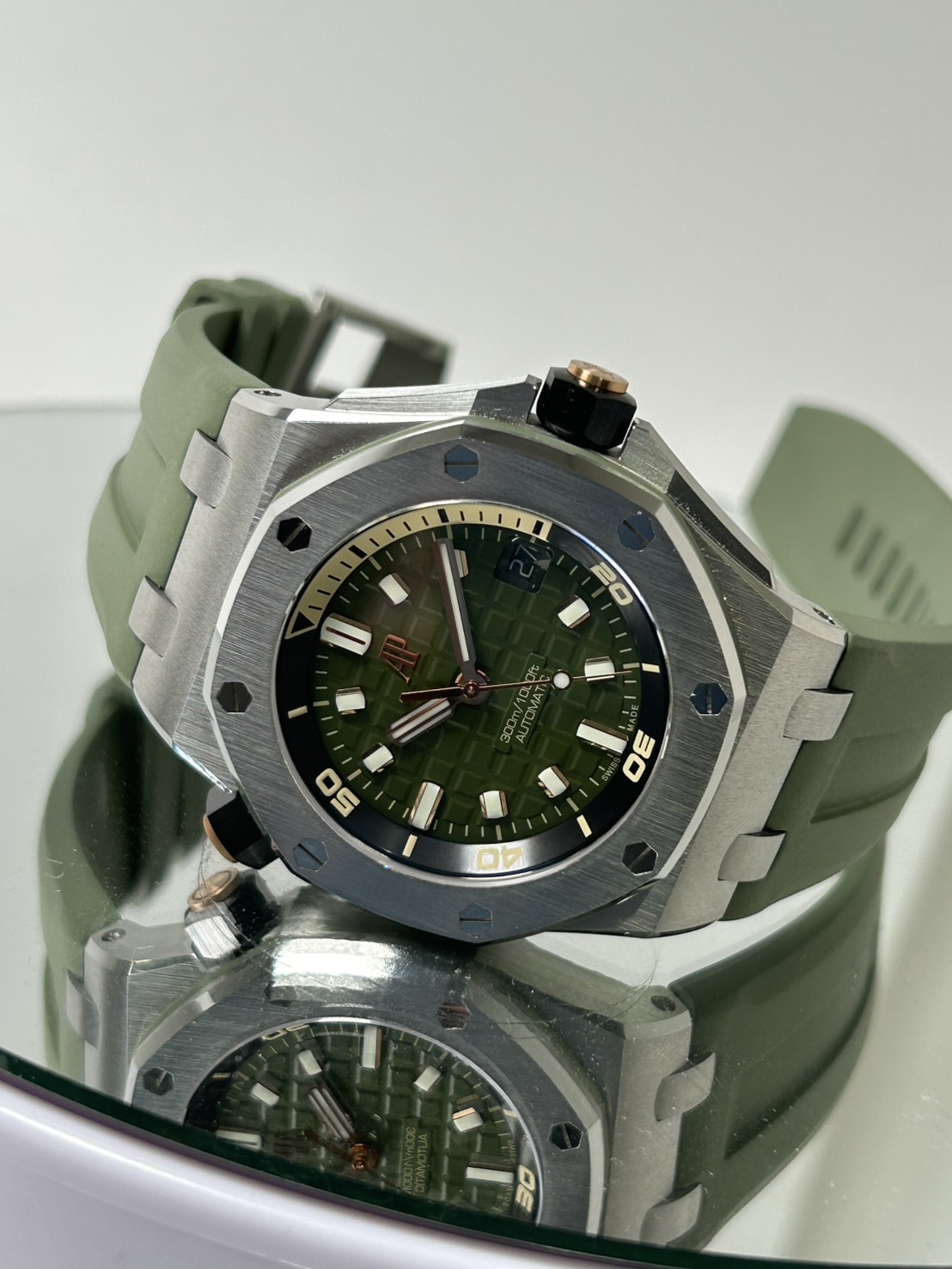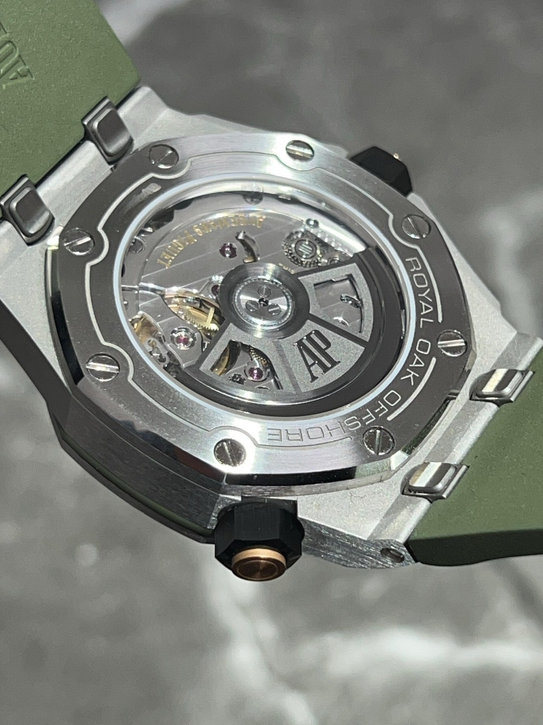 カーキグリーンの文字盤にピンクゴールドのアプライドアワーマーカーとロイヤルオーク針、スポーティーでありながら色気を感じるスタイリッシュなモデルでございます。