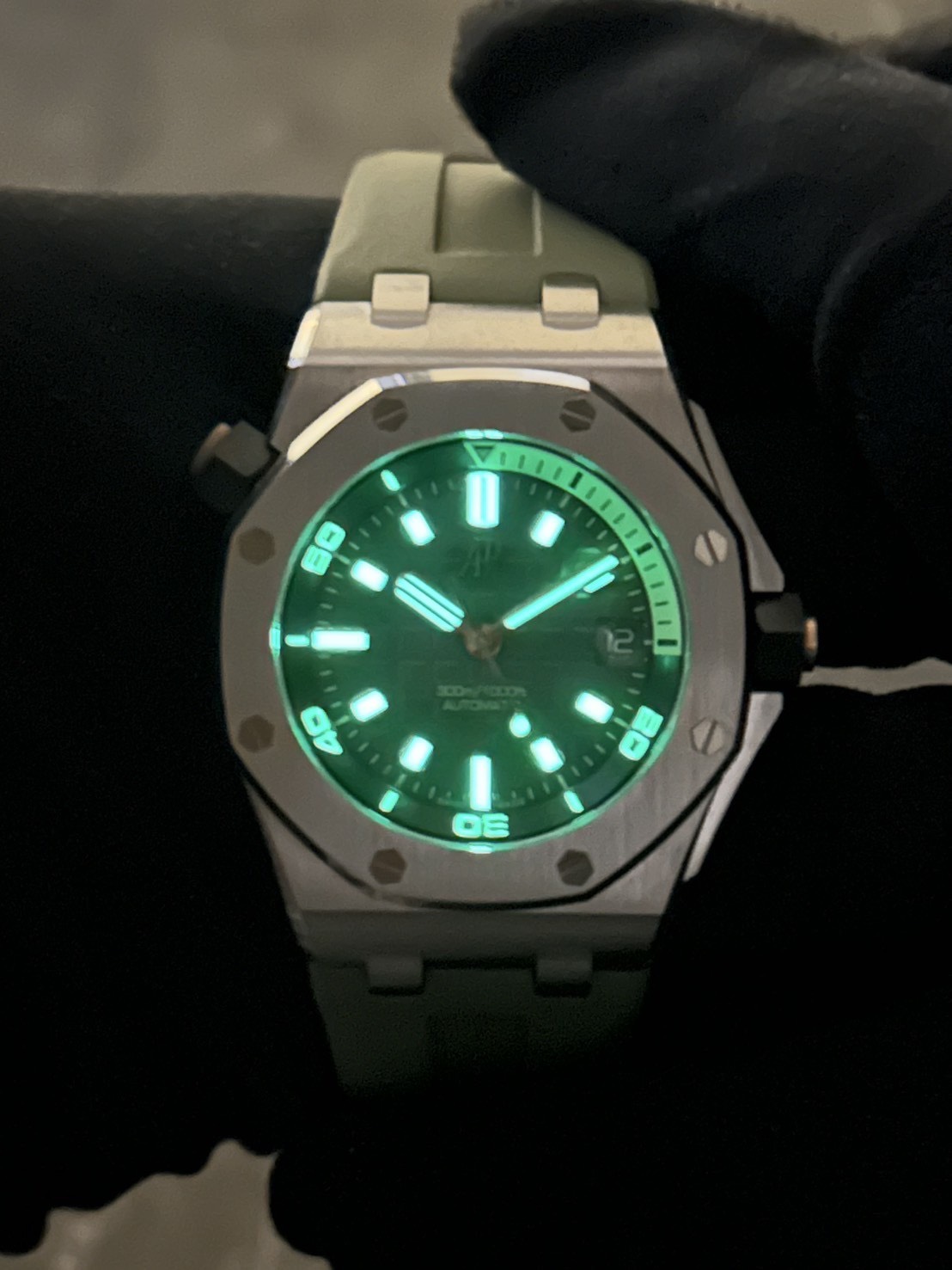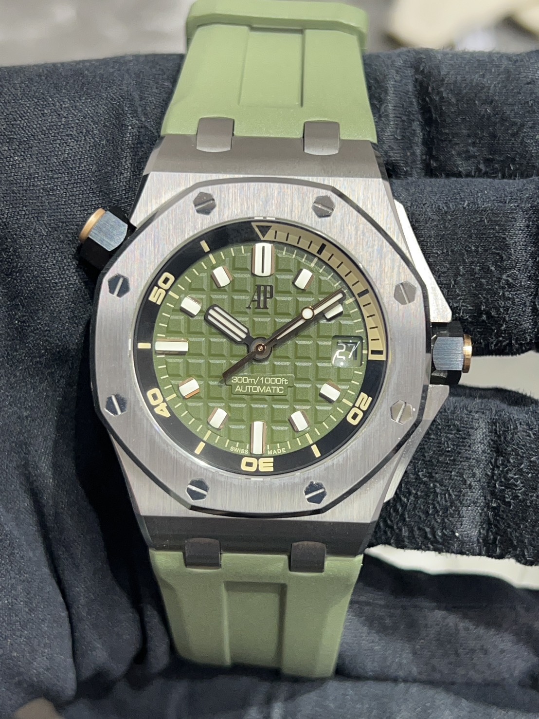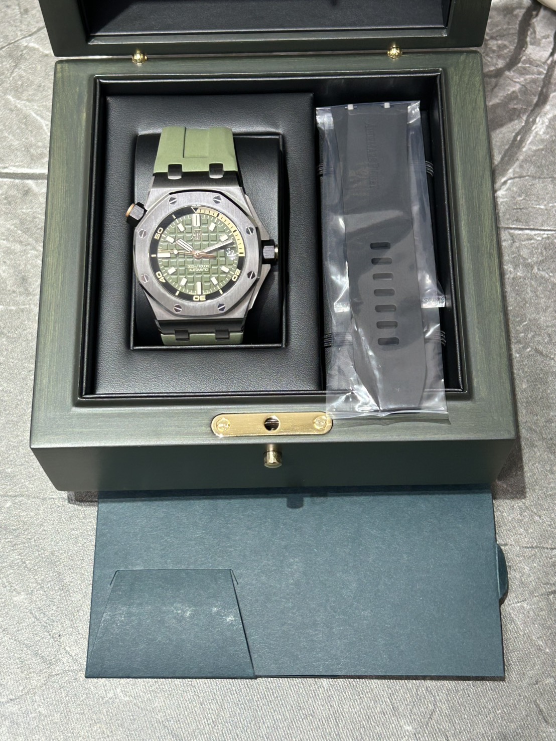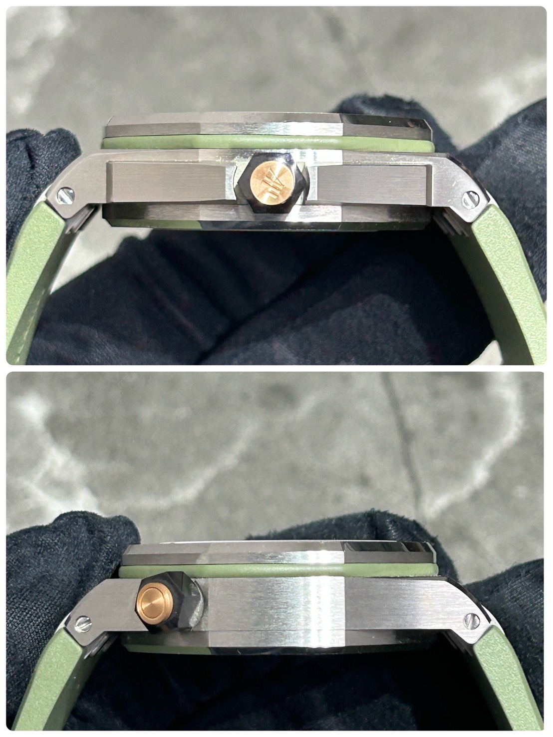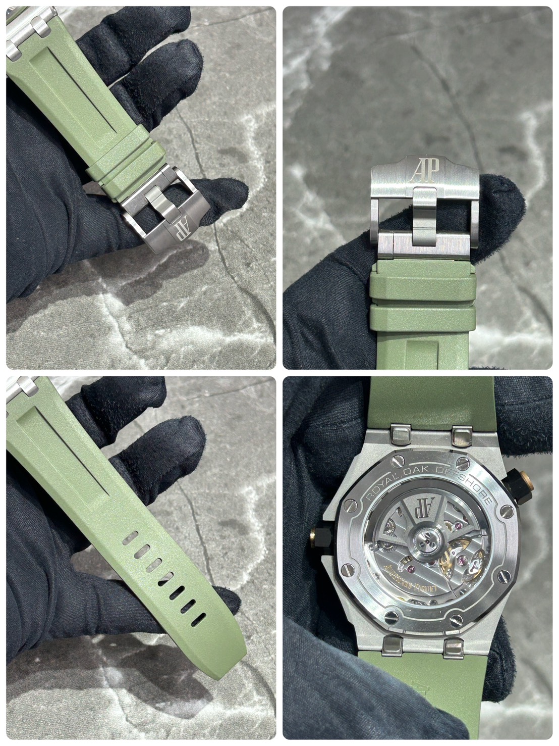 カーキグリーンの文字盤にピンクゴールドのアプライドアワーマーカーとロイヤルオーク針、スポーティーでありながら色気を感じるスタイリッシュなモデルでございます。