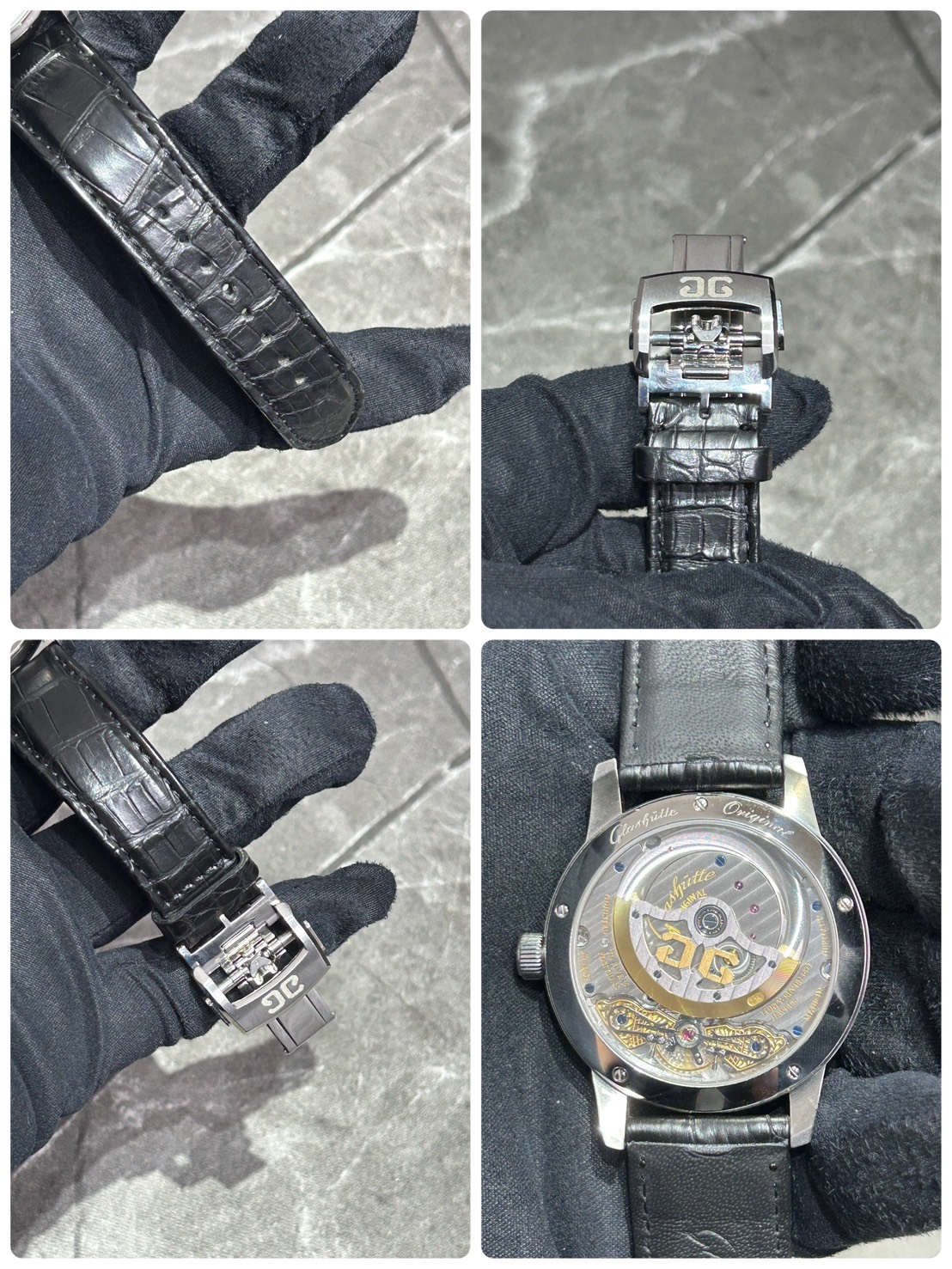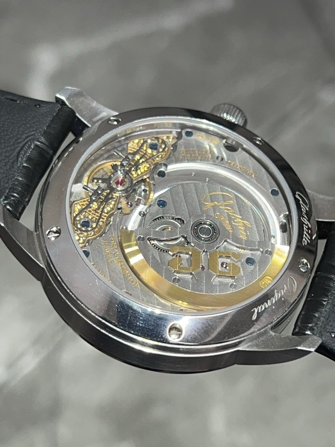 鮮やかなガルバニック仕上げに裏蓋からは特徴的な3/4プレートとダブルスワンネック緩急針がございますして非常に美しいです。