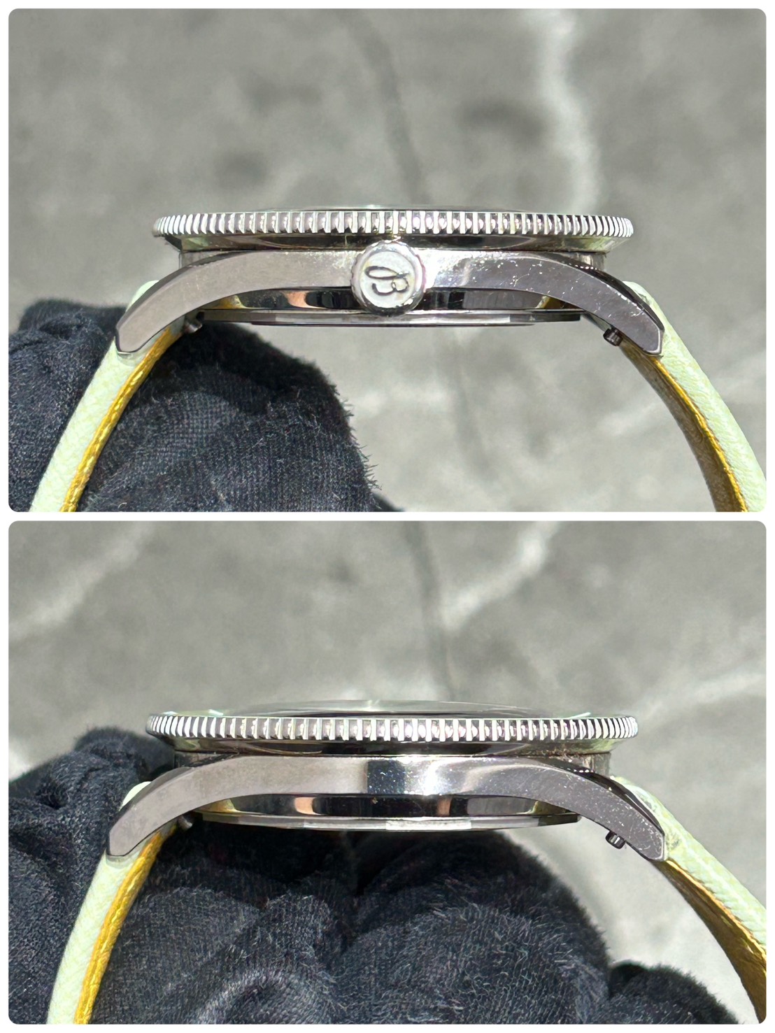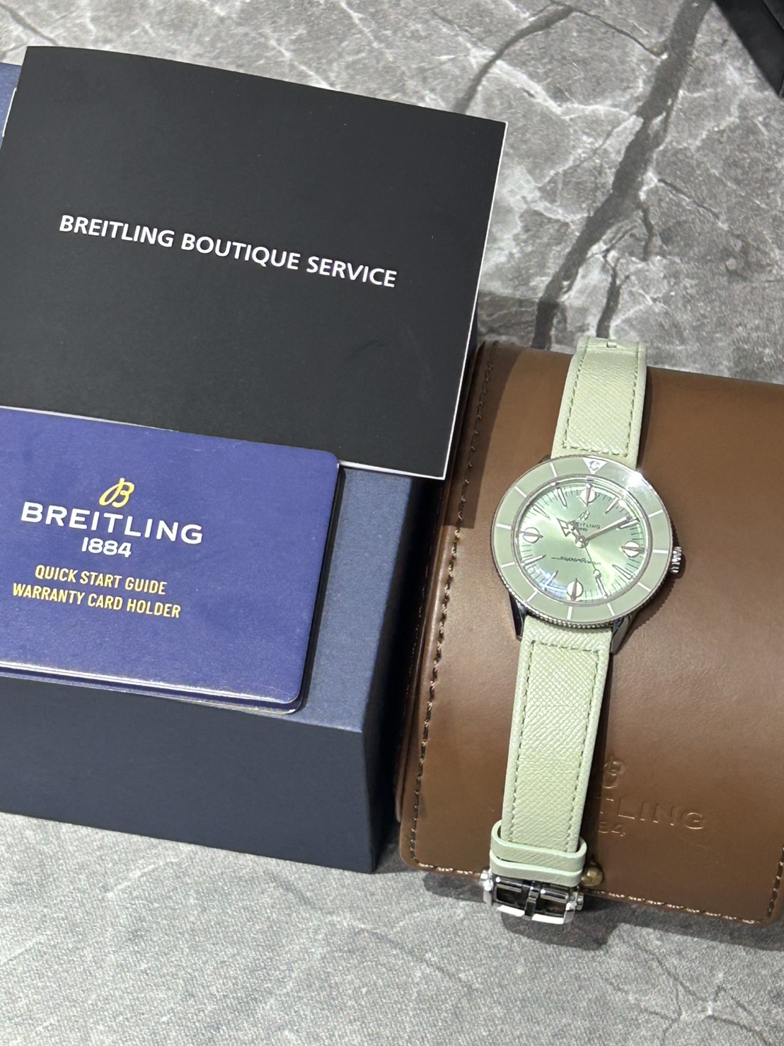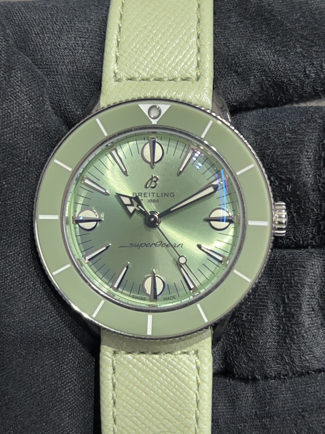 38㎜の小ぶりなケースに鮮やかなミントグリーン文字盤、9.35㎜のケース厚も相まって大変軽やかにご愛用頂けるモデルでございます。