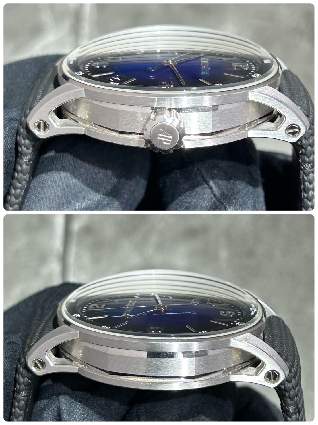 斜めの角度から文字盤を見ると湾曲したガラスが波状に見える姿は他の時計には見られない唯一無二の時計と言えるでしょう。