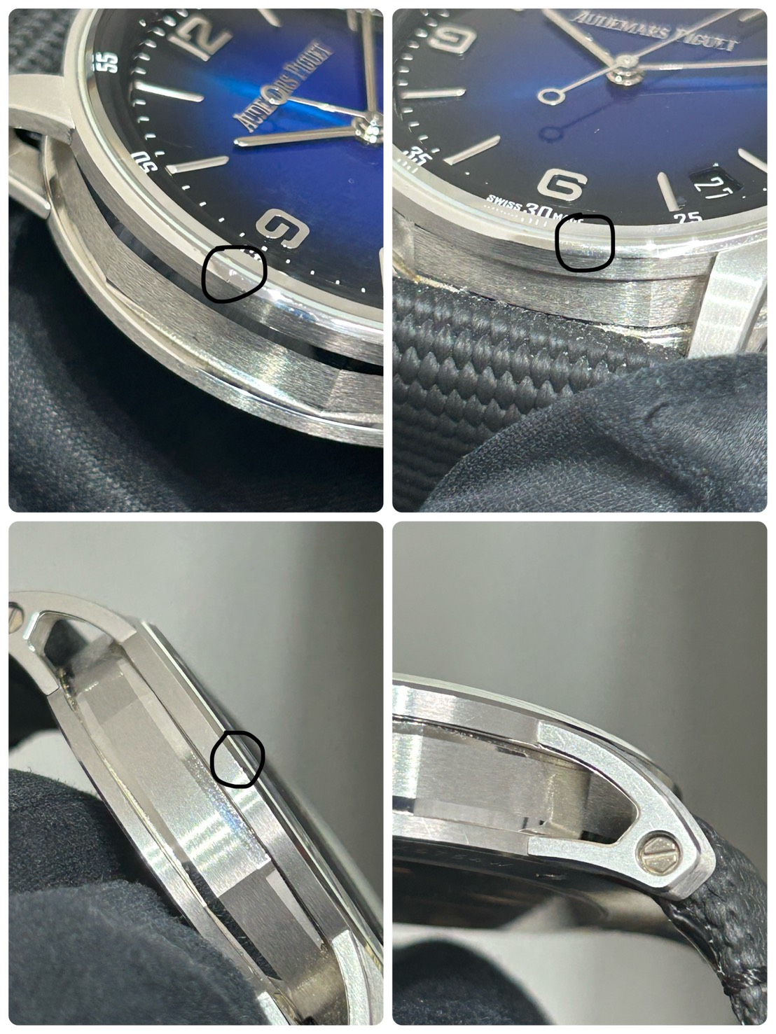 全体的にご愛用に伴うスレ、小傷が確認できます。ベゼルに光に当てたりルーペで見ると確認できるレベルの極小の打痕が確認できますが深い傷はない印象です。写真にも写らず肉眼での確認も難しいのですがガラス11時はしっこに微細なスレが強い光に当てルーペで確認するとございますので予めご承知おきください。