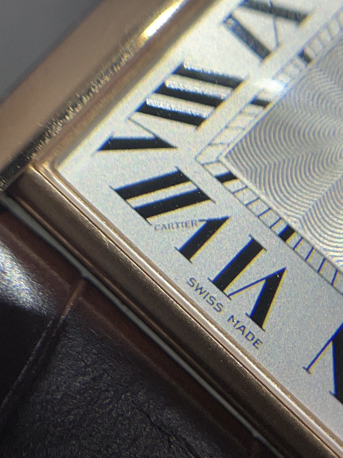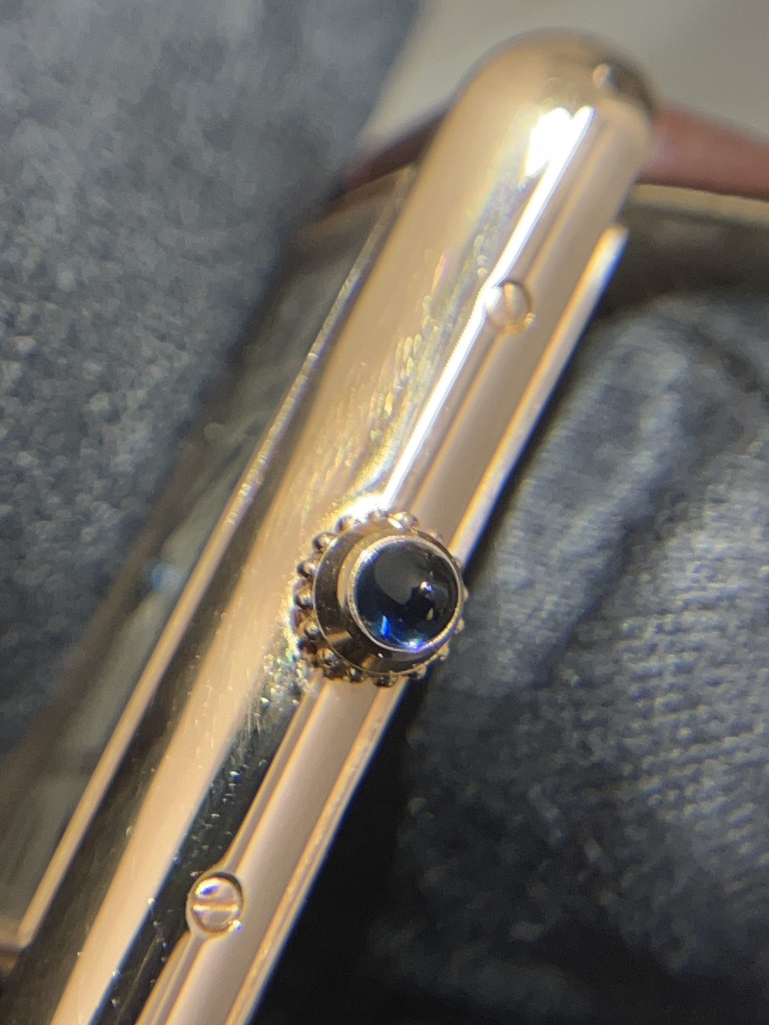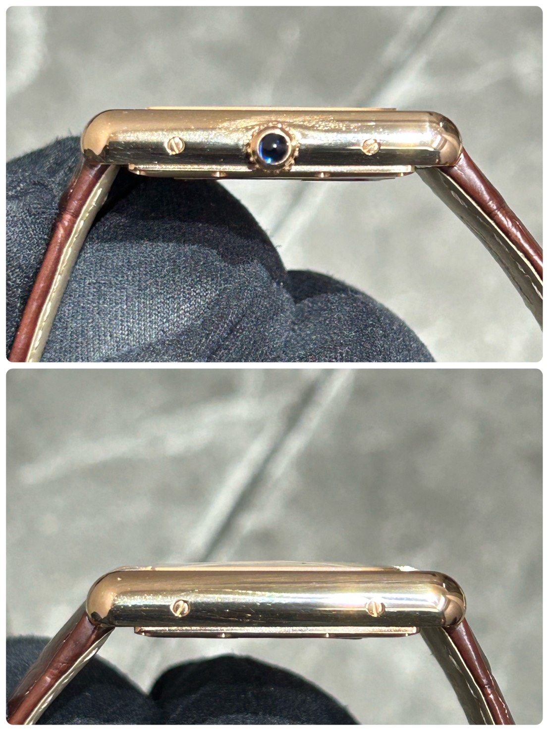7時のローマ数字には隠し文字でCARTIERと記載がありケースサイドから見るとブルーサファイアのリューズが佇んでおります。