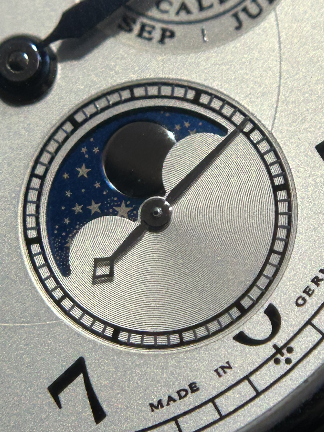 日、月、週、ムーンフェイズ等の複雑機構を搭載しながらケースの厚みが10.10㎜、そして文字盤の中にこれだけの表示をしながらごちゃごちゃせず大変すっきりした印象に見えるモデルでございます。