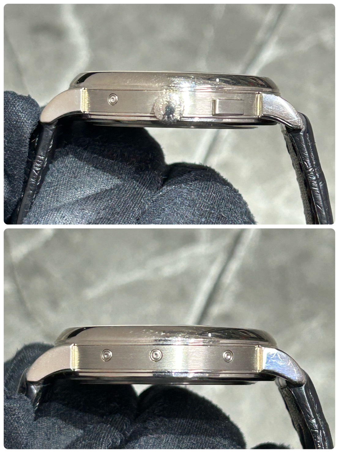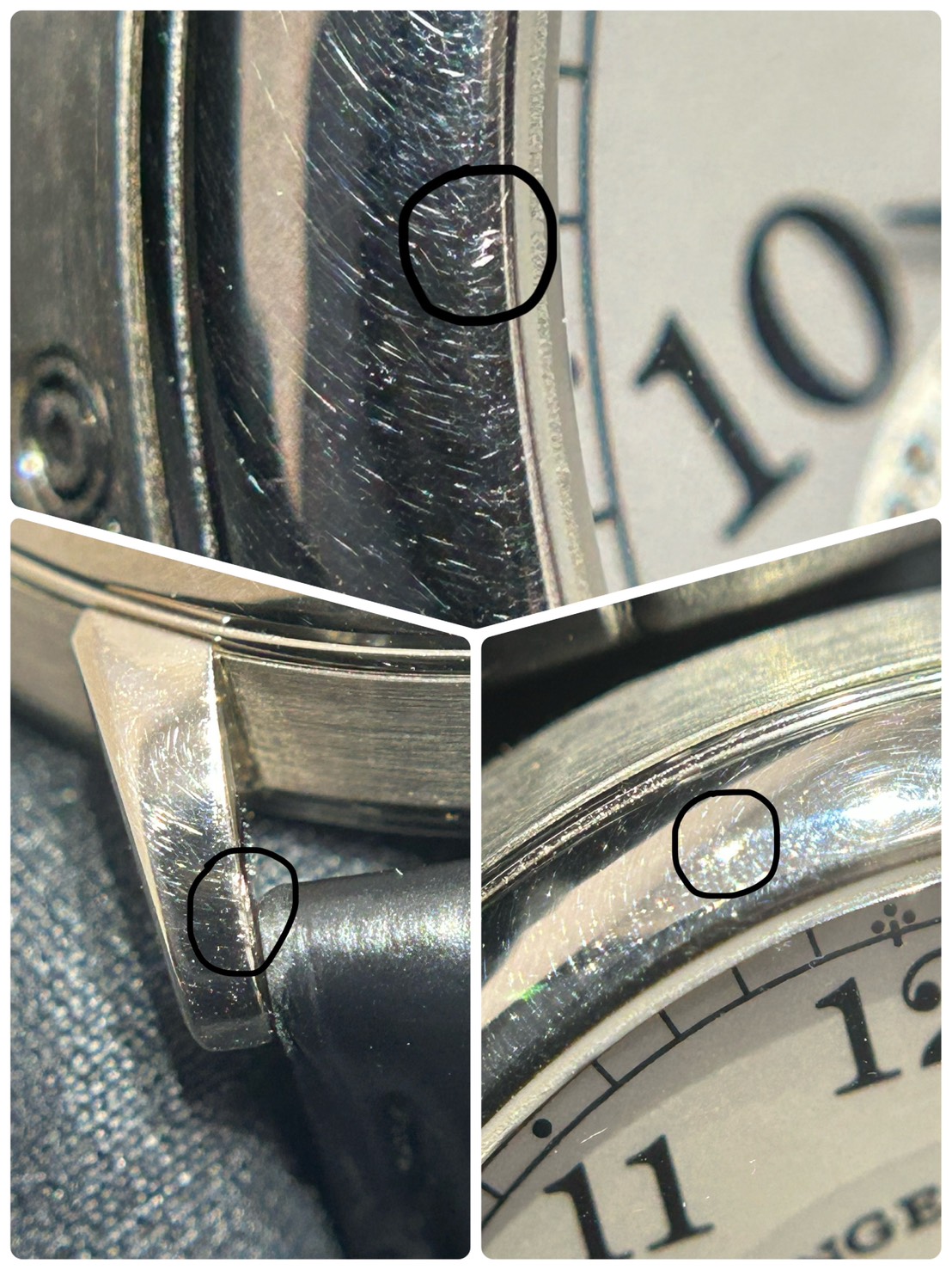 ぱっと見は美品ですが注視すると全体的にご愛用に伴うスレがあり、ベゼルやラグに小傷、極小の打痕等が確認できます。