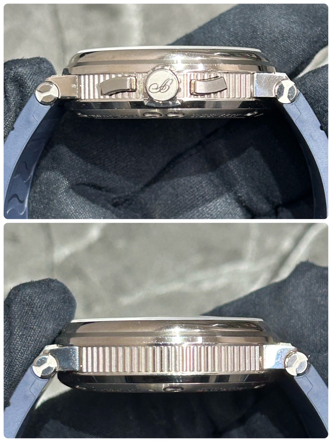 ご愛用に伴うスレ、小傷が全体的にありベゼルの5時 9時位置に小さな打痕がありますが、目立つ傷は少ない印象です。