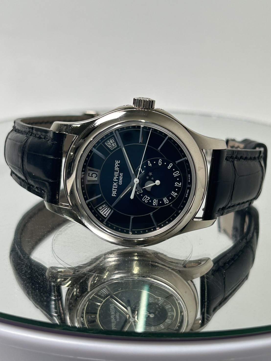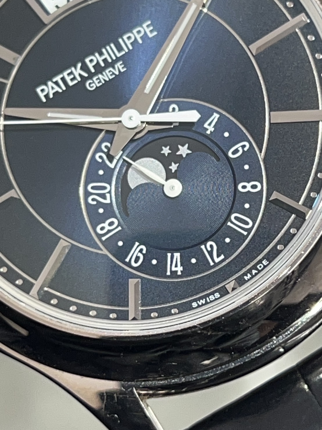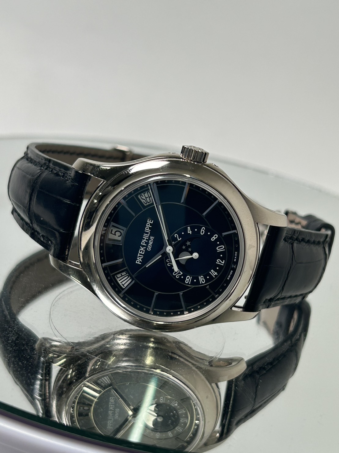 文字盤上部に曜日、日付、月の窓表示があり6時位置に24時間表示、ムーンフェイズが配置されており、視認性が良く、高級感のある仕上がりとなっております。