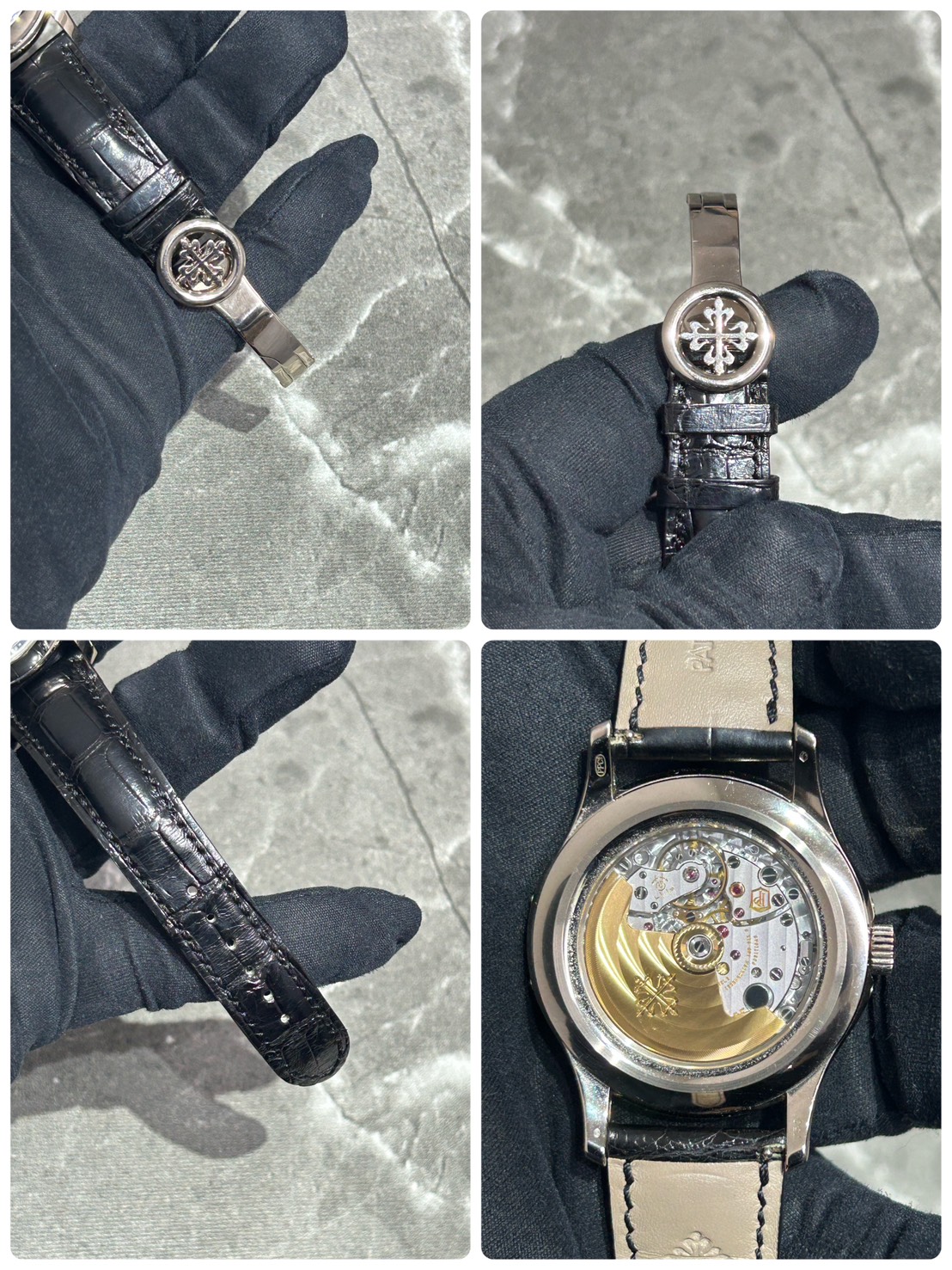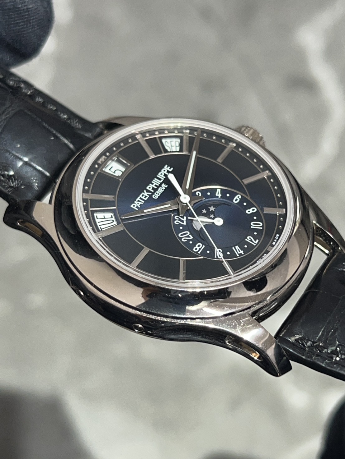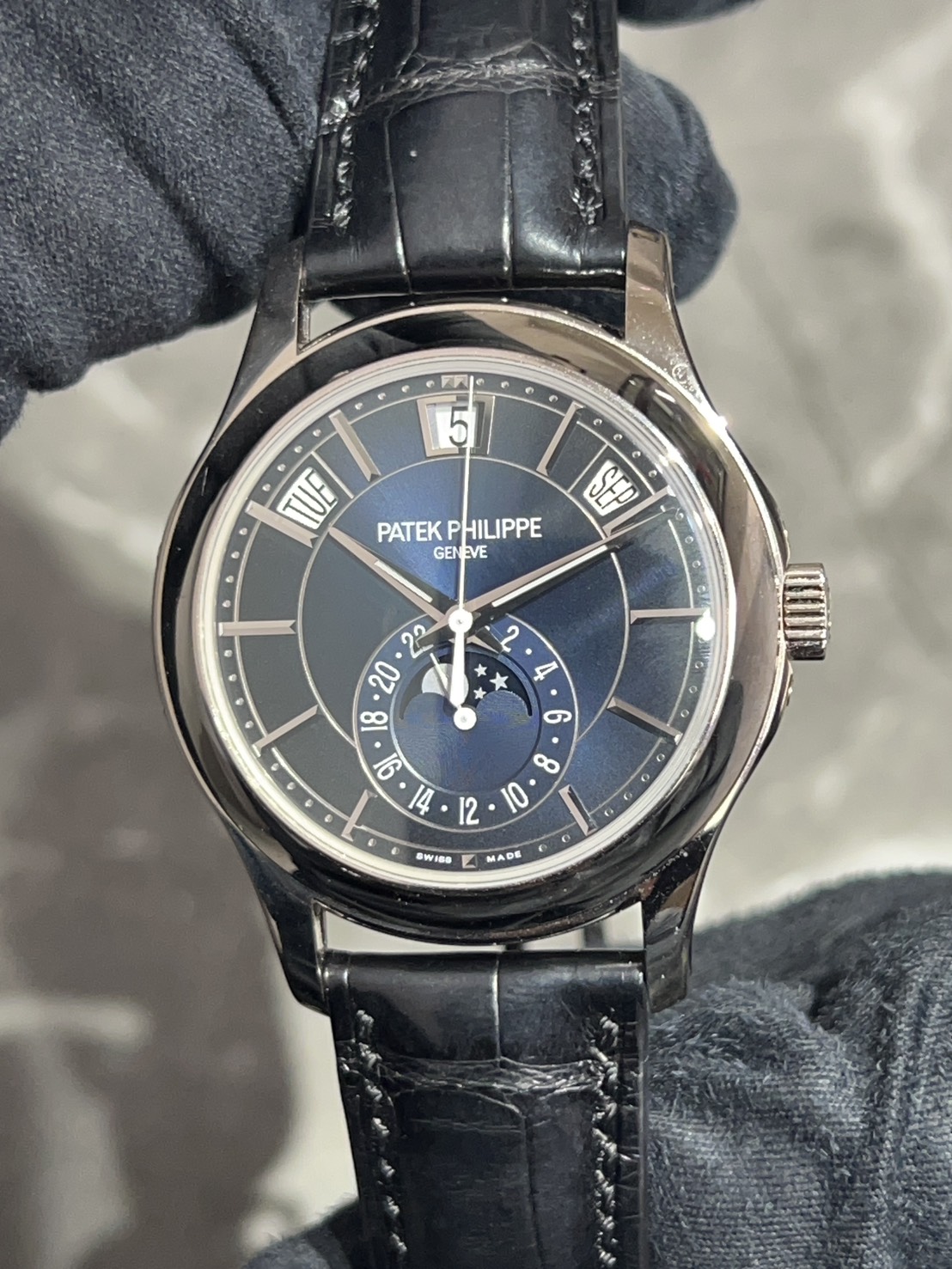 文字盤上部に曜日、日付、月の窓表示があり6時位置に24時間表示、ムーンフェイズが配置されており、視認性が良く、高級感のある仕上がりとなっております。