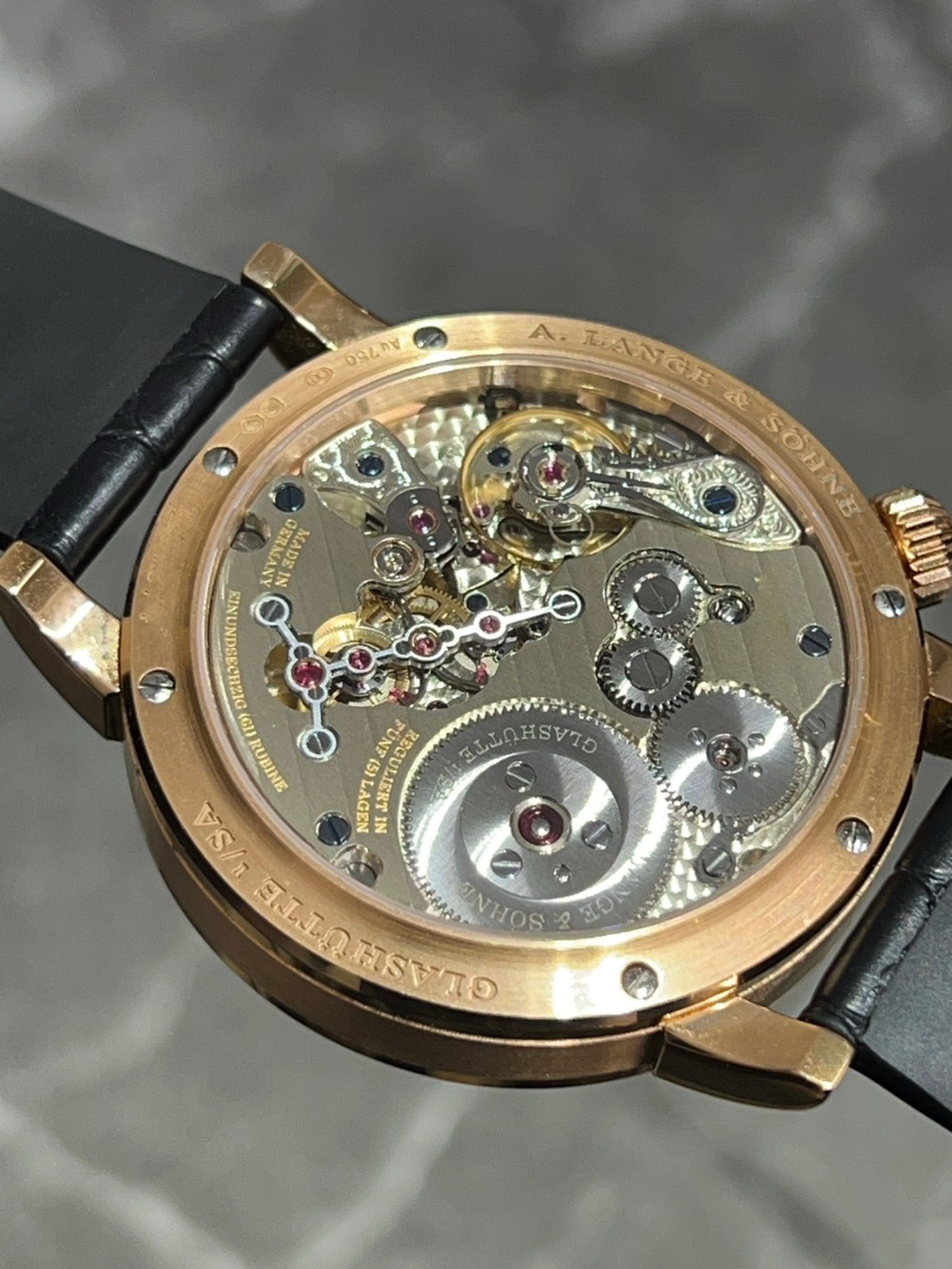 ドイツ時計らしくケース径も大きく厚みもありランゲらしく美しい装飾で表から見ても裏から見ても美しいです。