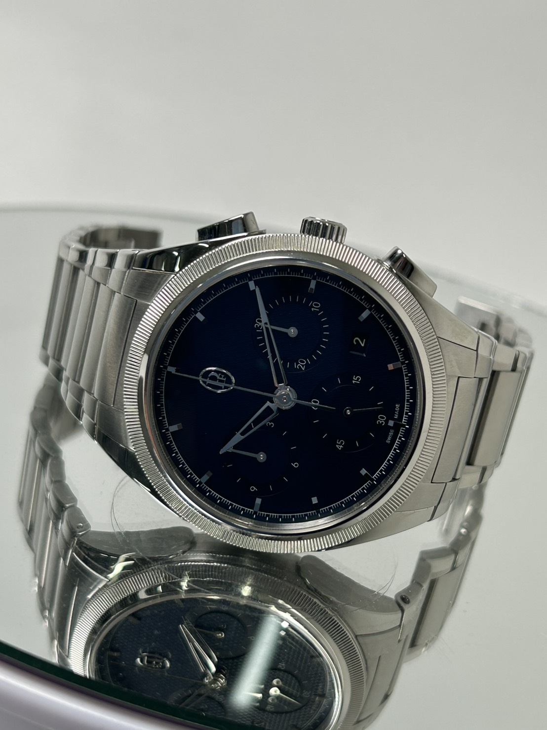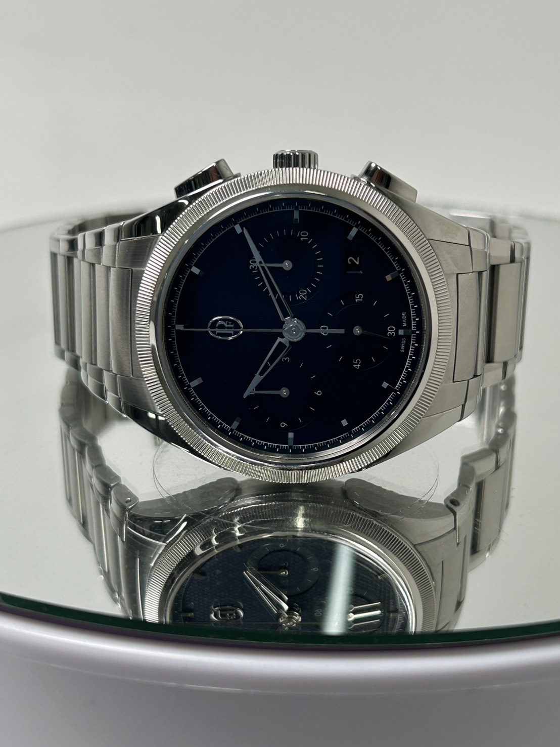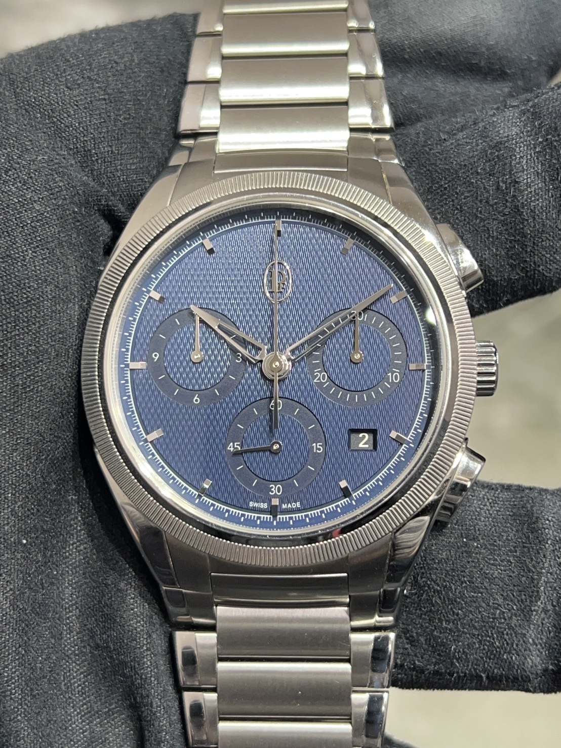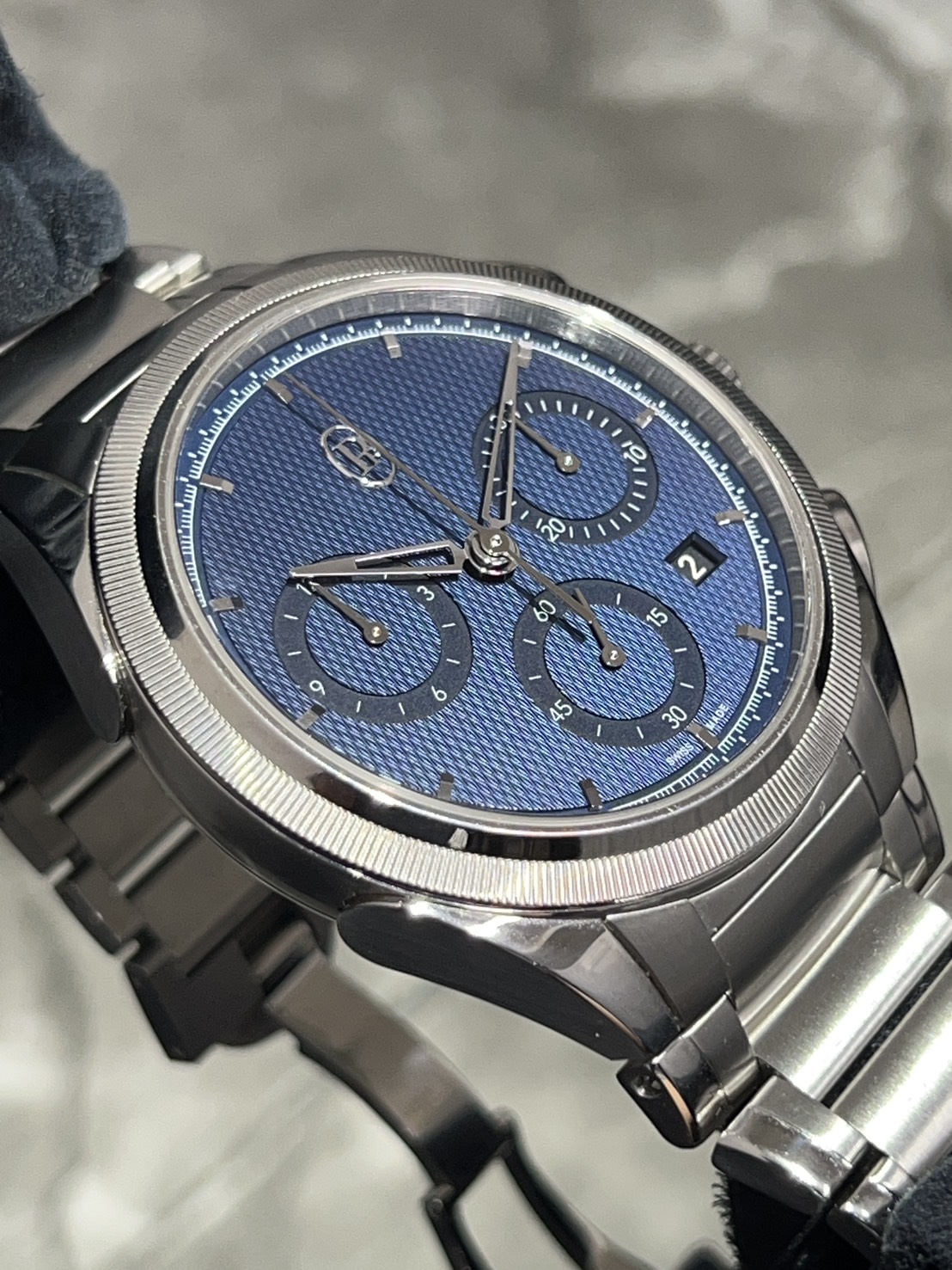 クロノグラフ機構を備えながらケースの厚みが12.40㎜と比較的整ったサイズ感でしなやかなブレスが腕に巻き付き装着感が抜群でございます。