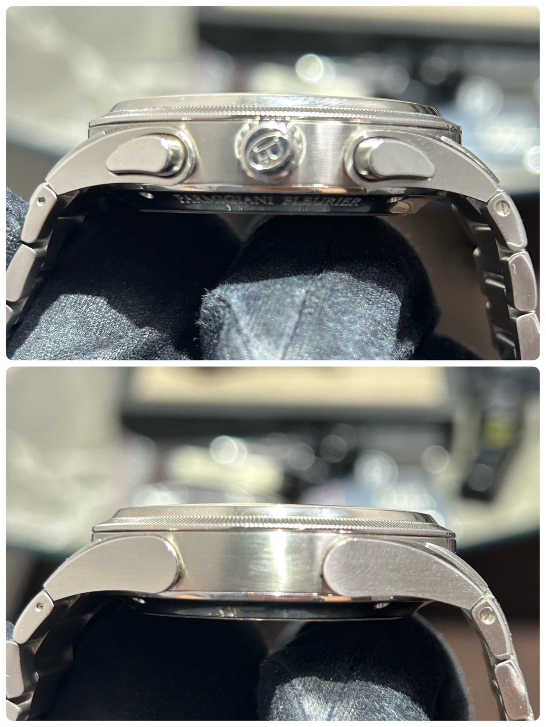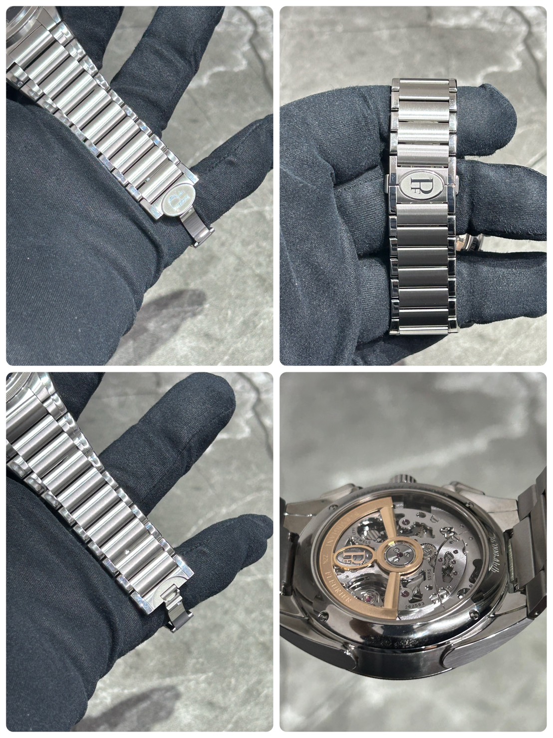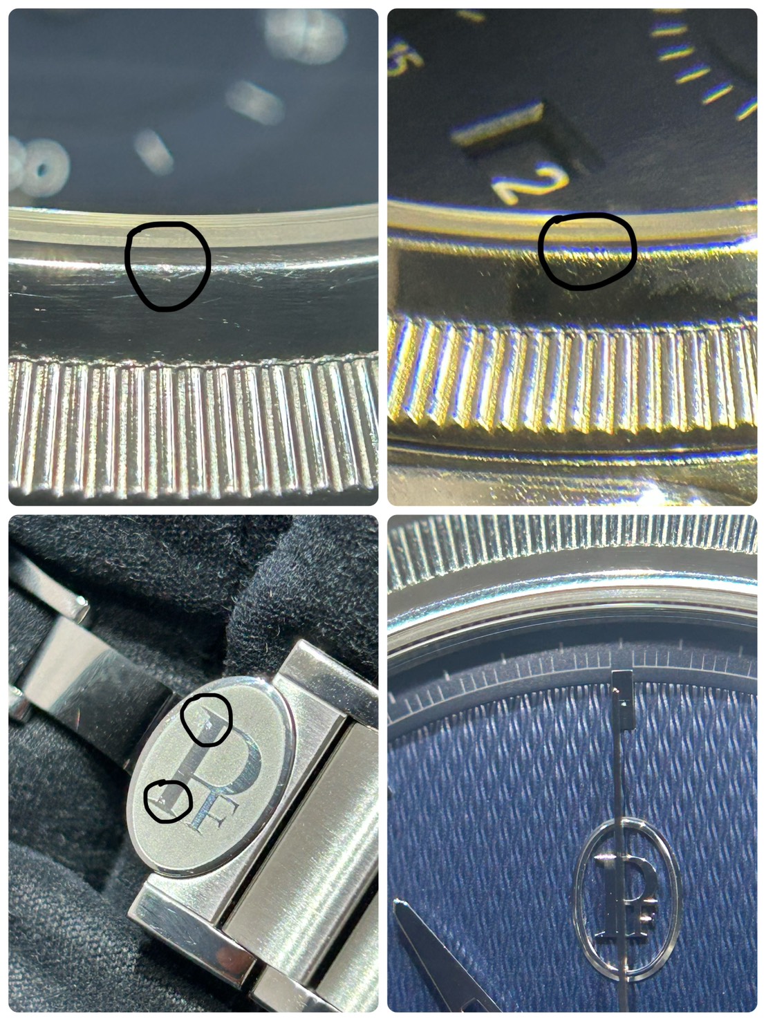 全体的にご愛用に伴う微細なスレ、あまり目立たないのですがベゼルに細かい極小の打痕や小傷が見受けられます、バックル開閉時についたと思われる小傷が確認できます(最後の写真参照)が目立つレベルの傷ではなく全体的に綺麗な印象を受けます。
