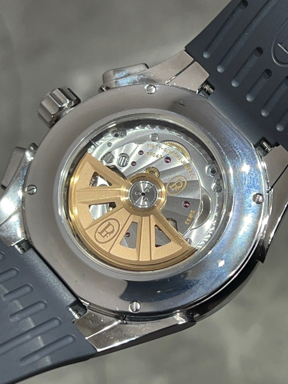 アイボリー色に近い大変柔らかい色彩のシルバー文字盤に淡い色彩のクアンタムグレーのインダイヤルが組み合わさって非常に柔らかい印象を受けるモデルでございます。