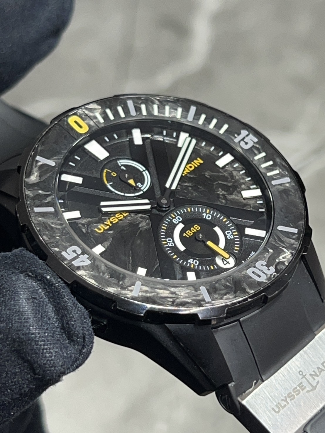 1846年にスイスのル・ロックルで創業した高級時計ブランドのユリスナルダン、今回はブラックPVD加工ケースにカーボンベゼルに文字盤、差し色にイエローを採用した同社の人気モデル、ダイバーX44㎜ ケープホーンが入荷致しました。