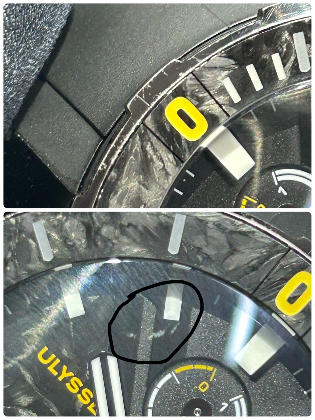 全体的にご愛用に伴うスレ、小傷が確認できます。中止するとベゼルに小傷や極小の打痕、ガラスにスレ傷が確認できます(最後の写真参照)ので予めご承知おきくださいませ。