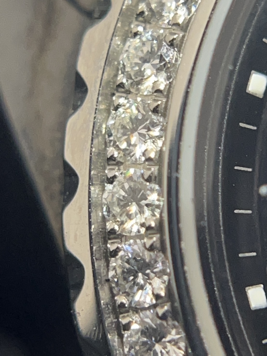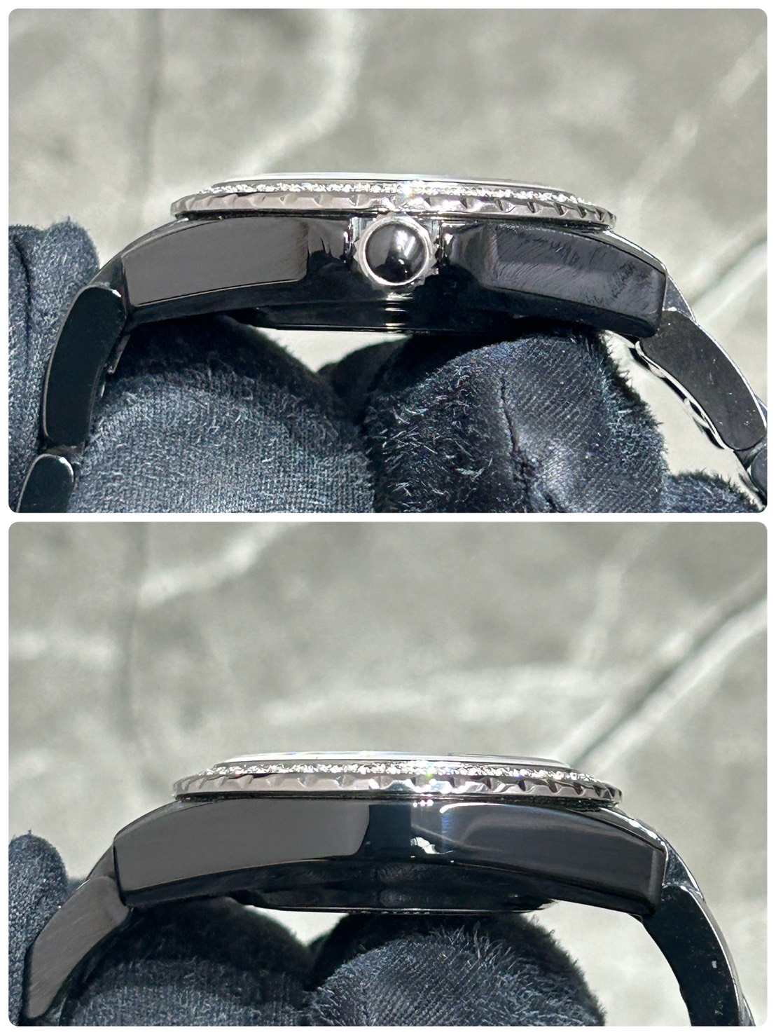 全体的にご愛用にご愛用に伴う微細なスレが確認できます。ベゼルのギザギザ部分にルーペ等で見ると確認できる極小の打痕等はございますがセラミック素材という事もあり大きな傷はない印象です。