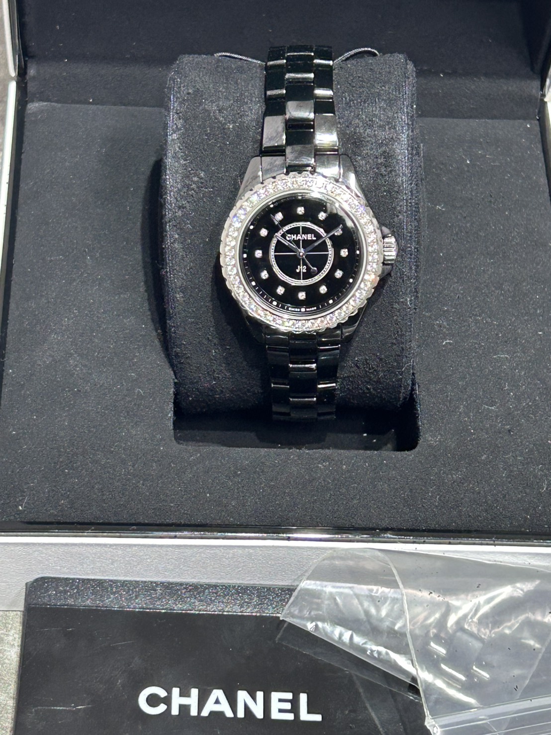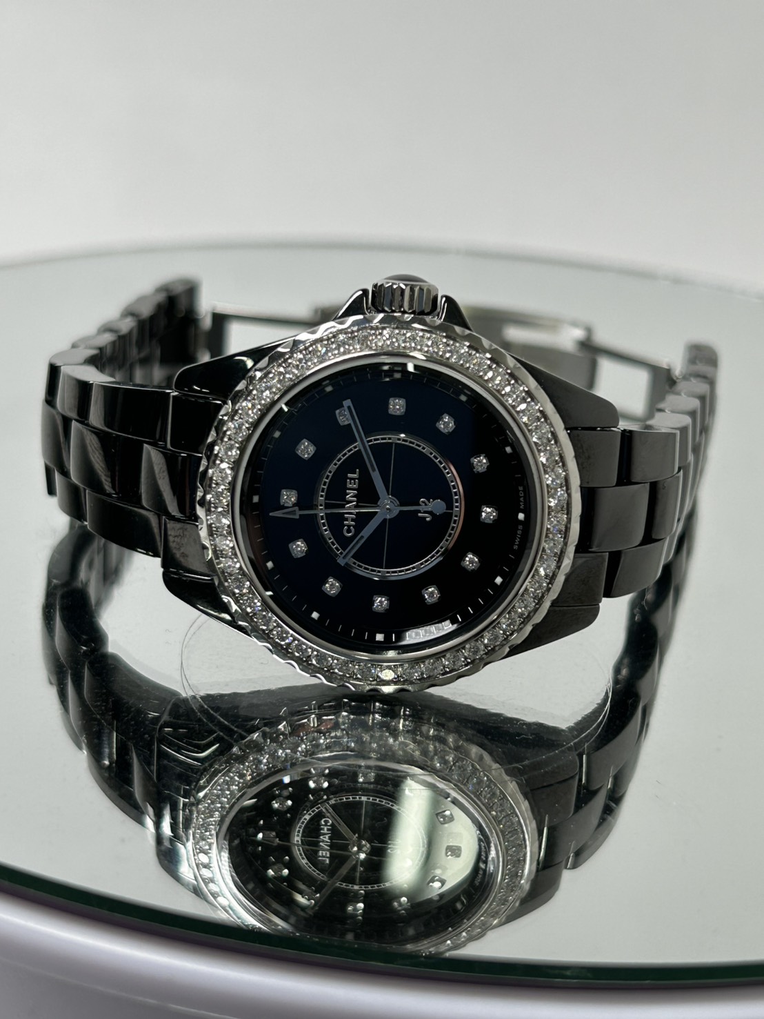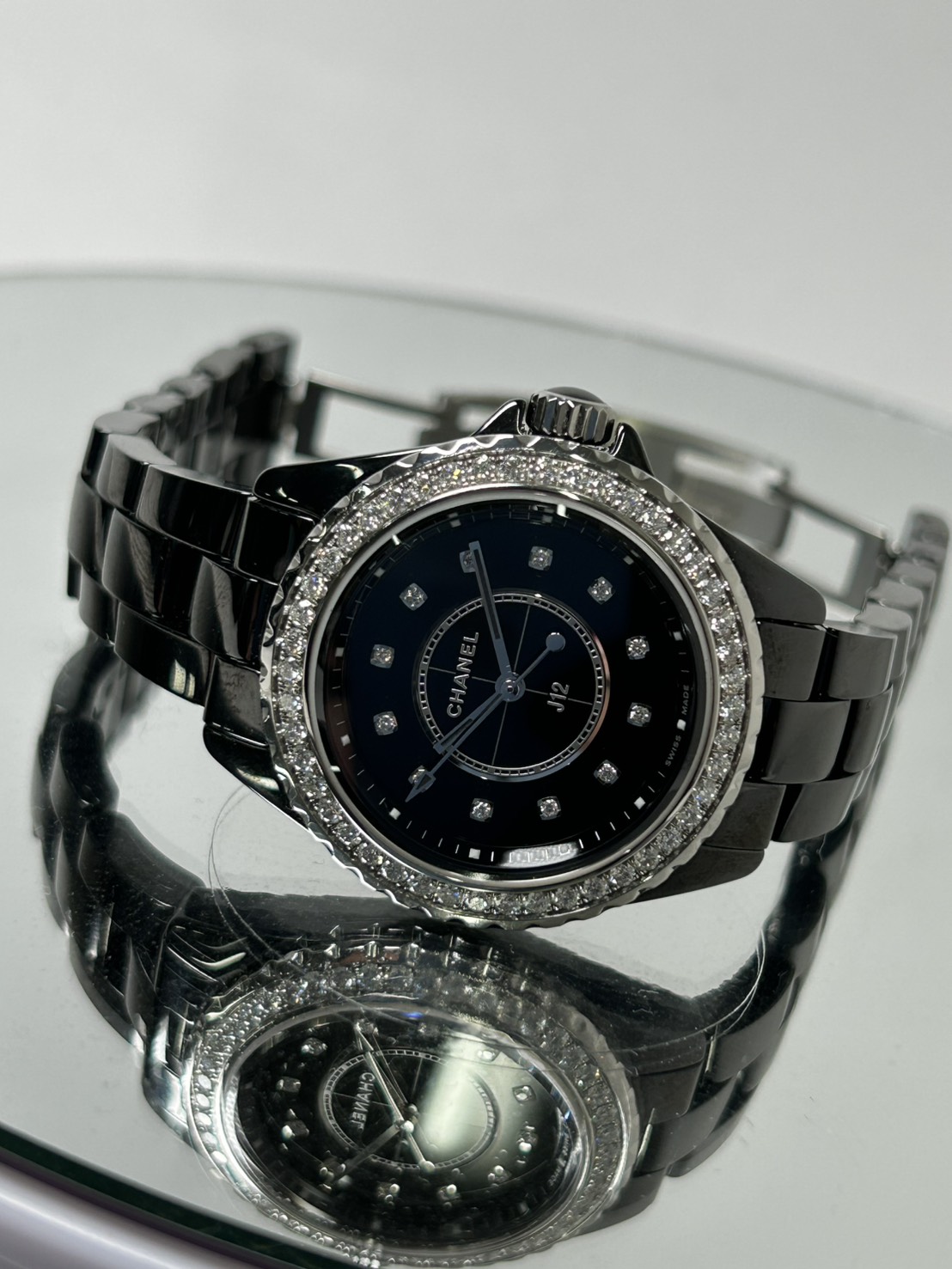 ベゼルに46個のダイヤモンド(約1.21ct)やインデックスに12個のダイヤモンド(約0.06ct)セラミックケースの光沢に美しいブラックラッカーダイヤルがスタイリッシュなレディースモデルでございます。