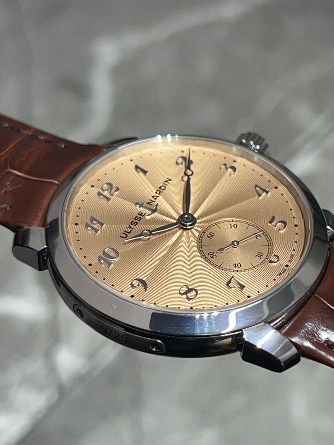 クラシックなデザインとモダンな色彩、ユリスナルダンのドレスウオッチ!こちらはサーモンカラーのギョシェ装飾入り文字盤にブレゲ数字にブレゲ針、アワーグラスジャパン25周年記念限定モデルが入荷致しました。