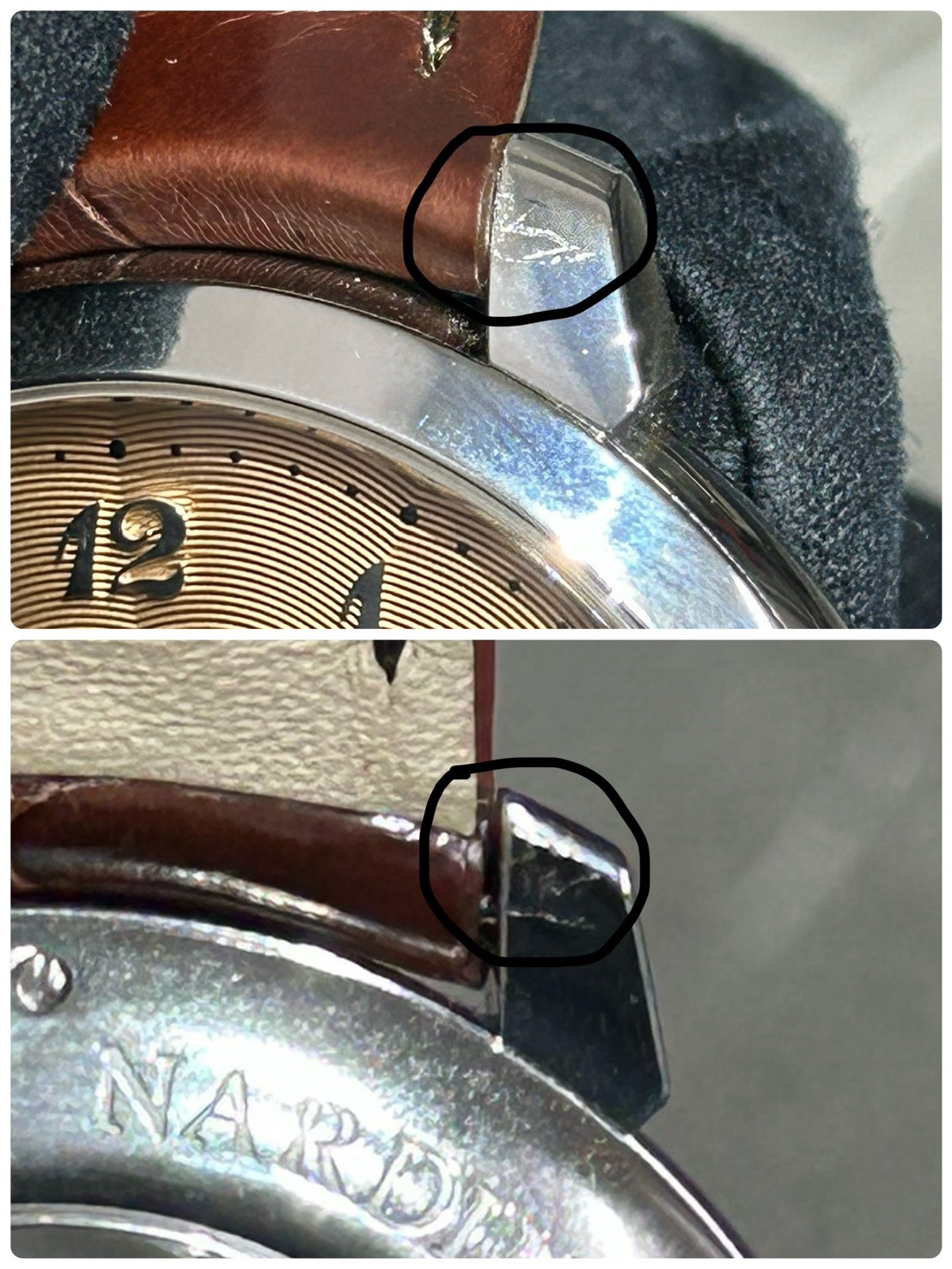 1時側ラグにベルト交換の際に付いたと思われる傷があり11時側、7時側ラグにも小傷が確認できますがスレは少な印象で、全体的にはコンディションの良い個体になります。