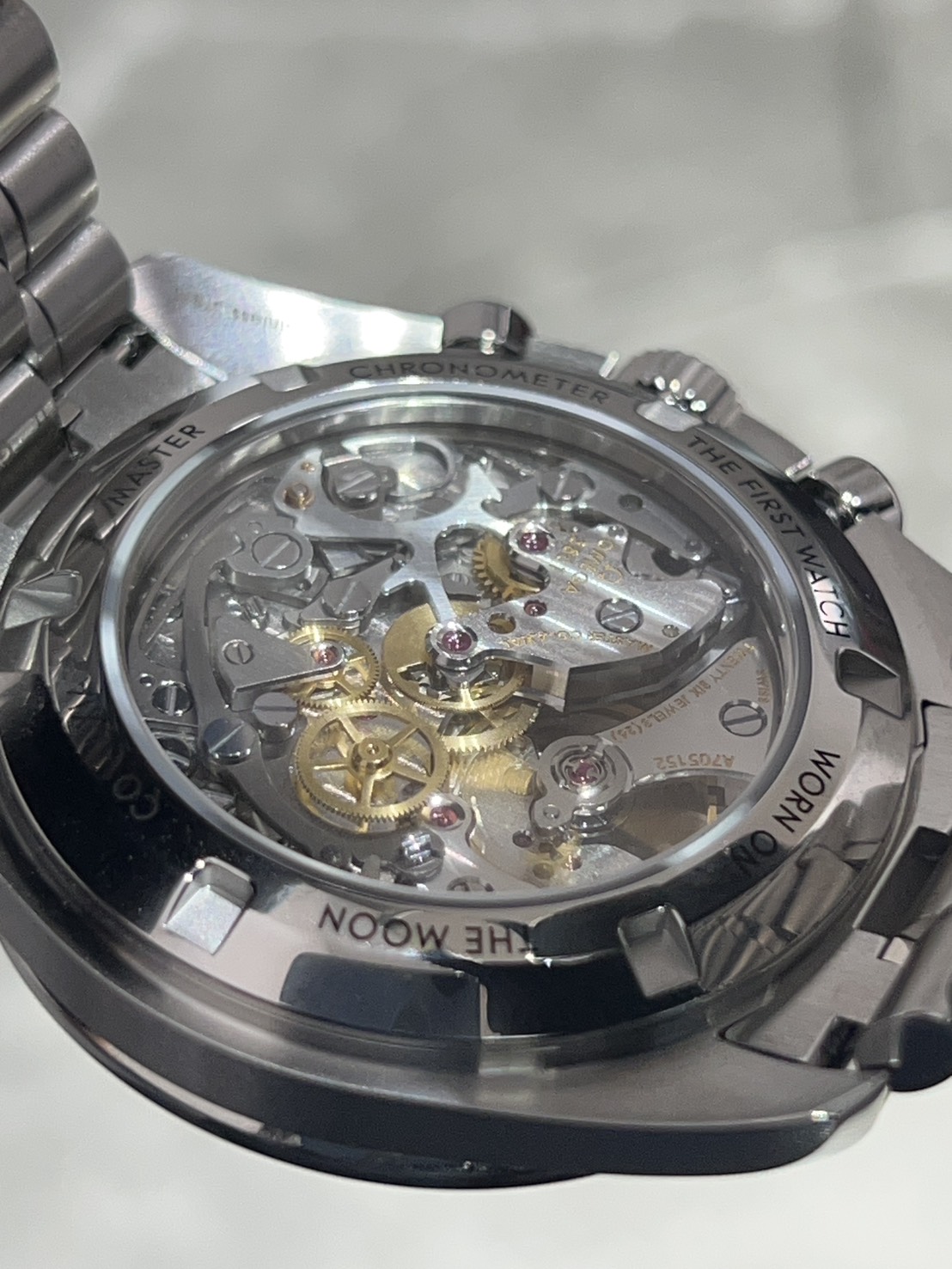 アプライドのオメガロゴ、インデックスで高級感がありブラックのベゼルは陽極酸化処理を施したアルミニウム製でスポーティな印象で裏蓋からは超高耐磁性能をもつcal.3861の美しい装飾がご覧になれます。
