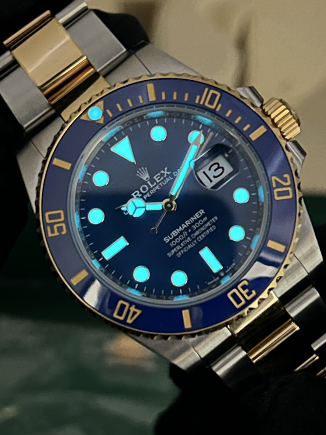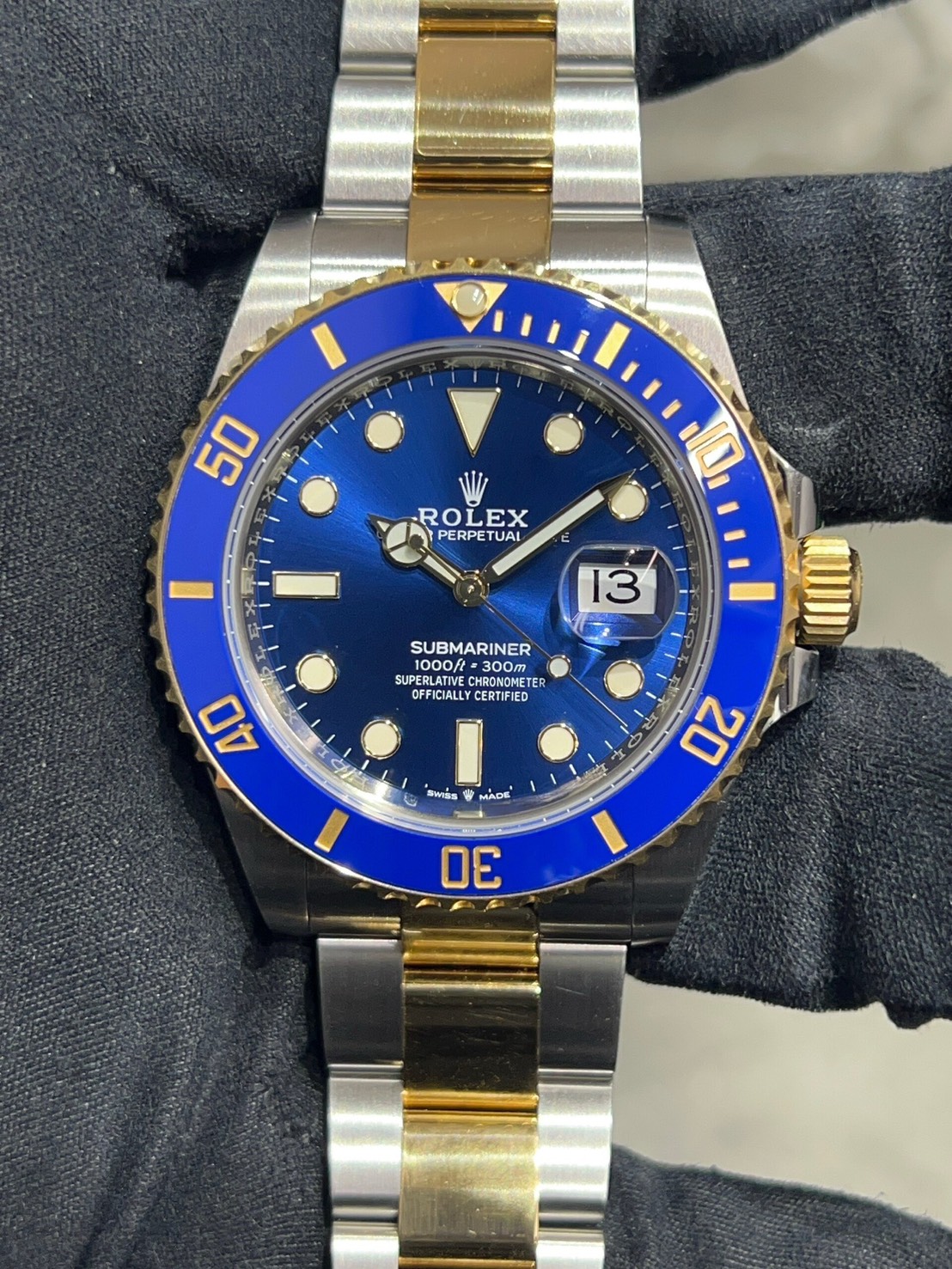 ロレックスのサブマリーナー・デイトのダイアルやベゼルが青色のモデル、通称青サブが入荷致しました。