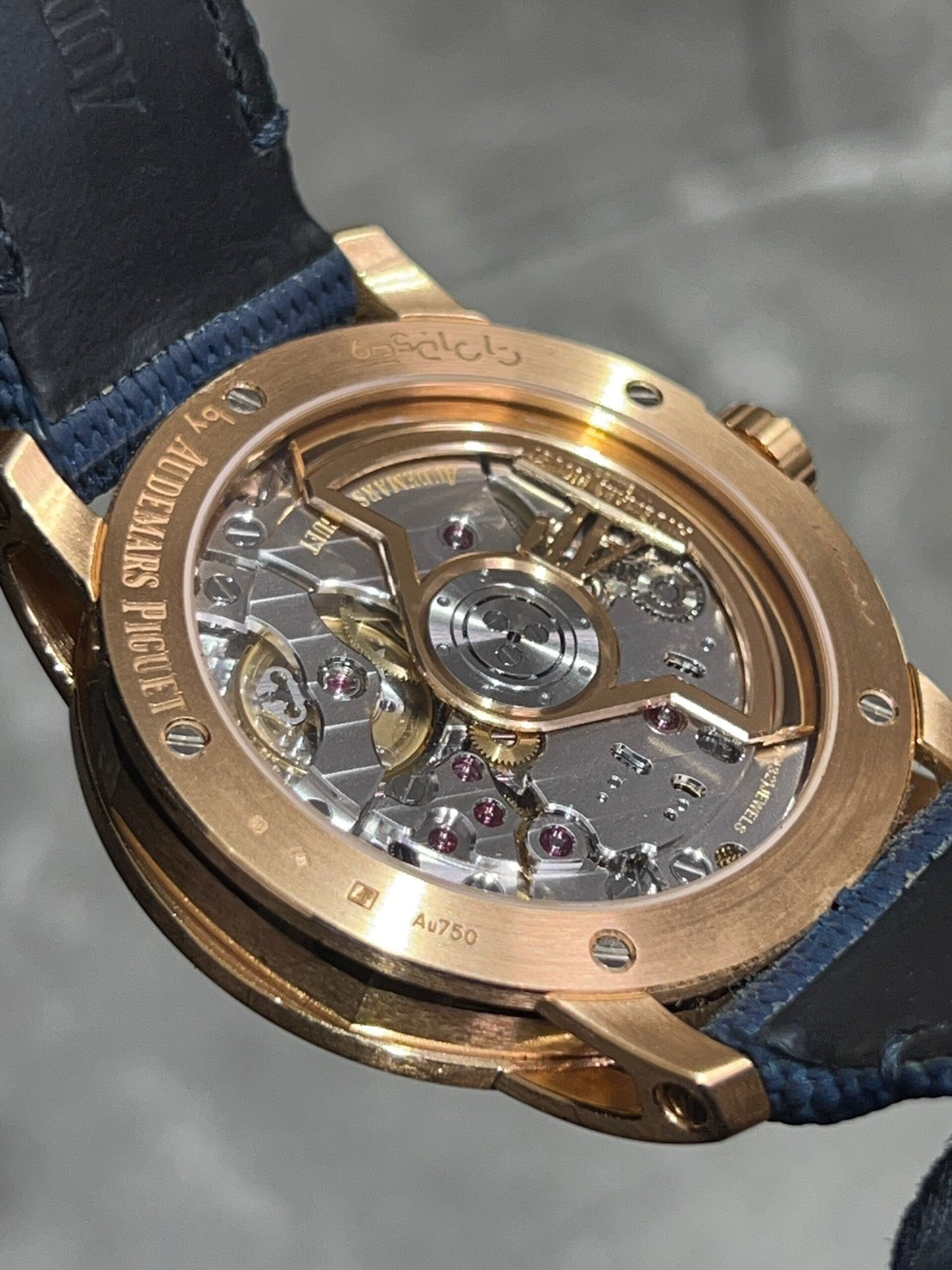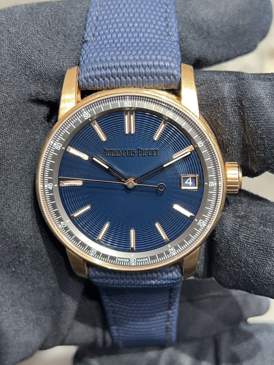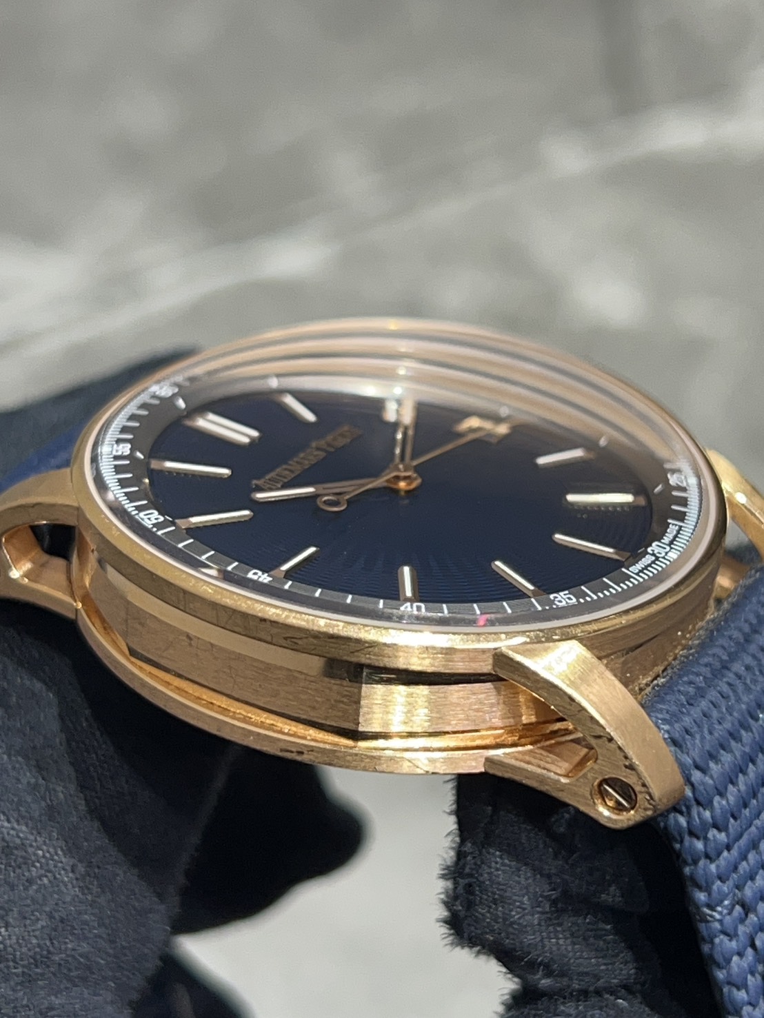 こちらのモデルは2024年新作で同心円状のスタンプ加工が施された美しいナイトブルー、ロイヤルオーク等でおなじみのクラウド50文字盤にピンクゴールドのケース、そしてインデックスや針のピンクゴールドが強い色気を醸す装飾でございます。