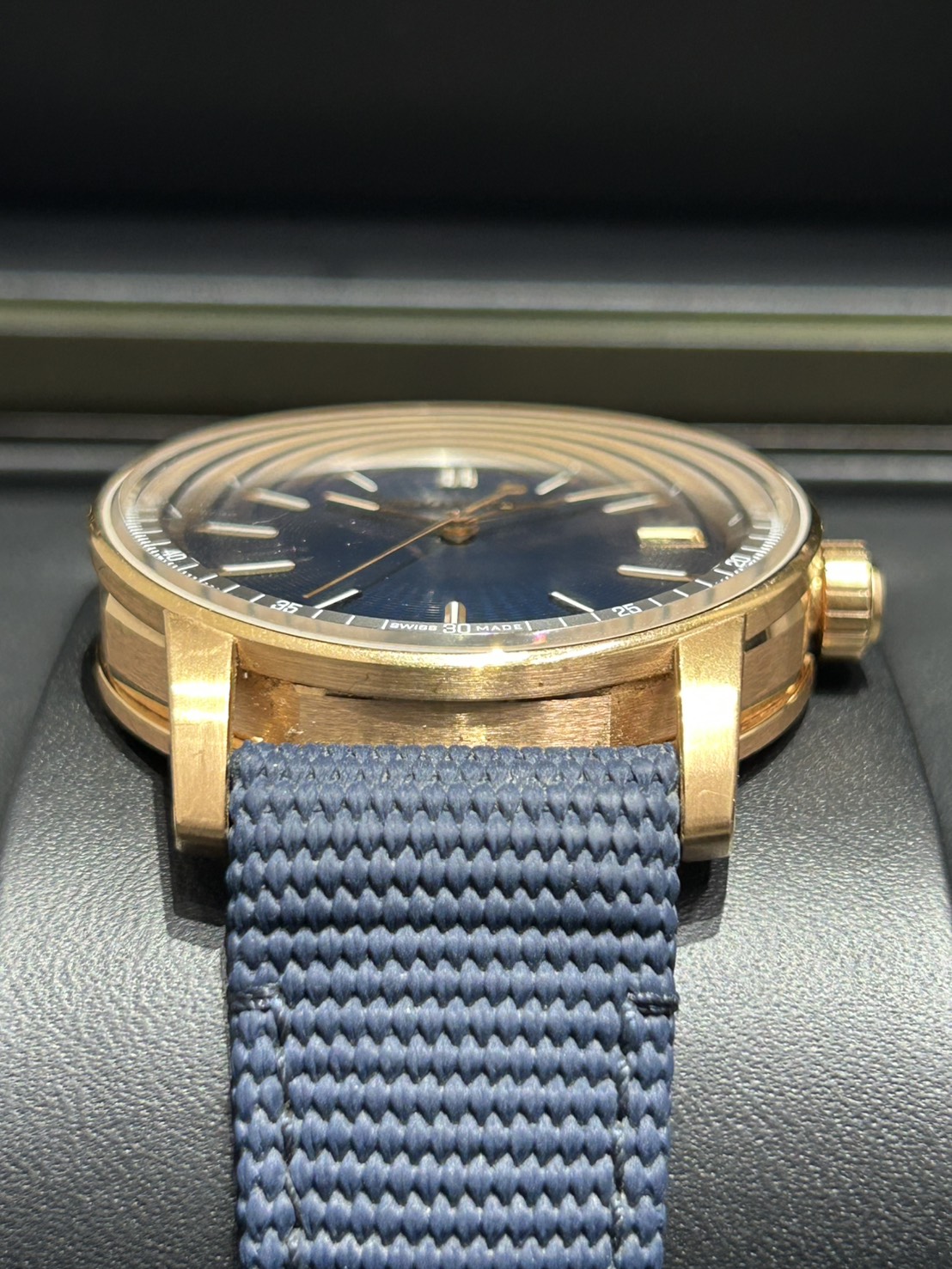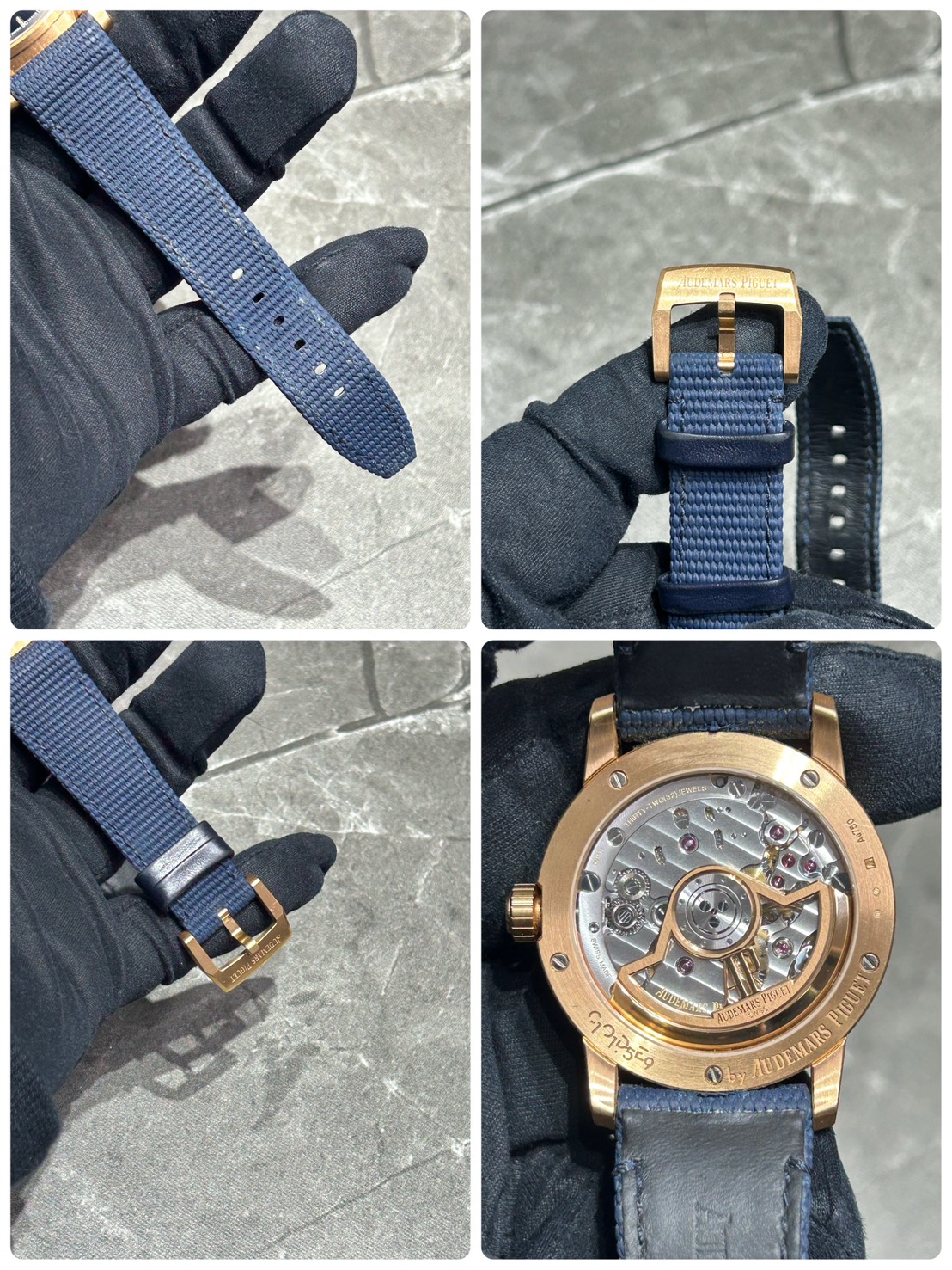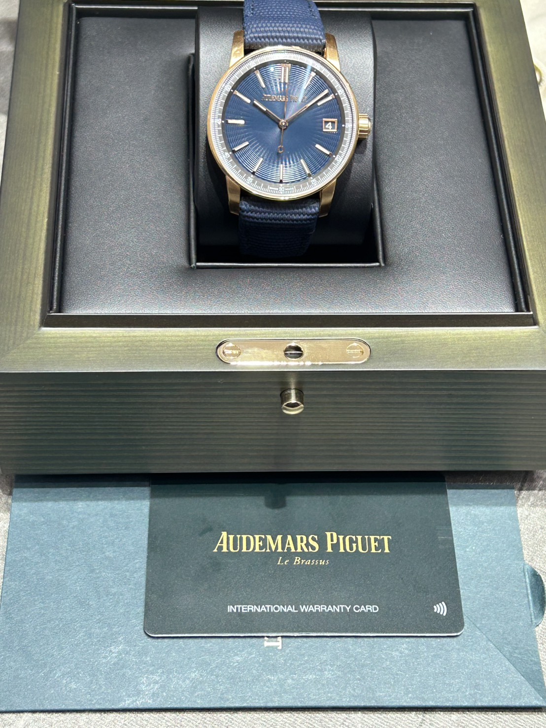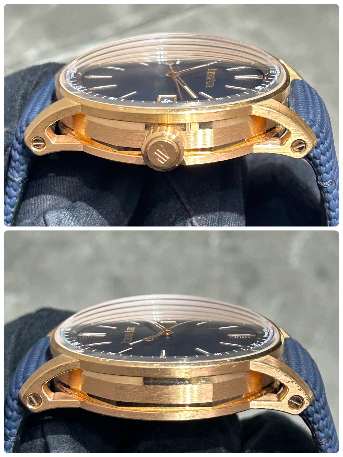こちらのモデルは2024年新作で同心円状のスタンプ加工が施された美しいナイトブルー、ロイヤルオーク等でおなじみのクラウド50文字盤にピンクゴールドのケース、そしてインデックスや針のピンクゴールドが強い色気を醸す装飾でございます。