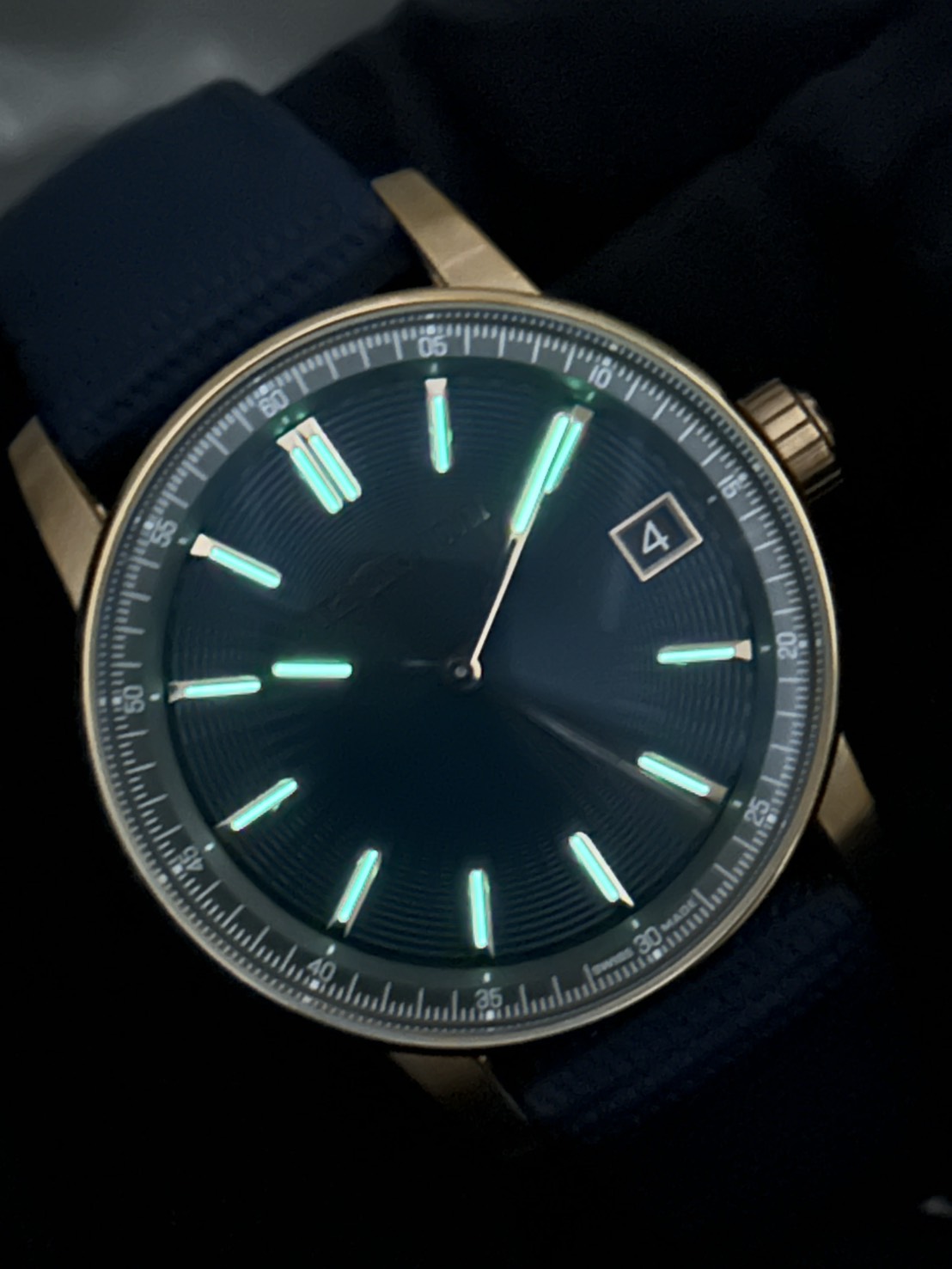 こちら、ここまでドレッシーな雰囲気でありながらインデックスに蓄光処理が施されてる等スポーティーな要素もございますので様々なシーンでご愛用頂けるモデルでございます。