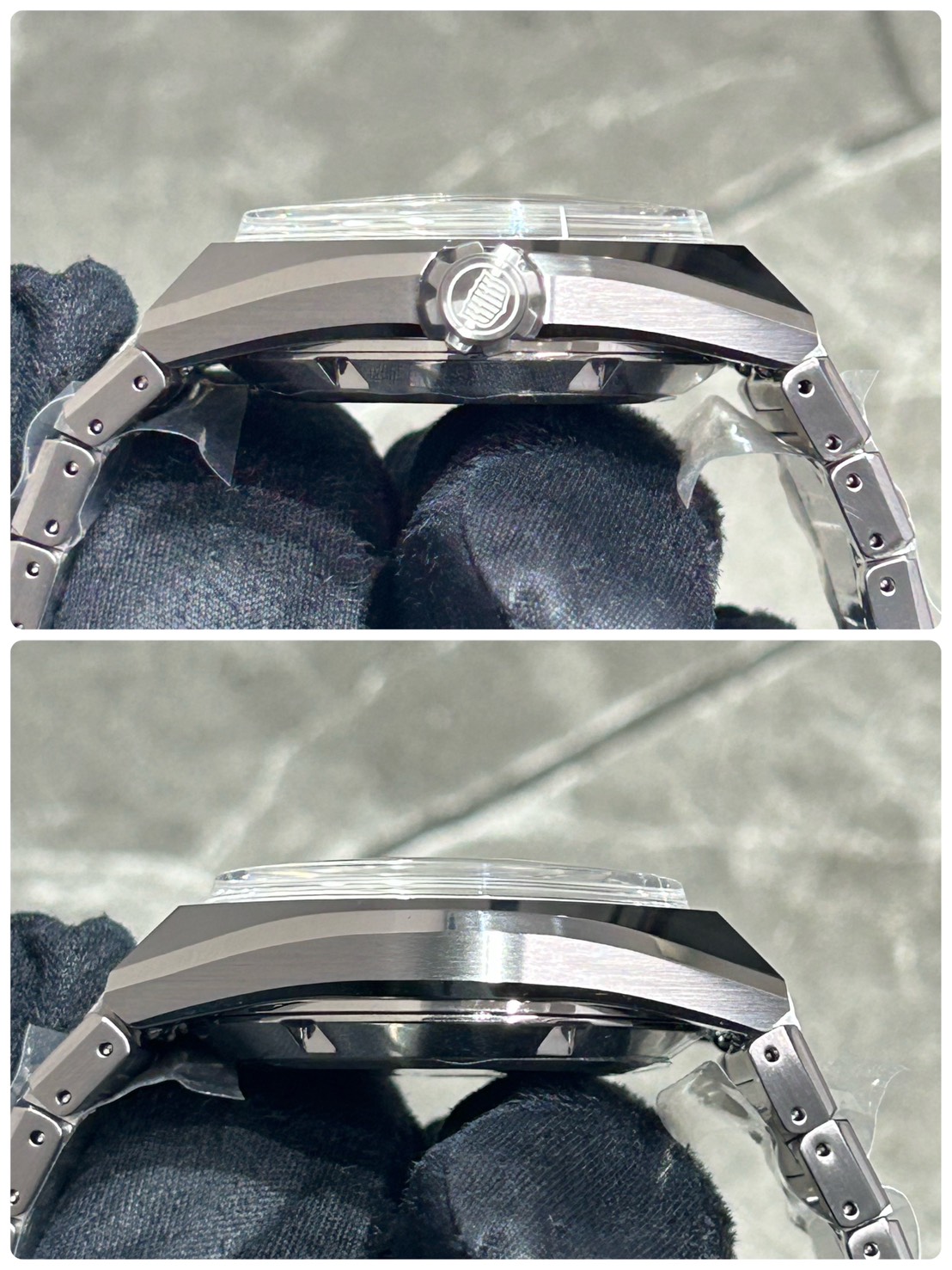 ケースはダイヤモンドカットを彷彿させるエッジのきいた41㎜ケースとなっており文字盤はゴールドのラインがアクセントとなり、存在感のあるフォルムでございます。