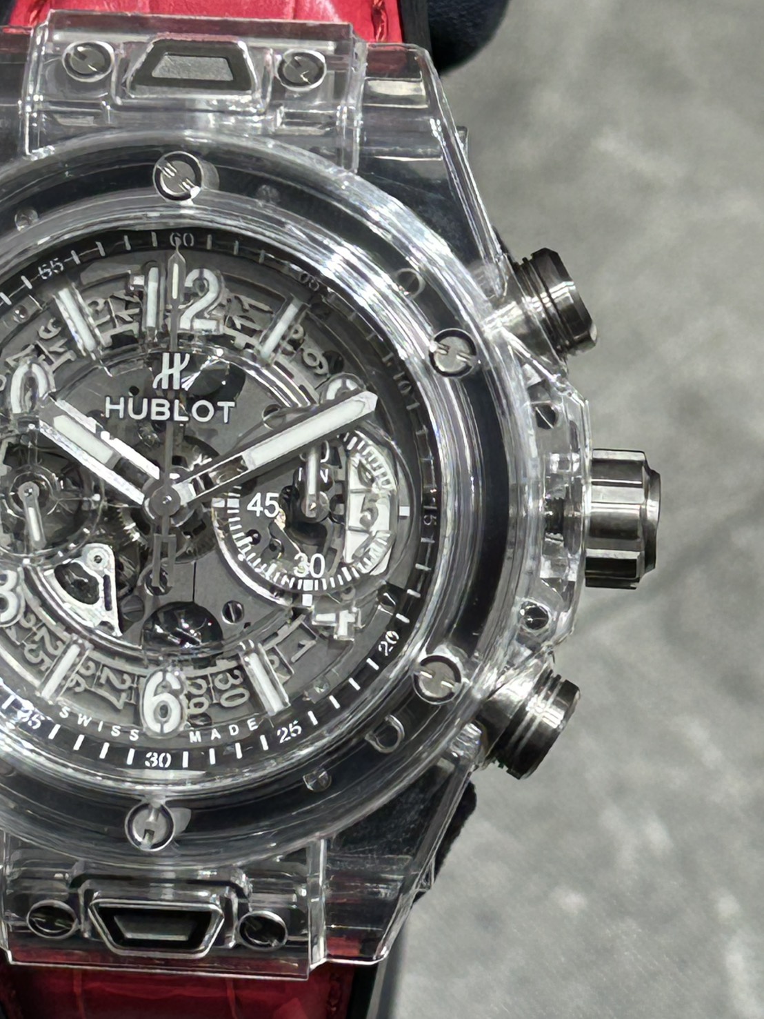 ウブロ、ビッグ・バン ウニコ サファイア、とてつもないインパクトを放つこちらのモデルはケース全体がサファイアクリスタルで構成されておりスケルトンダイヤルも相まってウニコキャリバーを余すことなくご覧になれる限定モデルになっております。