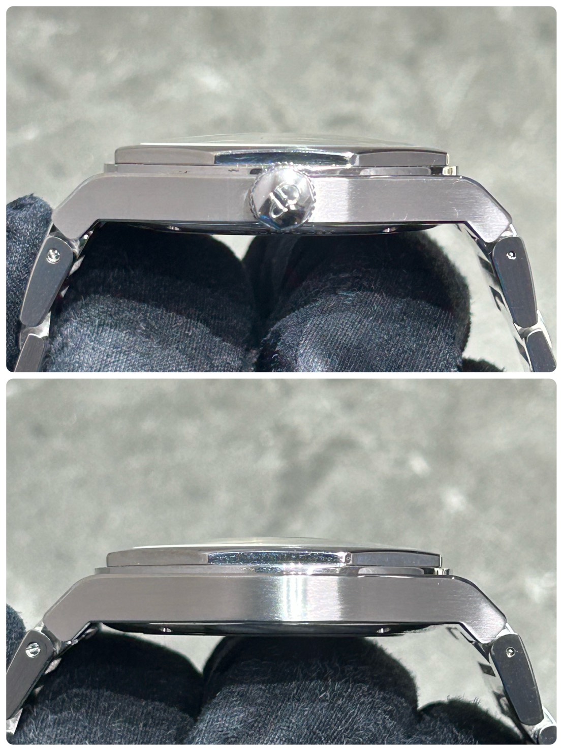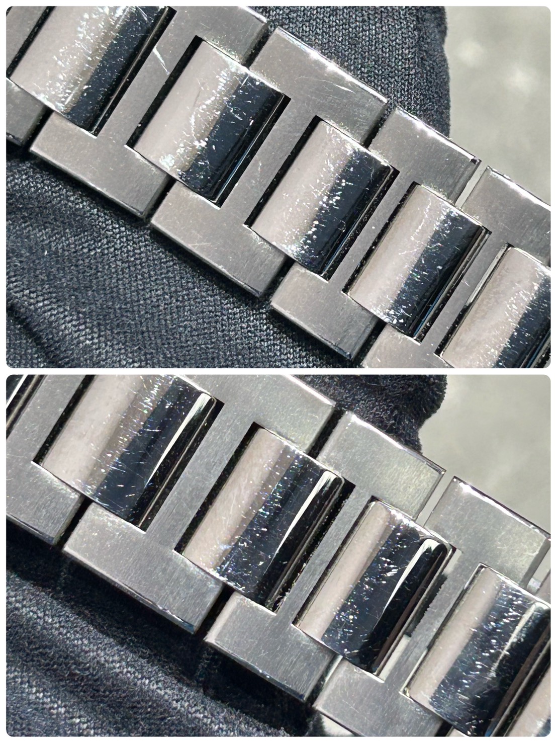 全体的にご愛用に伴うスレ傷が確認できます。強い光に当てるとブレスの鏡面部分等にスレ傷が少々目立ちますが深い傷ではない印象でございます。
