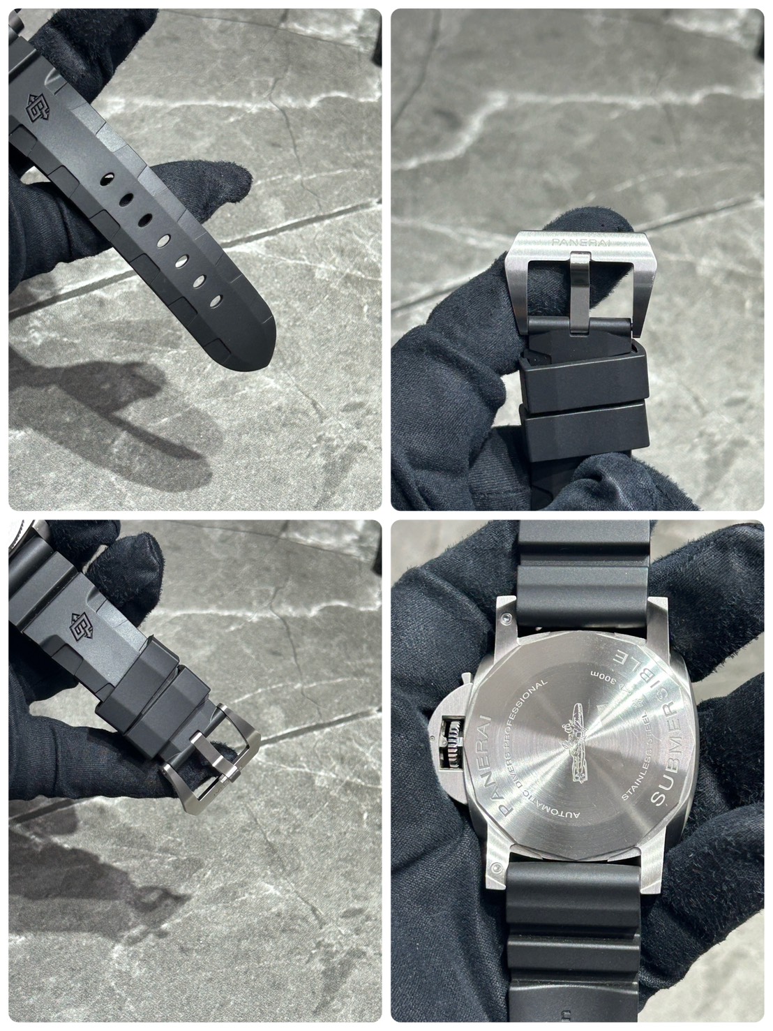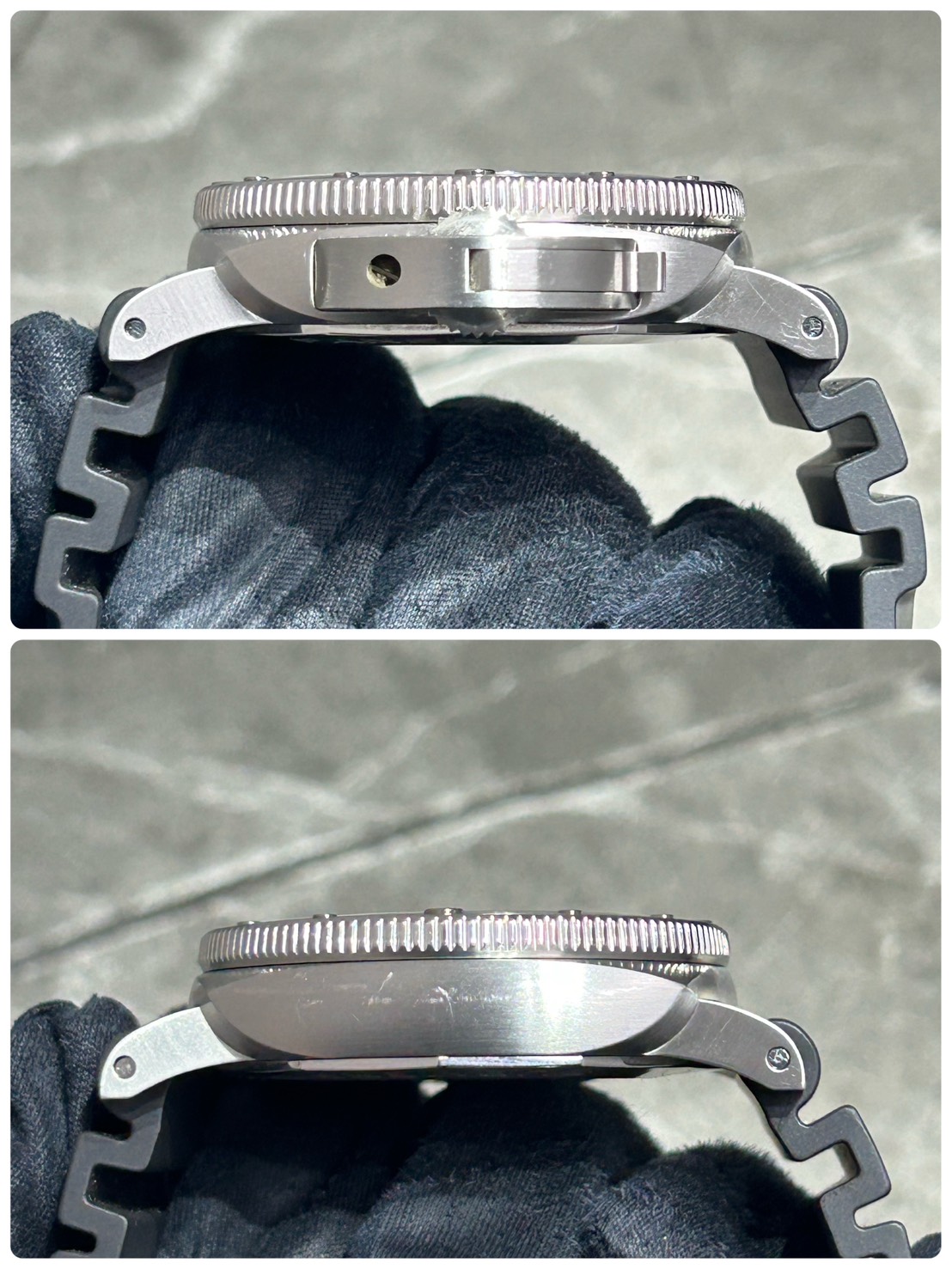 44㎜のステンレススティールケースに300m防水を備えた本格ダイバーズとなっており、パネライの象徴でもあるレバーロック式リュウズプロテクターと逆回転防止ベゼルは、視覚的な迫力と操作性の両面で優れております。